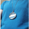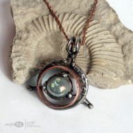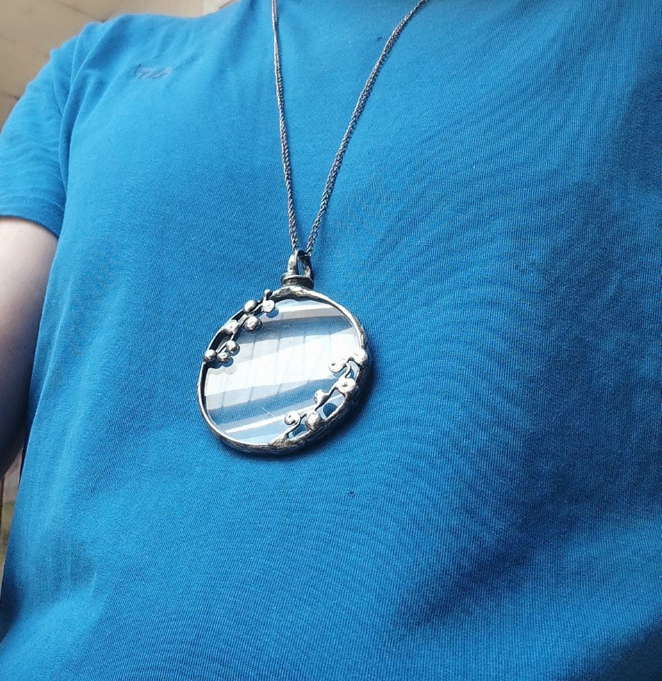 Lupa z rączką średnicy 6 cm oprawiona w miedź lutowaną stopem cyny i srebra. Całość patynowana na kolor starego srebra ręcznie przecierana i polerowana , zawieszona na 60 cm łańcuszku. Jeśli życzą sobie Państwo inną dowolną długość łańcuszka proszę o informacje mailową po zakupie a bez problemu to zmienię. Zapraszam do zakupu