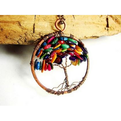 Mam przyjemność zaprezentować Państwu autorski wisior wykonany w całości ręcznie z kutej na gorąco miedzi oraz kamyczków naturalnej masy perłowej. Wisior ma średnicę 5,5 cm i zawieszony jest na 50 cm patynowanym miedzianym łańcuszku. Zapraszam do kupna.