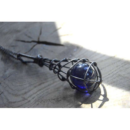 Granatowa kula w klatce - antyczny witrażowy wisior.