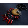 Mam przyjemność zaproponować Państwu autorski wisior wykonany w technice Tiffany z okrągłego 4 cm brązowego jaspisu ozdabianego drobinkami naturalnego czerwonego korala oraz koralowymi pazurami. Wymiary wisiorka wynoszą 7 x 10,5 cm.