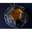 Autorski wisior wykonany według mojego projektu w witrażowym stylu tiffany z doskonale mieniących się miodowych szklanych kaboszonów o średnicy 3 cm oraz 1,8 cm oraz 16 mm kuli brązowej lawy wulkanicznej. Wisior oksydowany na kolor starego srebra ręcznie polerowany całość zawieszona na 50 cm łańcuszku w kolorze starego srebra z zapięciem ze srebra próby 930. Lutowany przy użyciu witrażowego stopu cyny i srebra Średnica wisiora wynosi 6 cm.