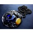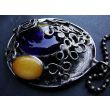 Autorski wisior wykonany według mojego projektu w witrażowym stylu tiffany z okrągłego 3 cm szklanego granatowego kaboszonu owalnego 2 cm bursztynowego nefrytu oraz miedzi lutowanej przy użyciu witrażowego stopu cyny i srebra.Wisior oksydowany na kolor starego srebra ręcznie polerowany całość zawieszona na 50 cm łańcuszku w kolorze starego srebra z zapięciem ze srebra próby 930. Średnica wisiora wynosi 6 cm.