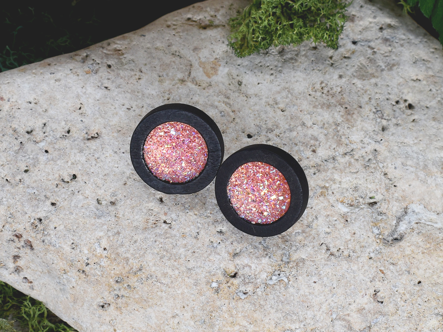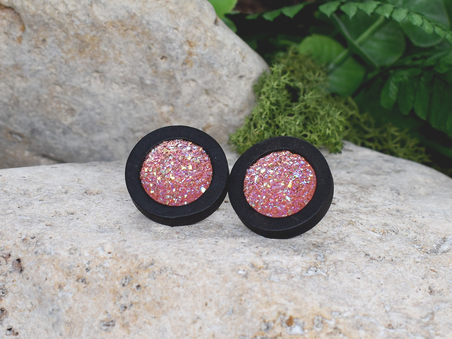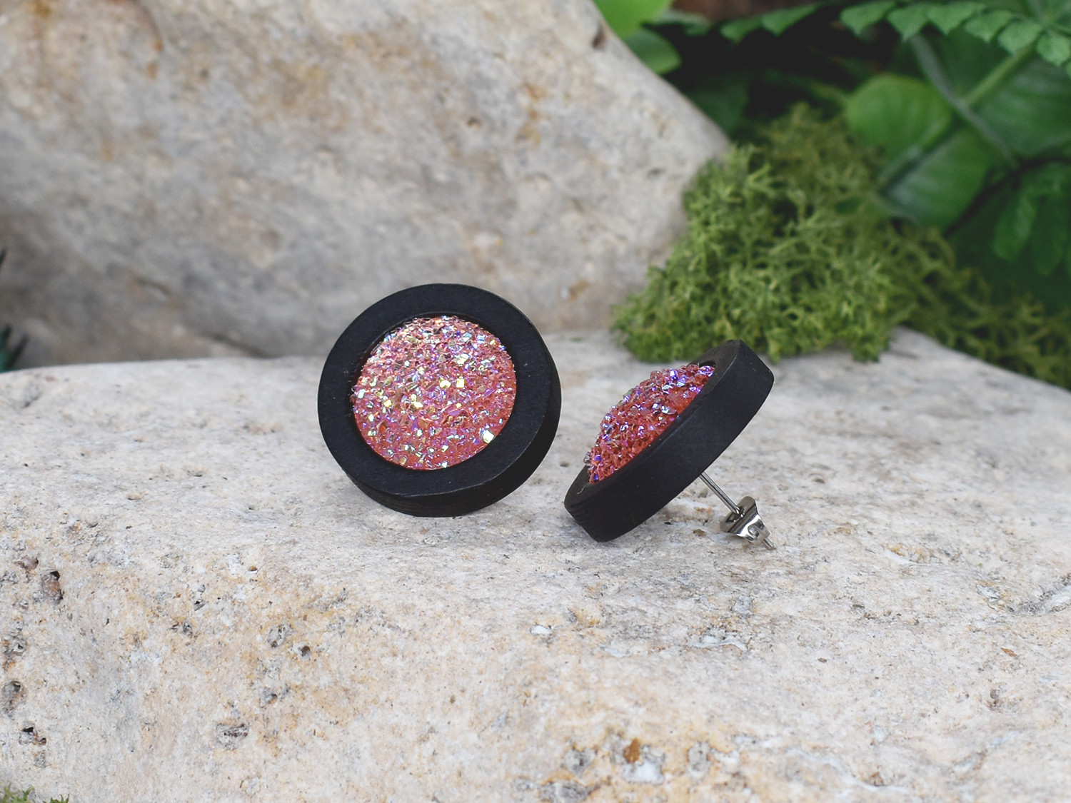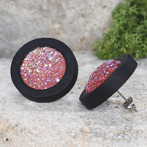 Drewniane czarne kolczyki sztyfty z druzami boho #21
