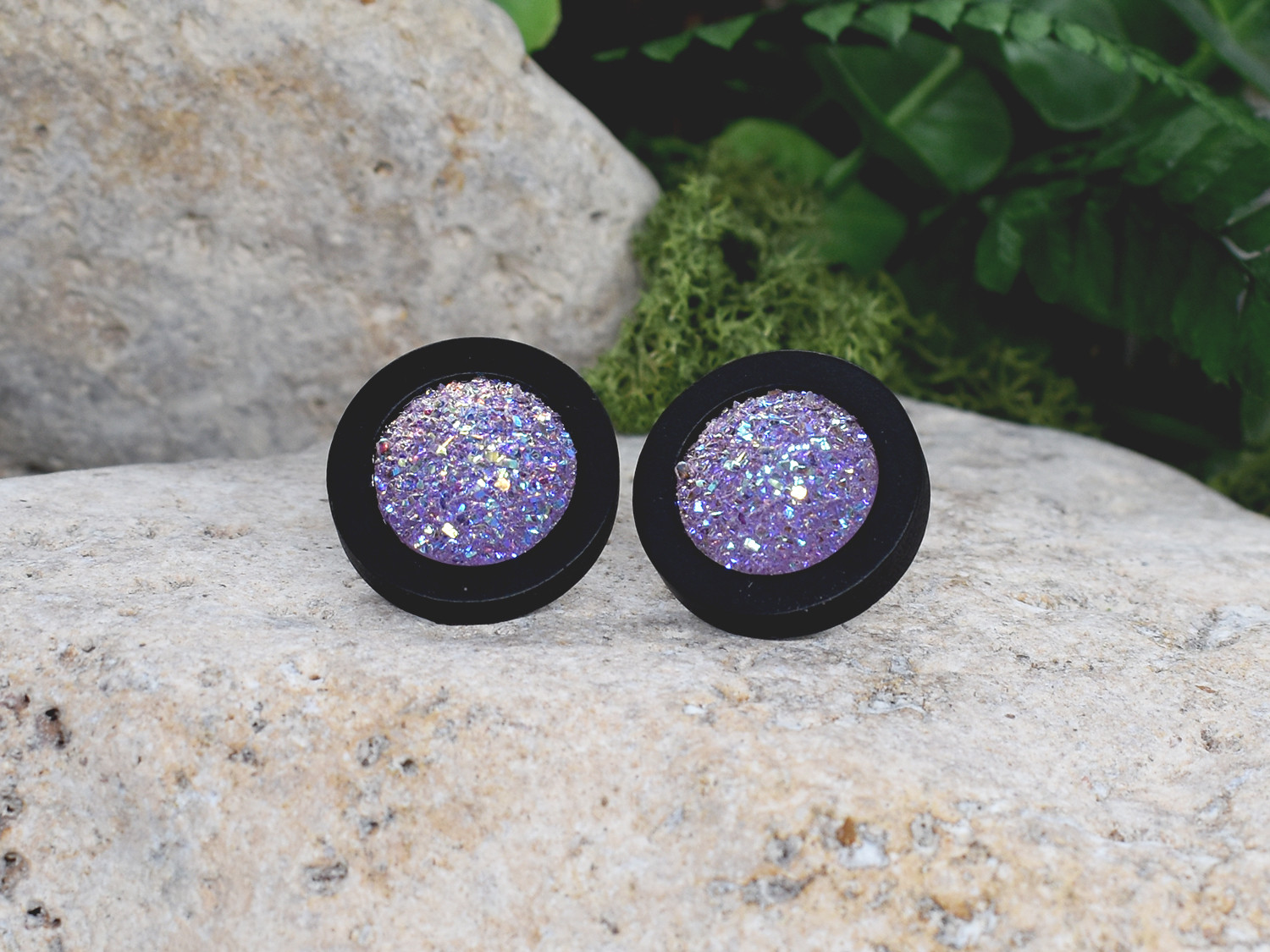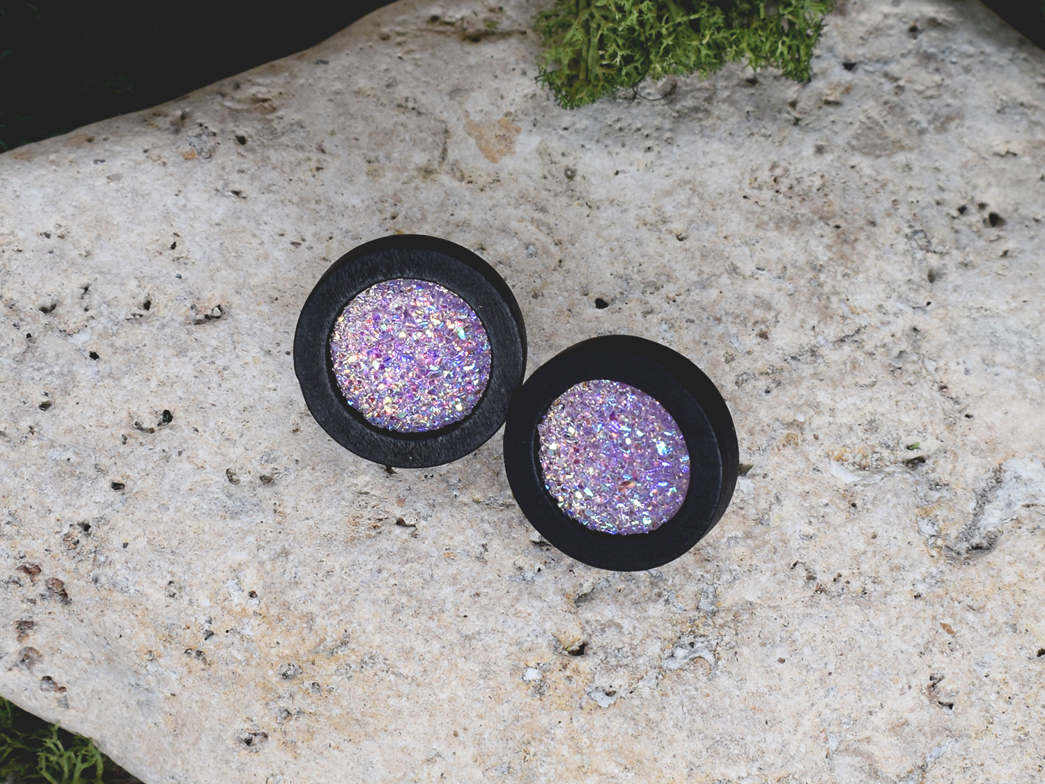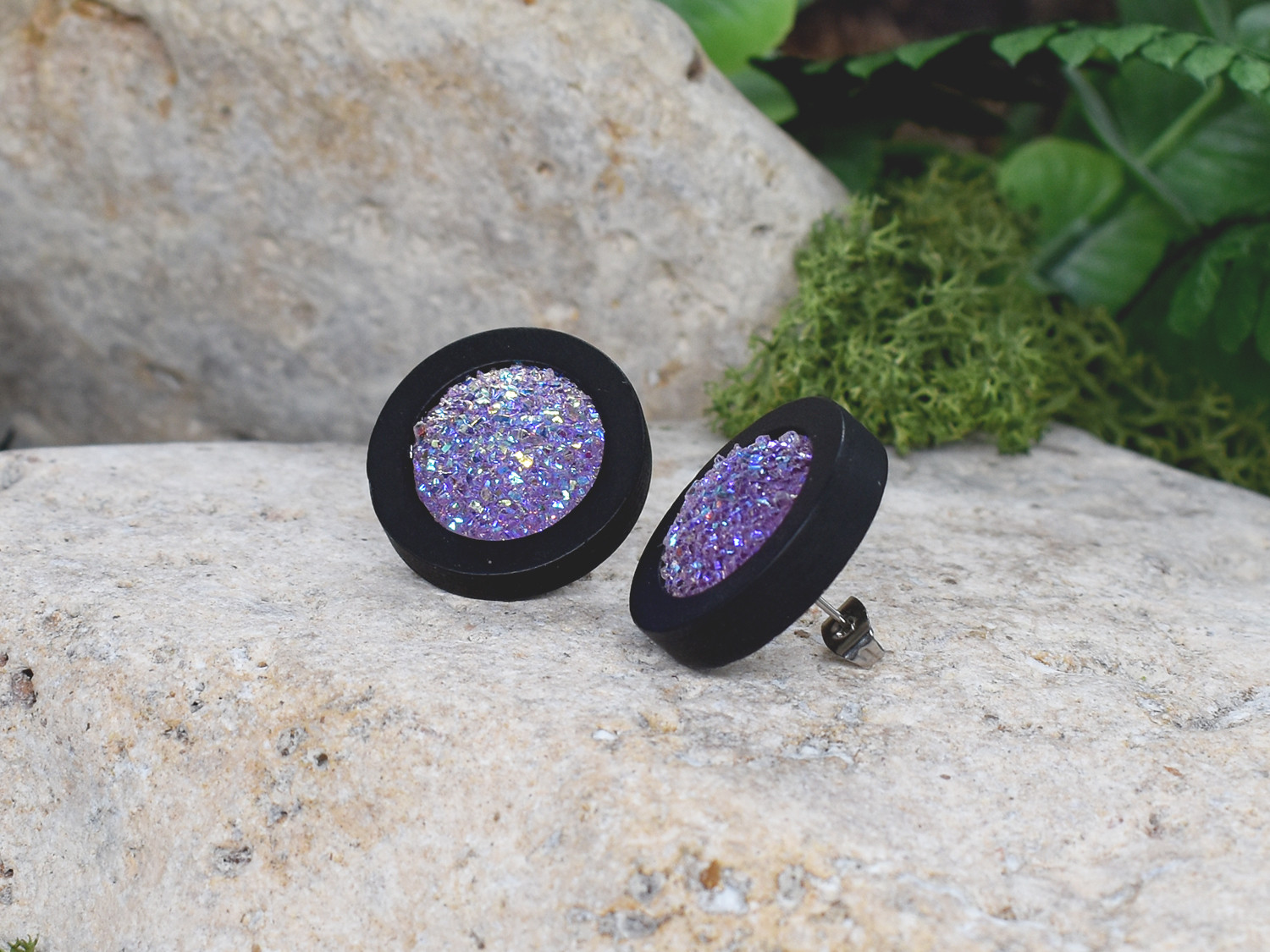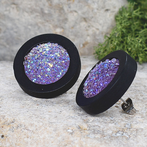 Drewniane czarne kolczyki sztyfty z druzami boho #23
