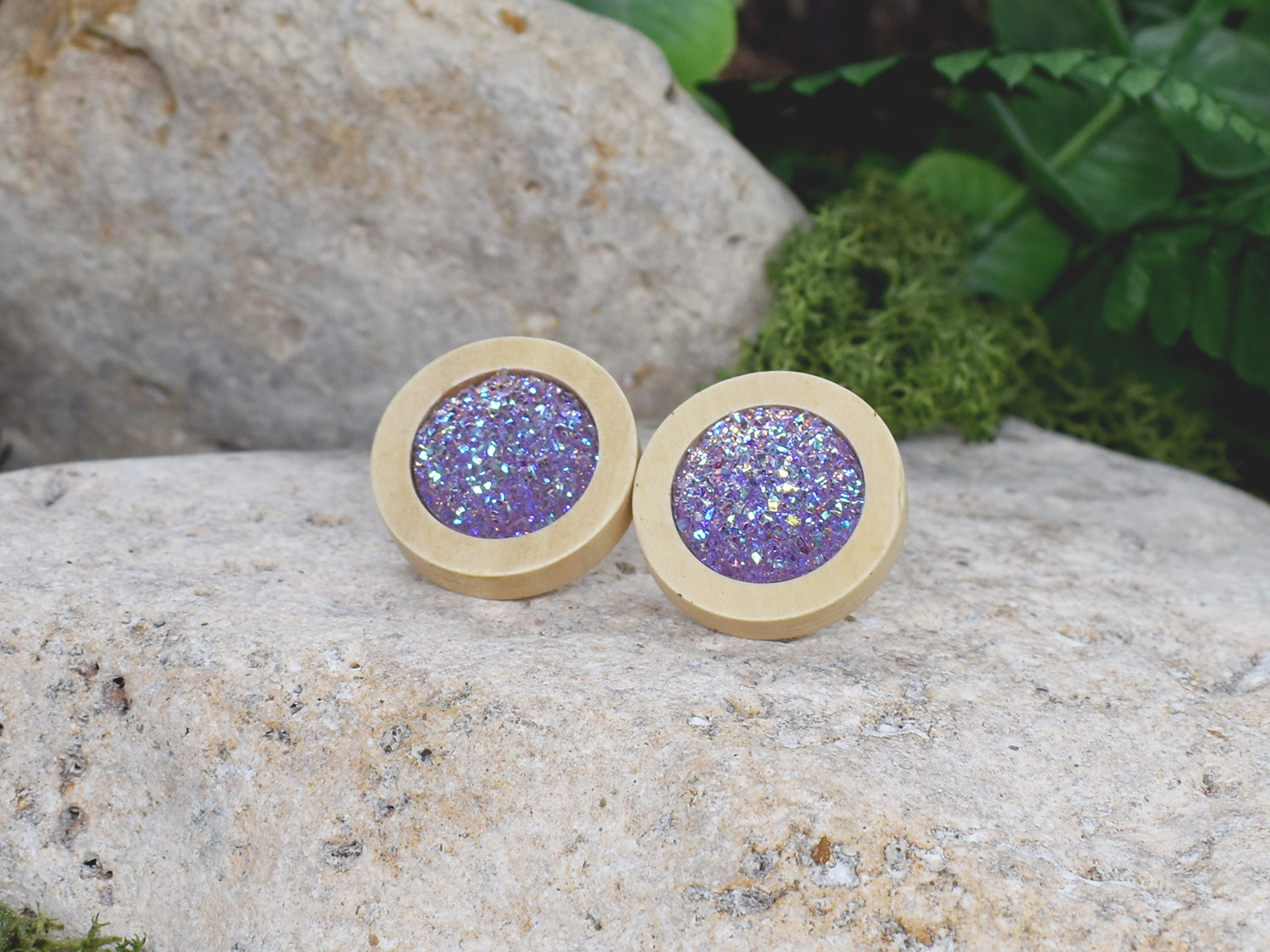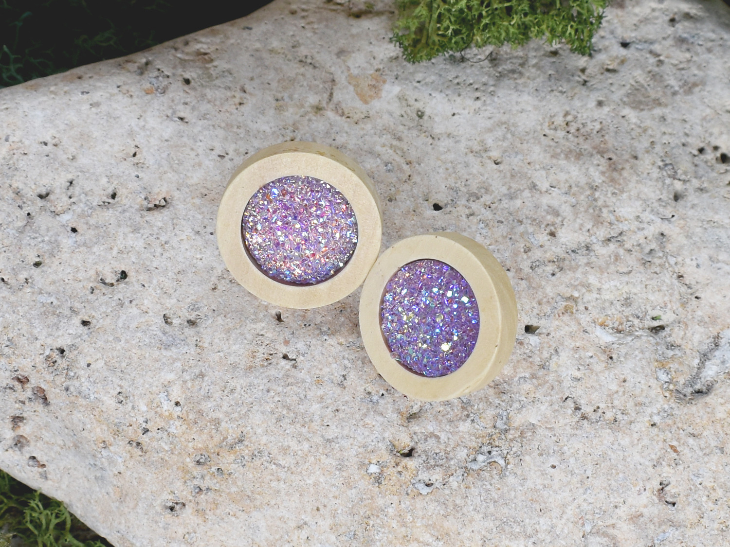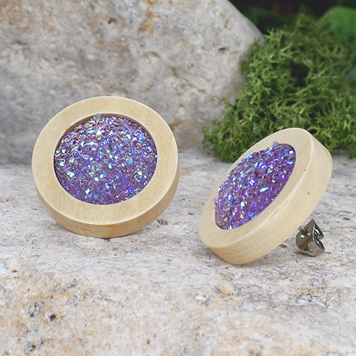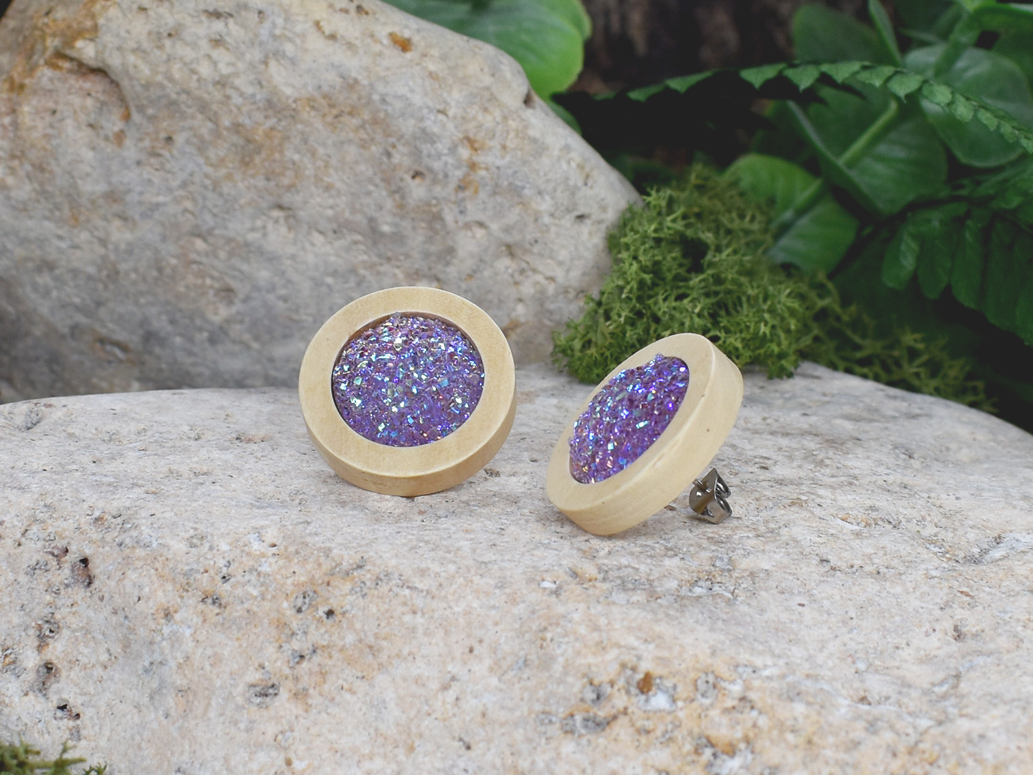 Ręcznie wykonane kolczyki z drewna w naturalnym kolorze ozdobione druzami. Idealne do letnich kolorowych stylizacji boho / hippie.