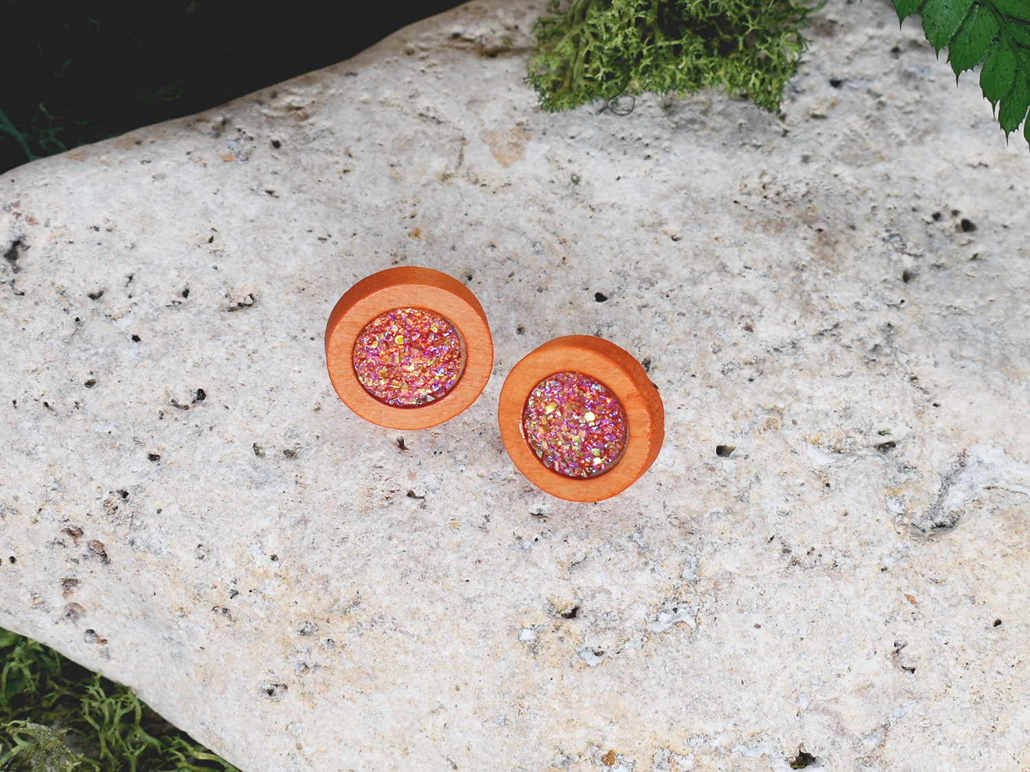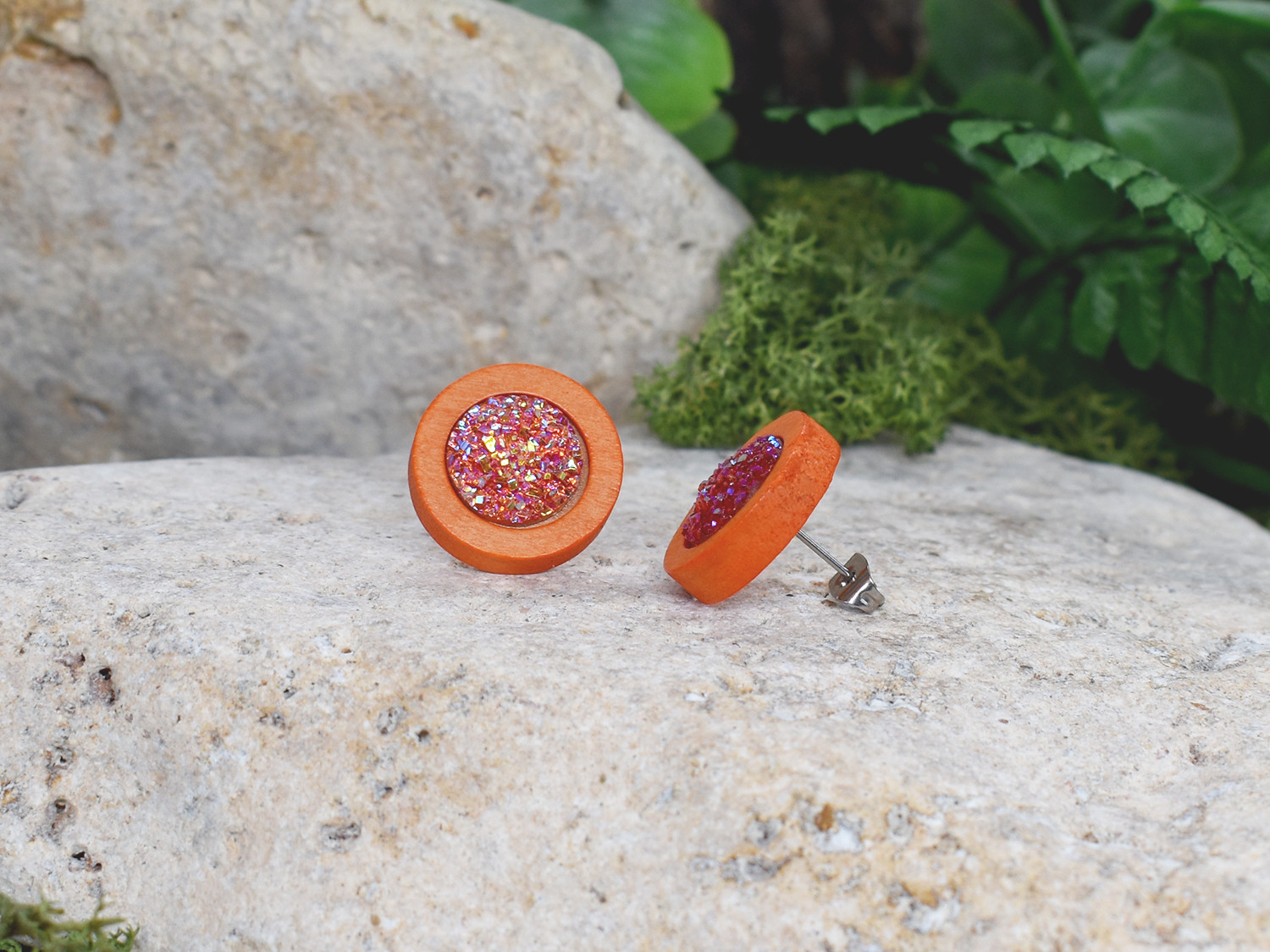 Drewniane pomarańczowe kolczyki sztyfty z druzami boho #2