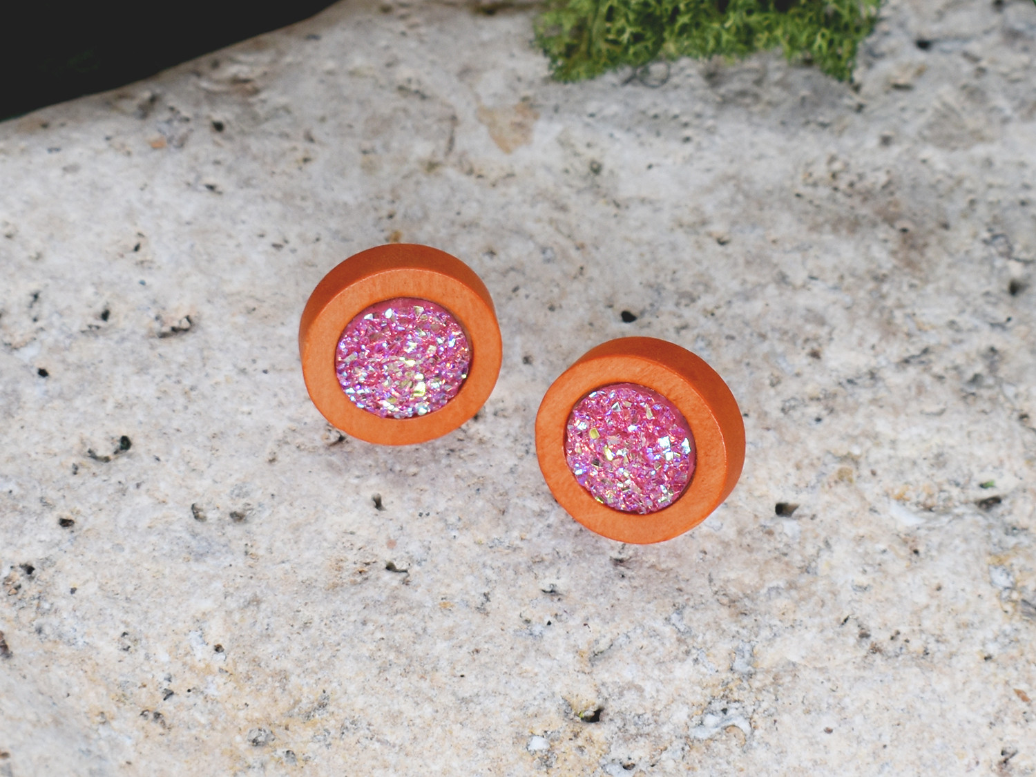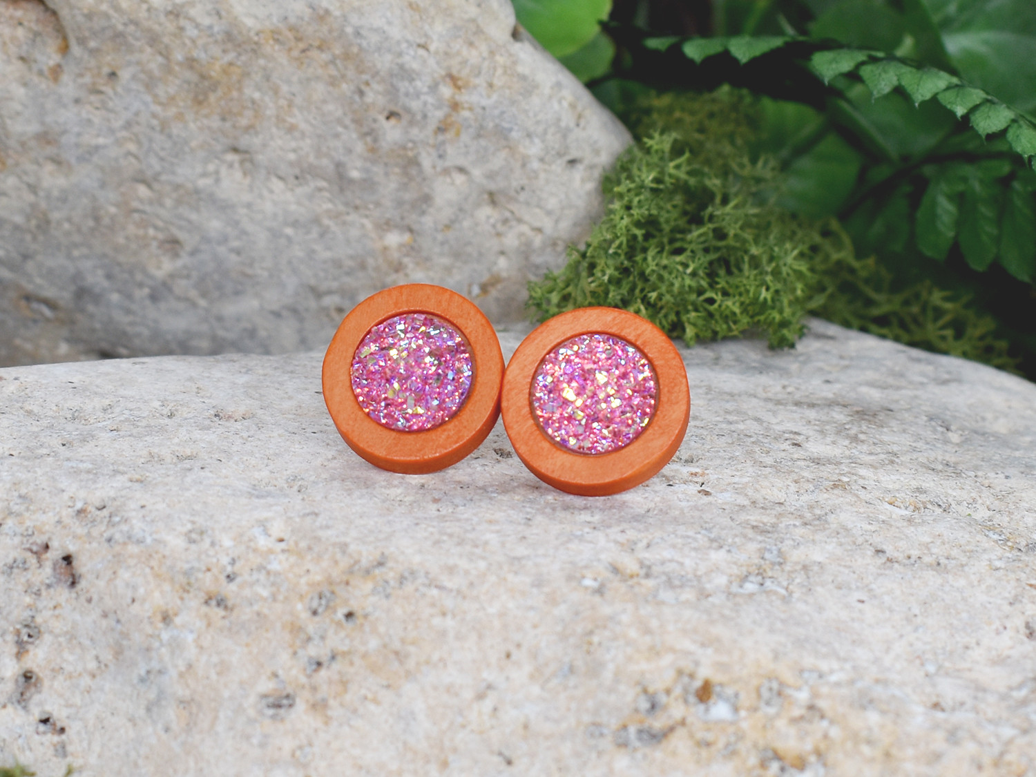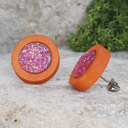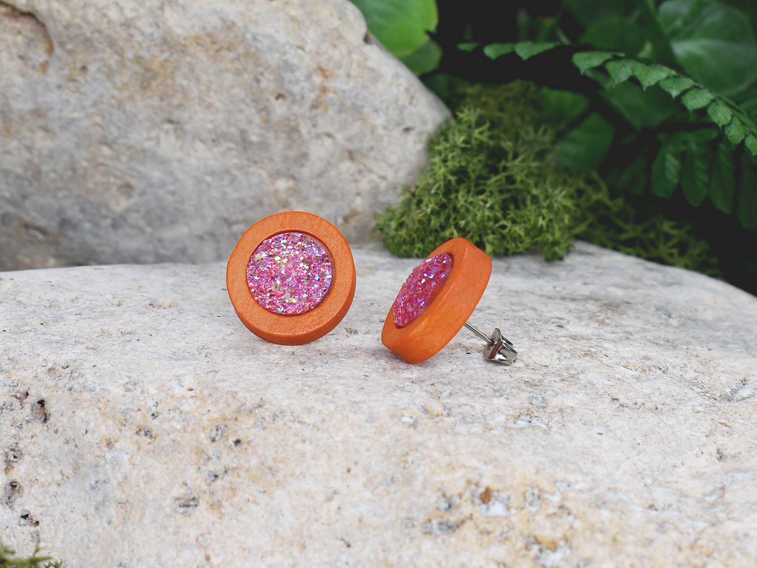 Drewniane pomarańczowe kolczyki sztyfty z druzami boho #3