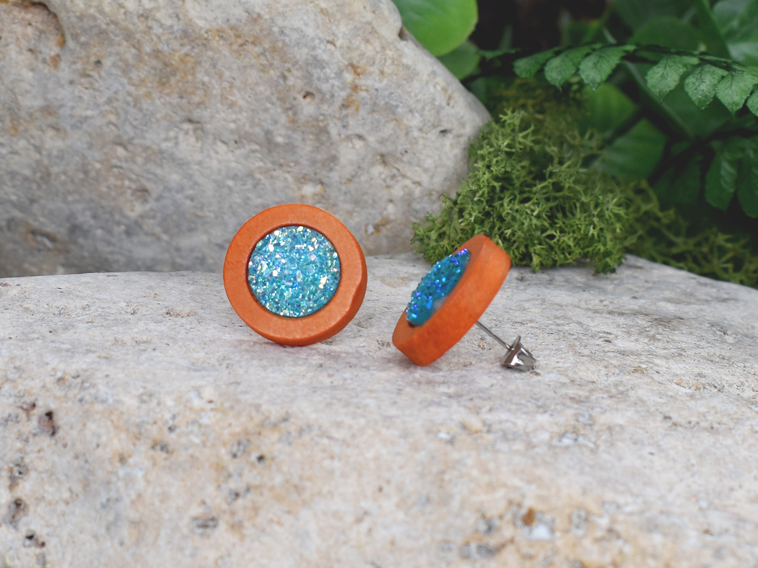 Drewniane pomarańczowe kolczyki sztyfty z druzami boho #4