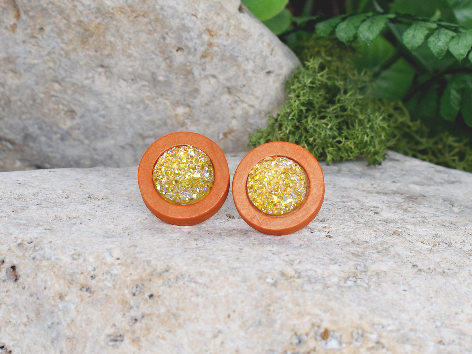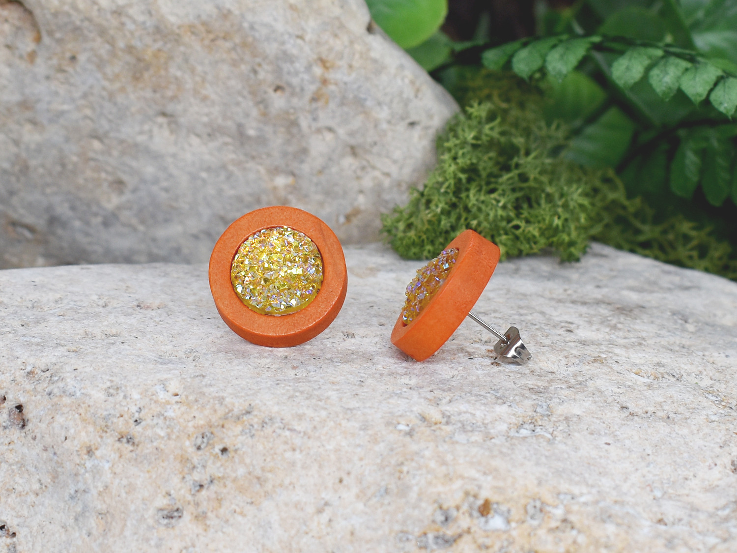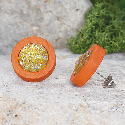 Drewniane pomarańczowe kolczyki sztyfty z druzami boho #6