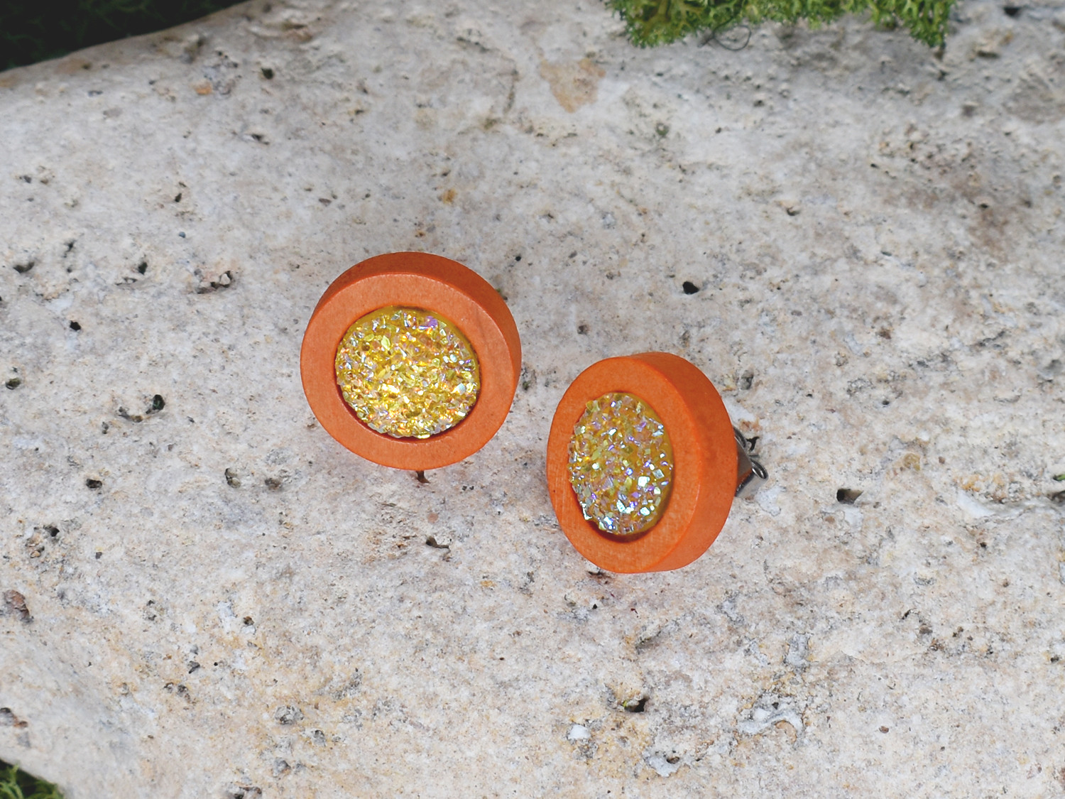 Ręcznie wykonane kolczyki z drewna barwionego na pomarańczowo ozdobione druzami. Idealne do letnich kolorowych stylizacji boho / hippie.
