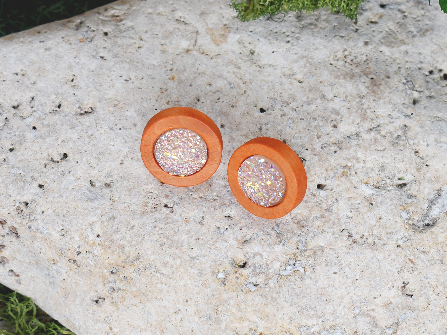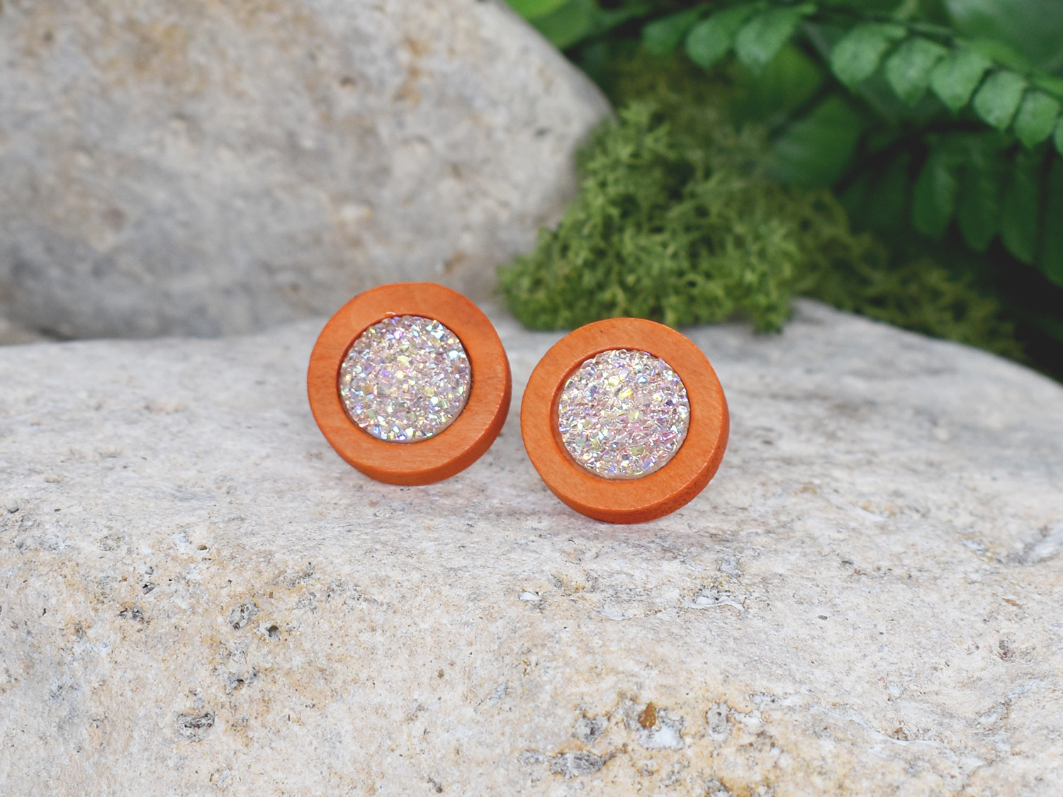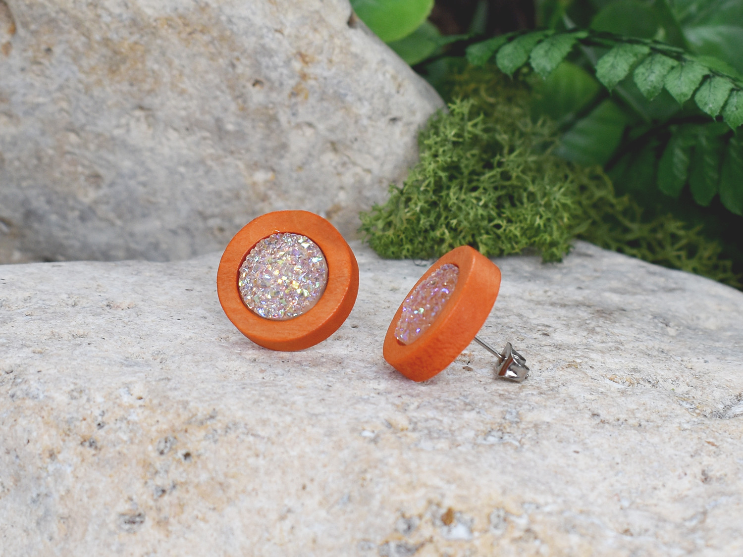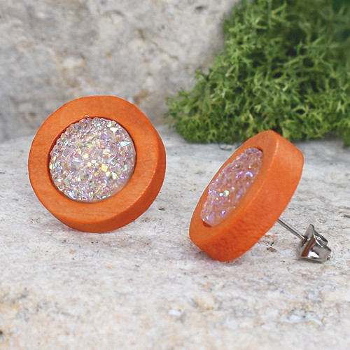 Drewniane pomarańczowe kolczyki sztyfty z druzami boho #7