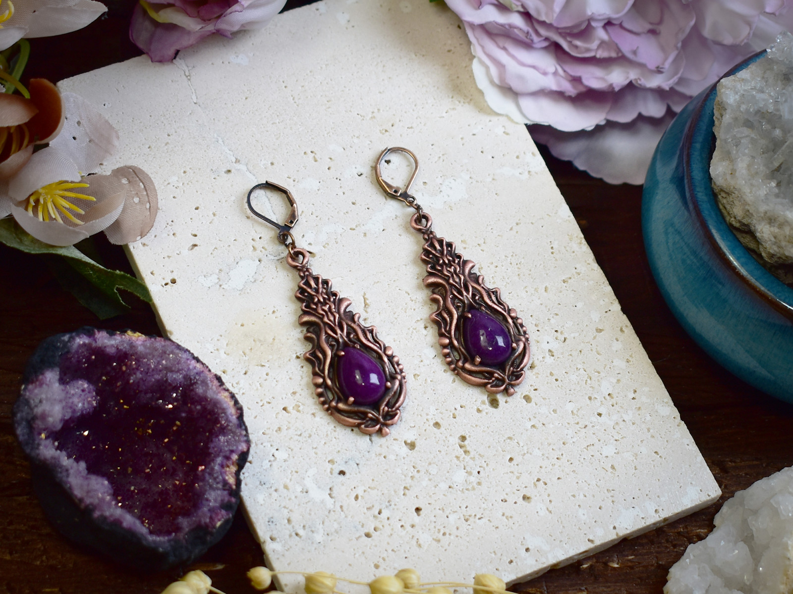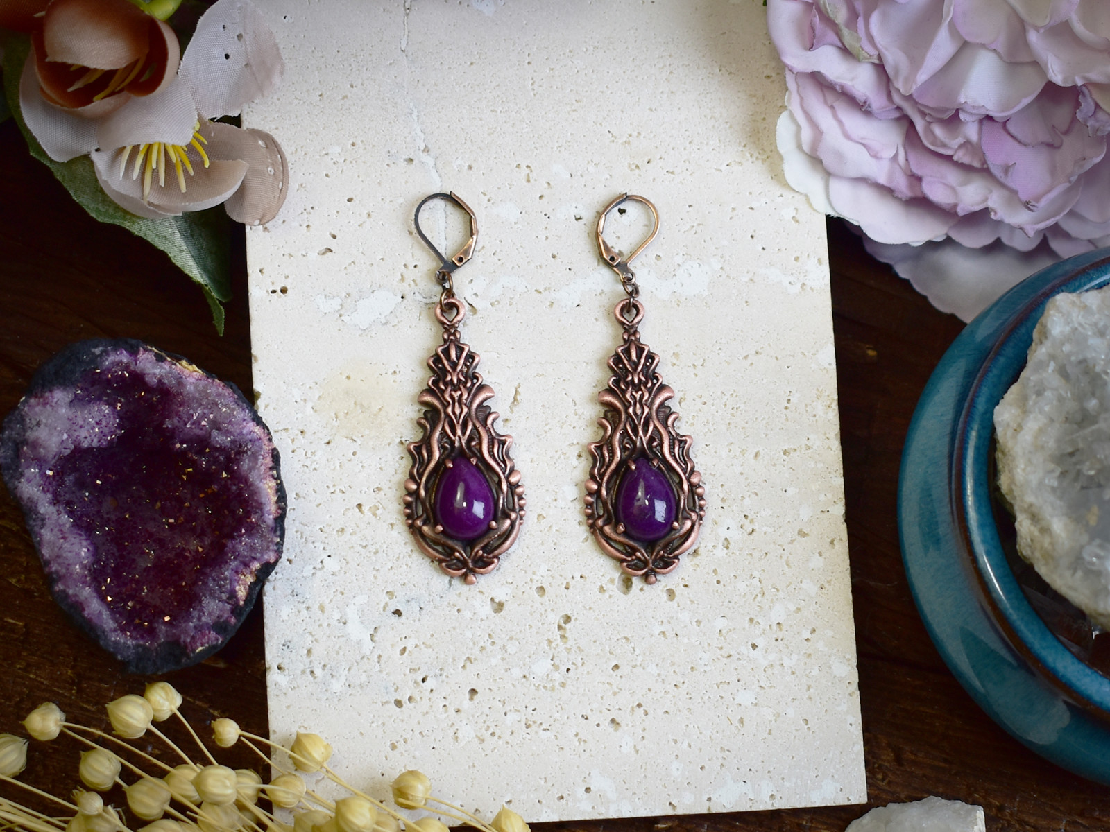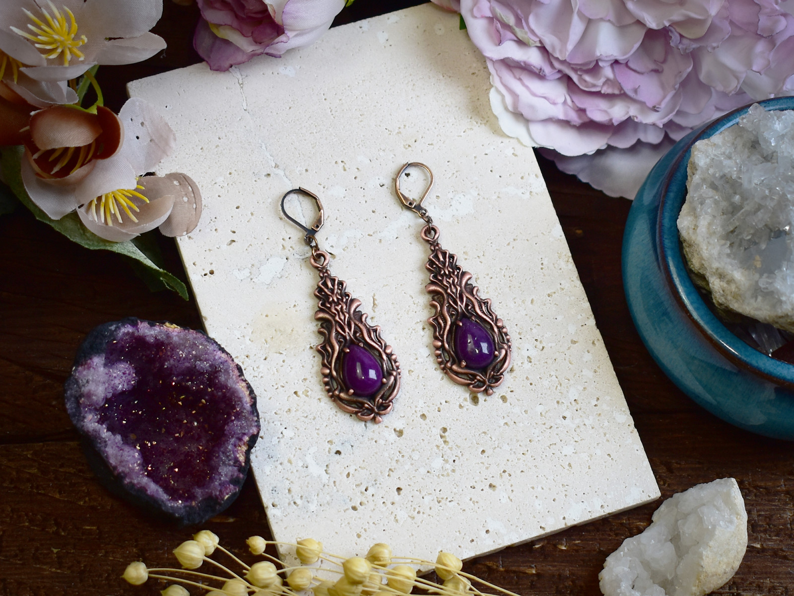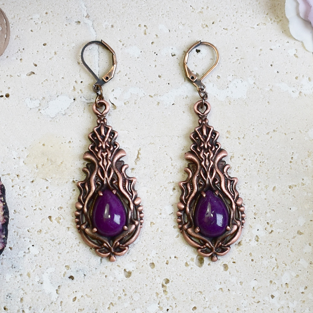 Miedziane kolczyki w stylu wiktoriańskim z fioletowym jadeitem #S3