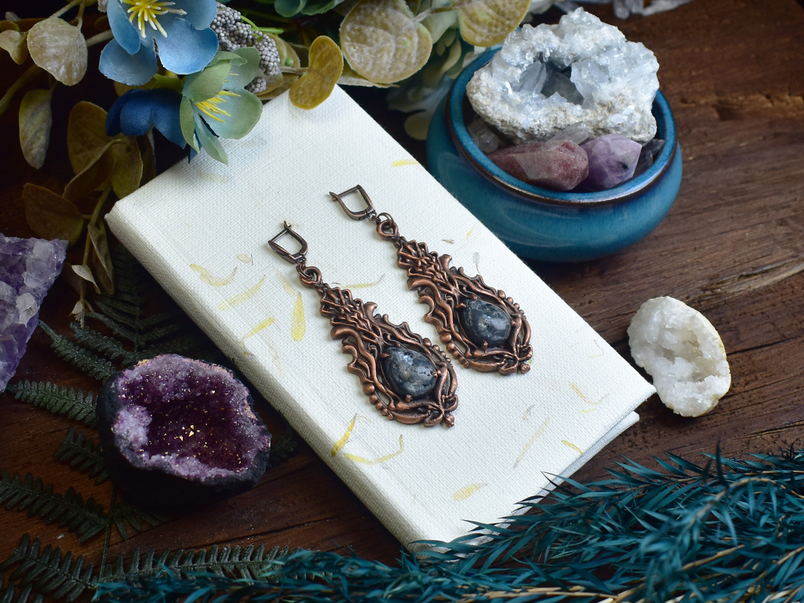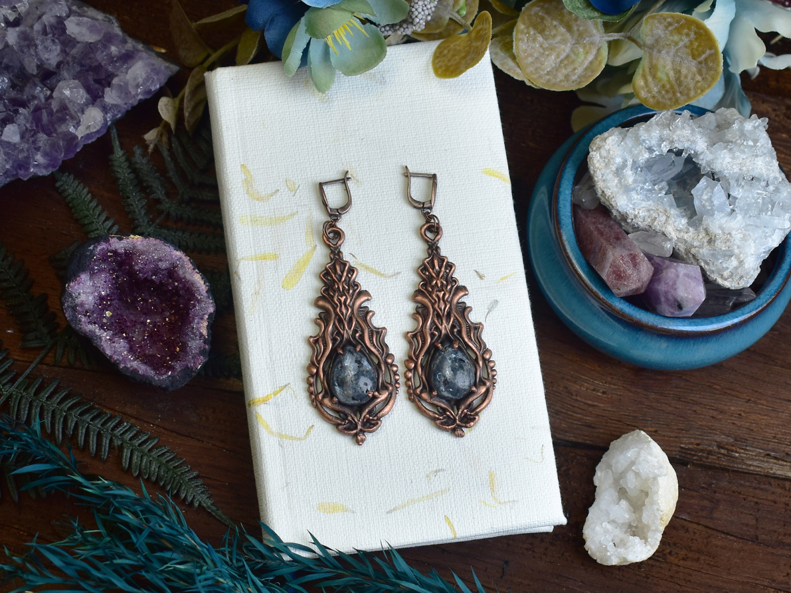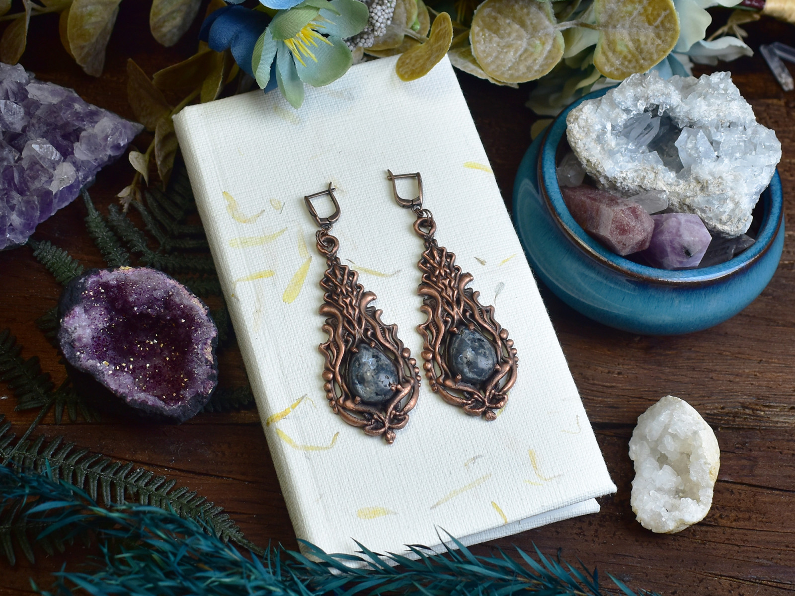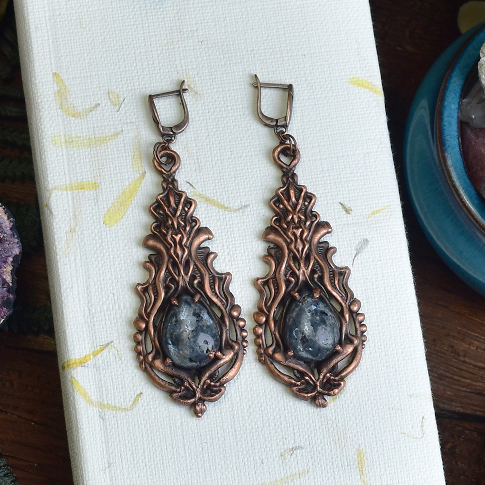 Kolczyki w stylu wiktoriańskim z larvikitem, łączący elementy florystyczne wykonany metodą elektroformowania miedzi.