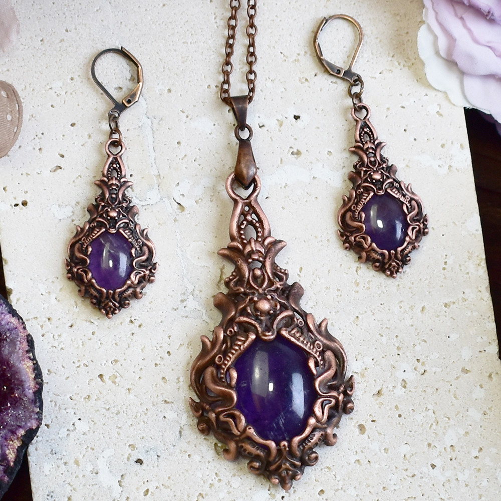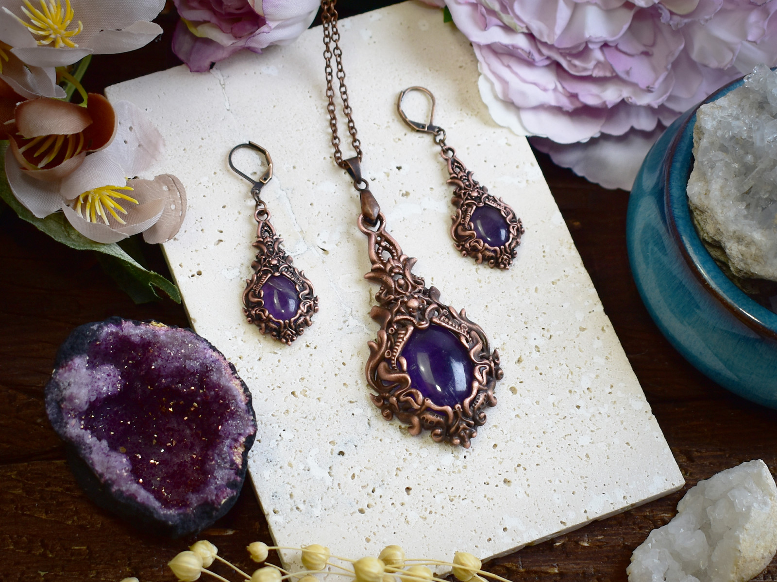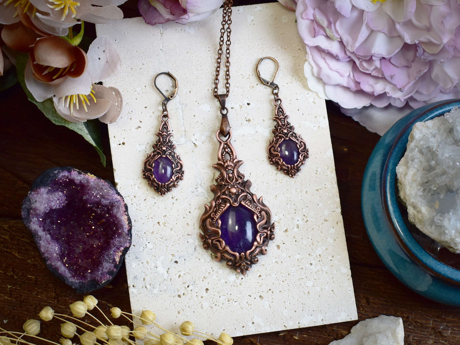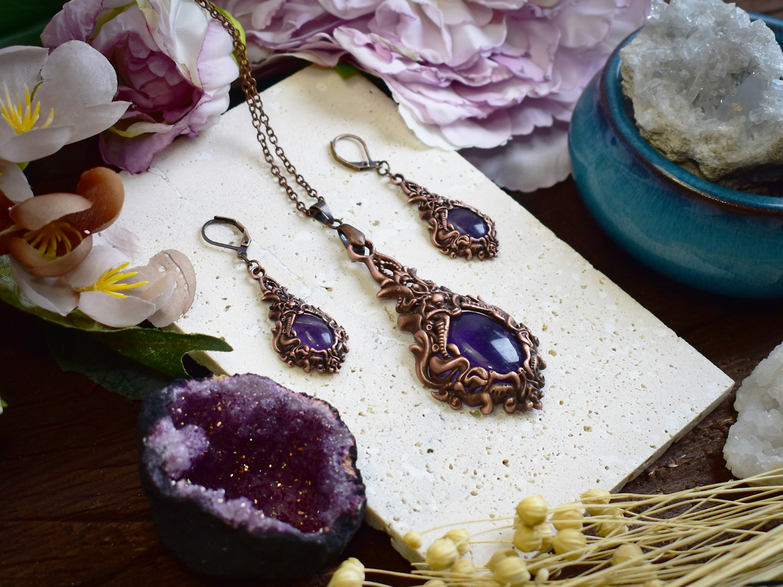 Elegancki zestaw biżuterii z ametystem, stworzony metodą elektroformowania z miedzi. Kolczyki i wisiorek inspirowane stylem gotyckim i wiktoriańskim, pełne drobnych detali. Idealny prezent dla niej, doskonały wybór na urodziny, rocznice lub wyjątkową okazję. Każdy element jest unikalny, ręcznie robiony, co czyni go idealnym wyborem dla miłośników mrocznej, eleganckiej biżuterii.