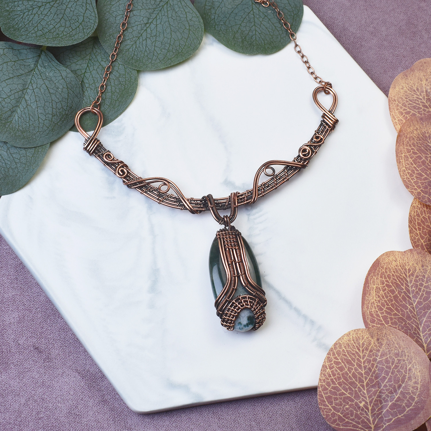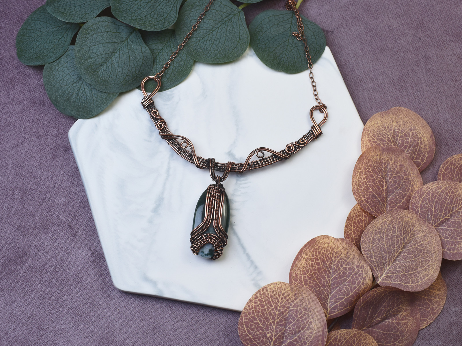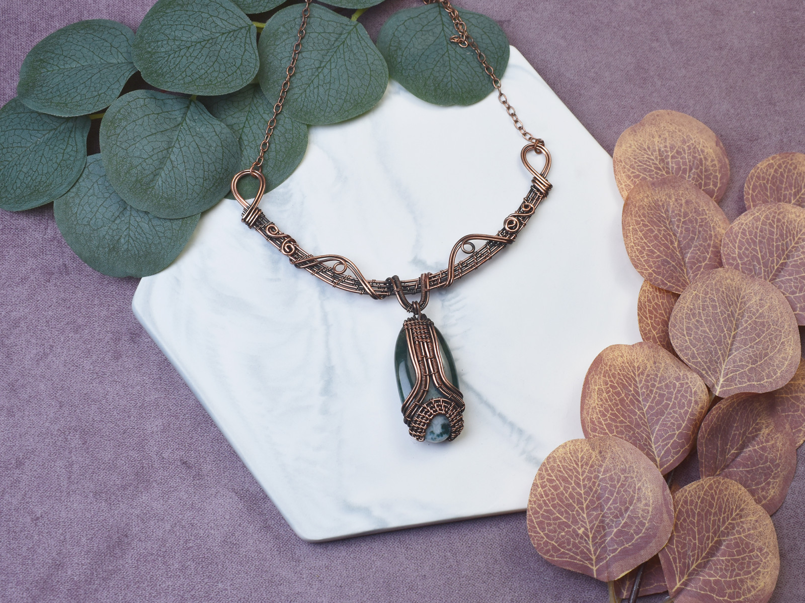 Naszyjnik wykonany techniką wire wrapping to unikatowe połączenie miedzi i agatu mszystego. Subtelne plecenie drutu miedzianego tworzy delikatny, lecz wyrazisty wzór, podkreślając naturalne piękno kamienia. Agat mszysty, bogaty w odcienie zieleni, dodaje naszyjnikowi harmonii i spokoju. To nie tylko elegancki dodatek, ale również talizman łączący siłę natury z ręcznie wykonanym designem.