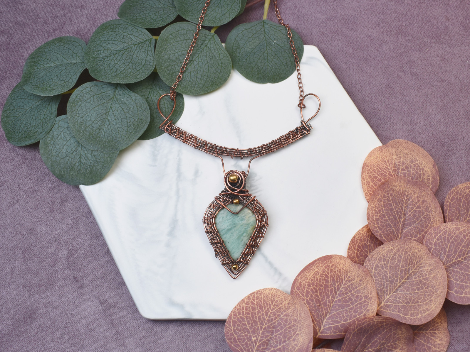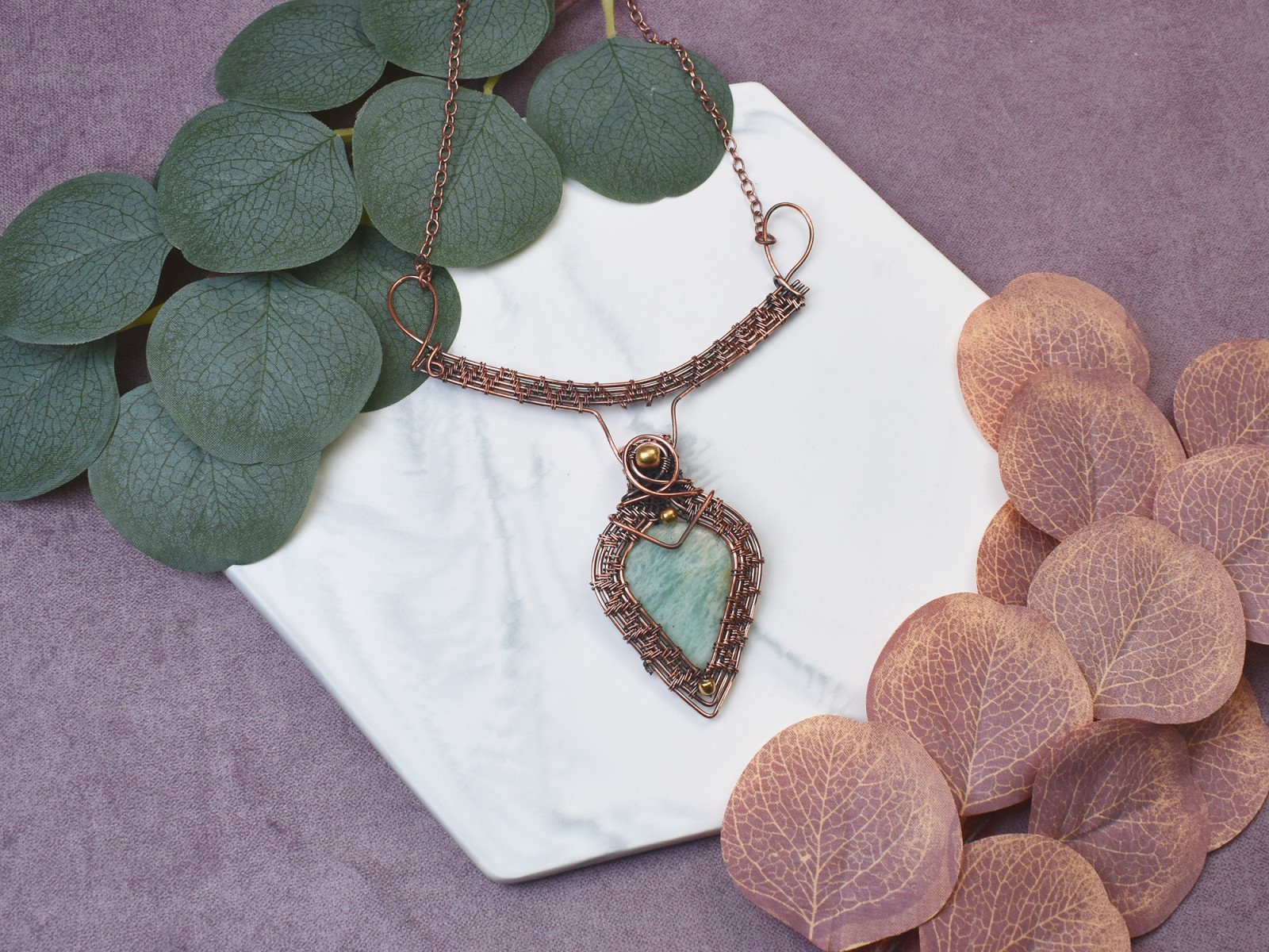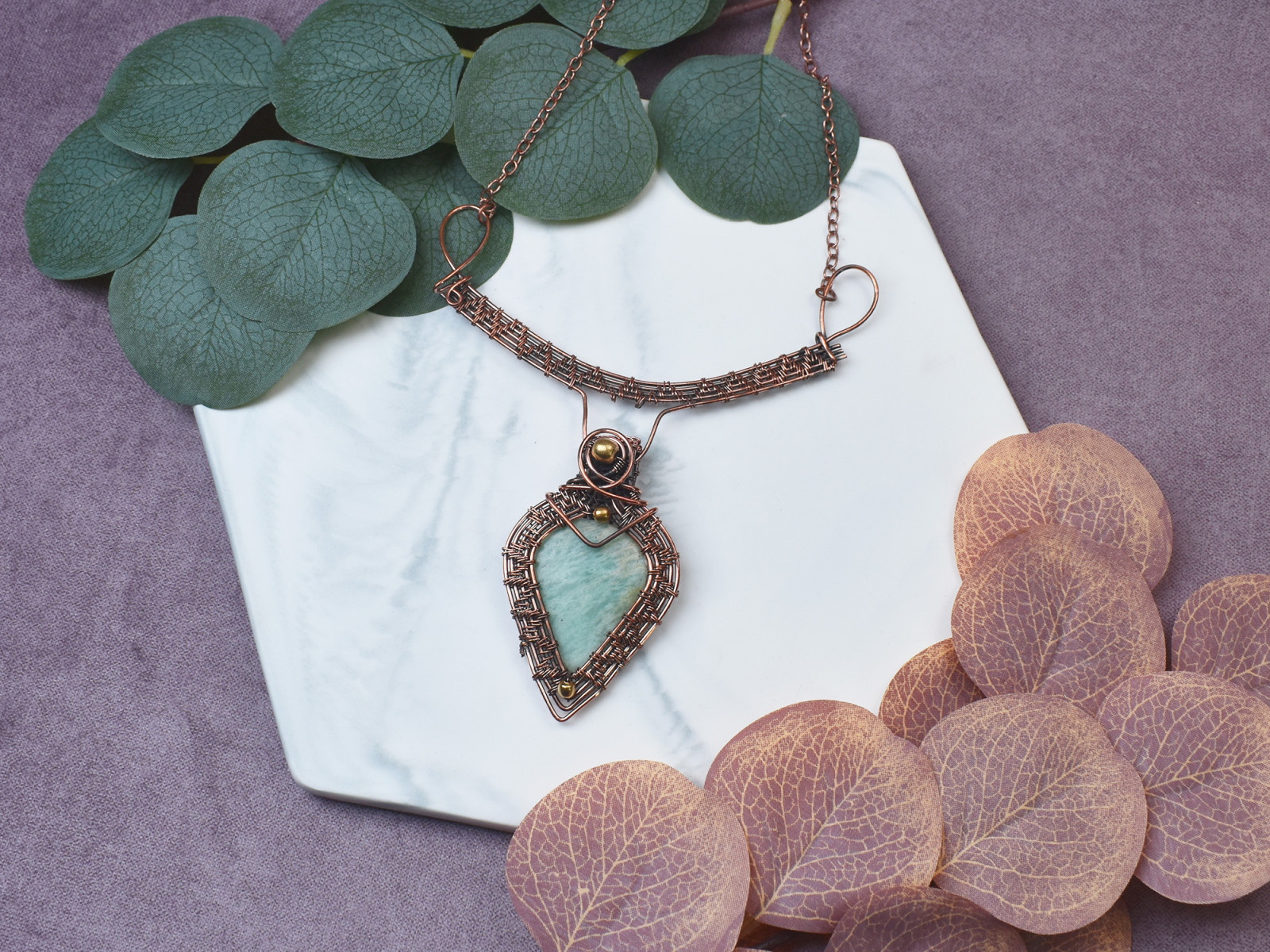 Ten miedziany naszyjnik wykonany techniką wire wrapping ozdobiony jest urokliwym kamieniem amazonitu. Mistrzowsko splecione druty podkreślają jego naturalne piękno, tworząc delikatną i zarazem efektowną formę. Amazonit, ze swoim charakterystycznym odcieniem zieleni, nadaje naszyjnikowi unikalny wygląd. Kamień ten uważany jest za amulet równowagi i spokoju, co czyni ten naszyjnik nie tylko stylowym dodatkiem, lecz także potencjalnym źródłem harmonii dla noszącej go osoby.