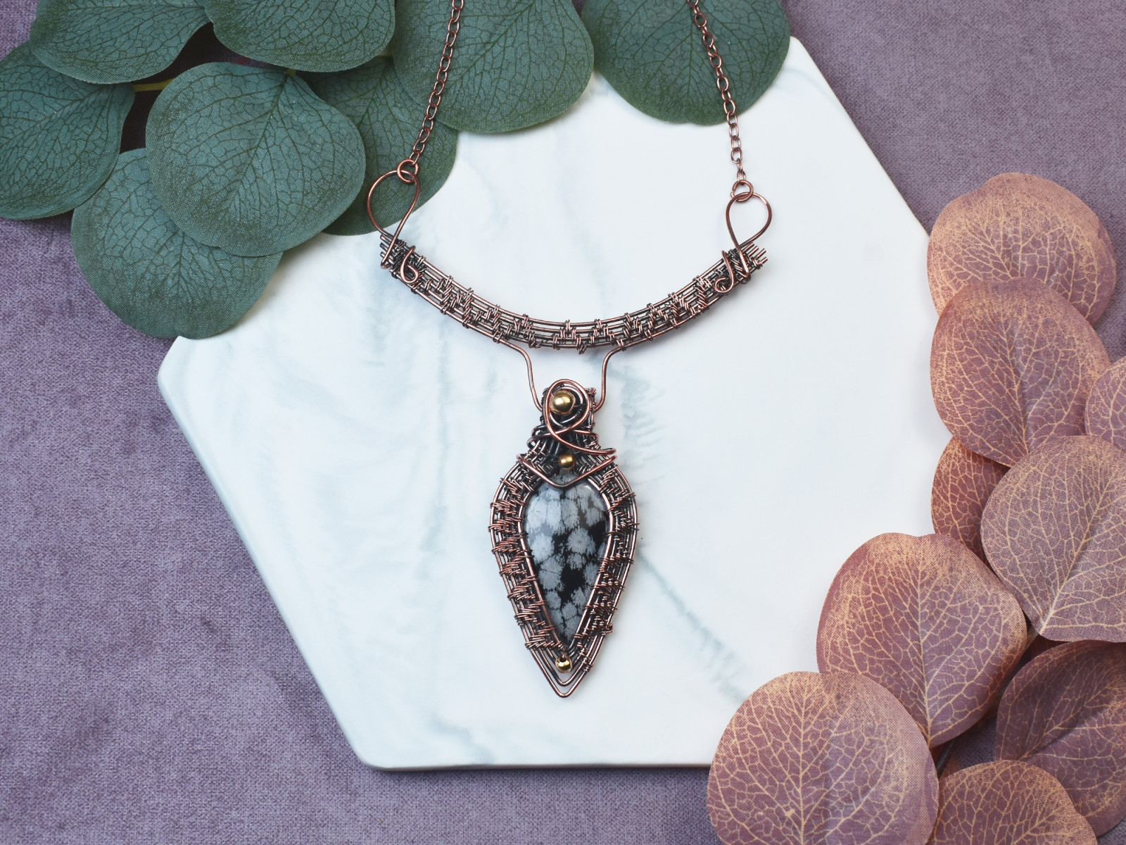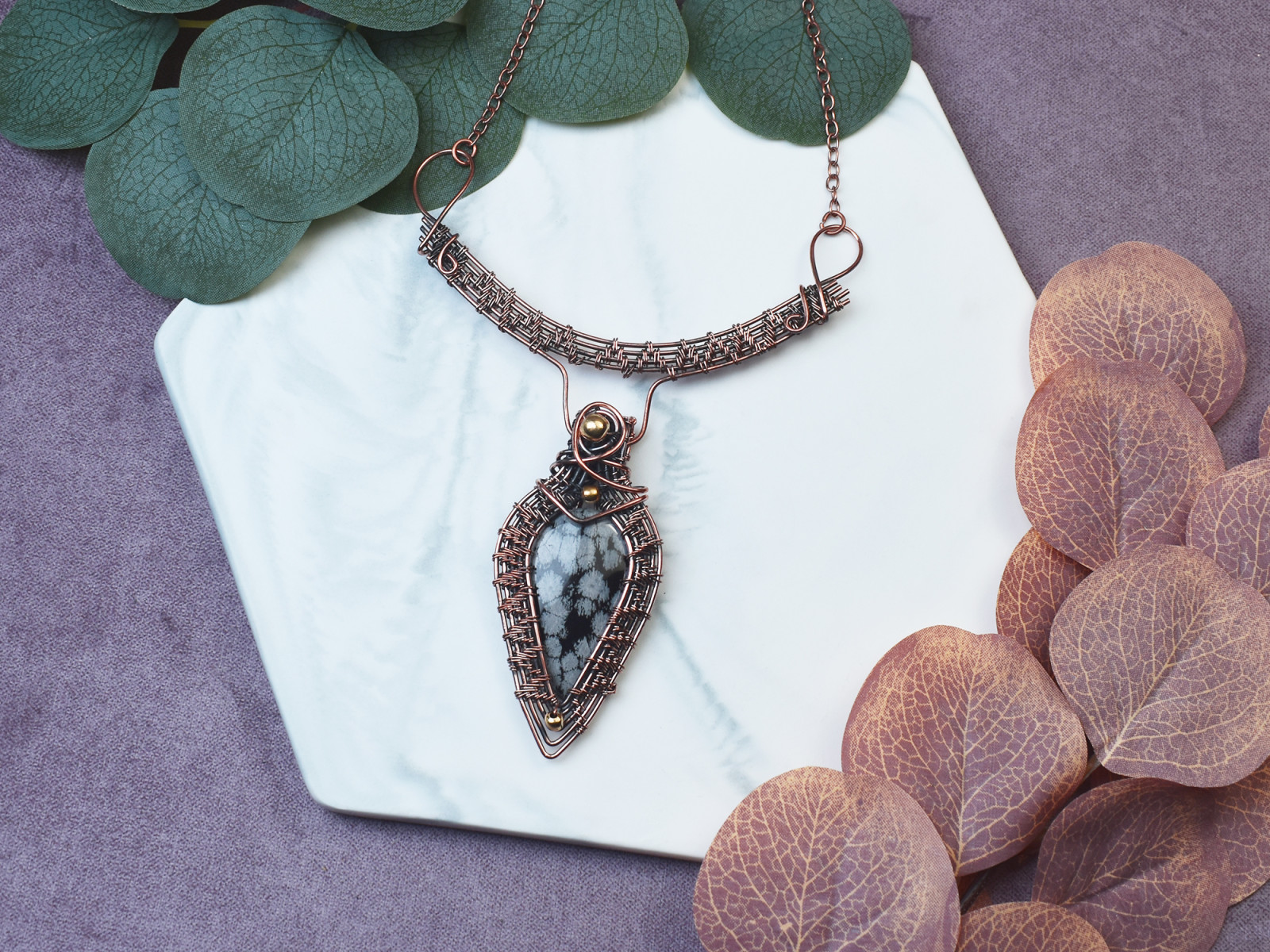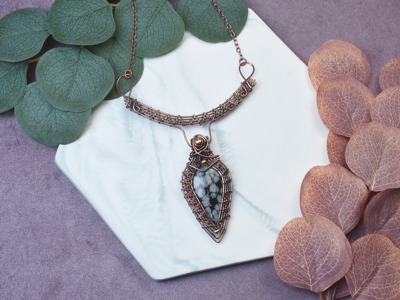 Naszyjnik wykonany metodą wire wrapping z miedzią to wyraz prostoty i finezji. Jego centralnym elementem jest śnieżny obsydian, który dzięki białym plamom przypomina płatki śniegu na czarnym tle. Miedziane druciki zostały precyzyjnie uformowane, otaczając kamień w delikatny sposób. Ten naszyjnik emanuje subtelnością i równowagą, stanowiąc idealną ozdobę dla miłośników minimalistycznego designu i naturalnej urody.