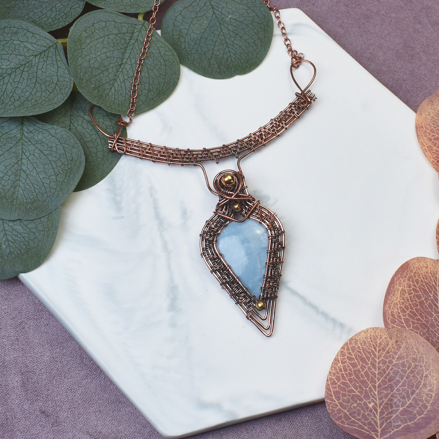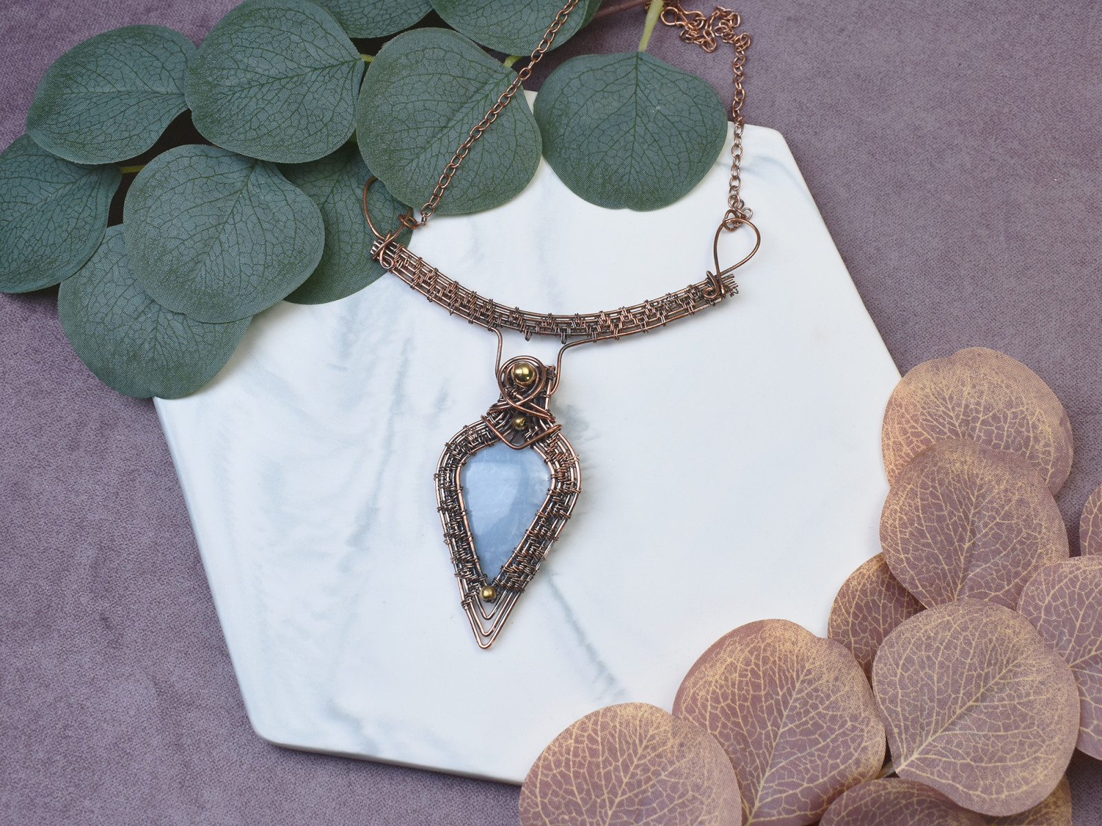 Ten miedziany naszyjnik wykonany techniką wire wrapping zachwyca prostotą i elegancją. Jego sercem jest piękny Owyhee Opal, który emanuje subtelnym blaskiem i niepowtarzalnymi refleksami. Miedź, starannie pleciona wokół kamienia, nadaje całości industrialnego uroku. Naszyjnik emanuje delikatnością i jednocześnie siłą natury, podkreślając unikalność noszącego.