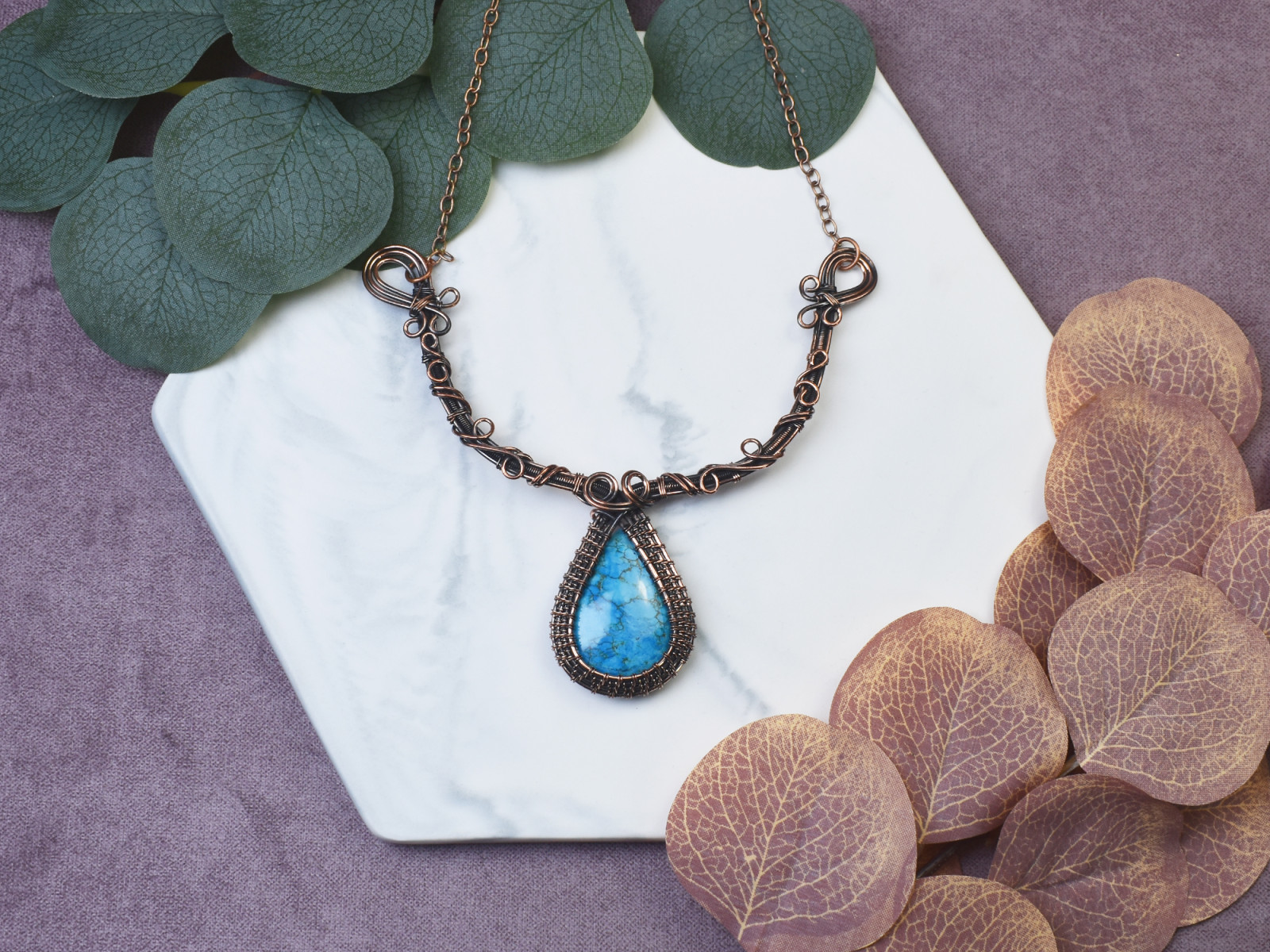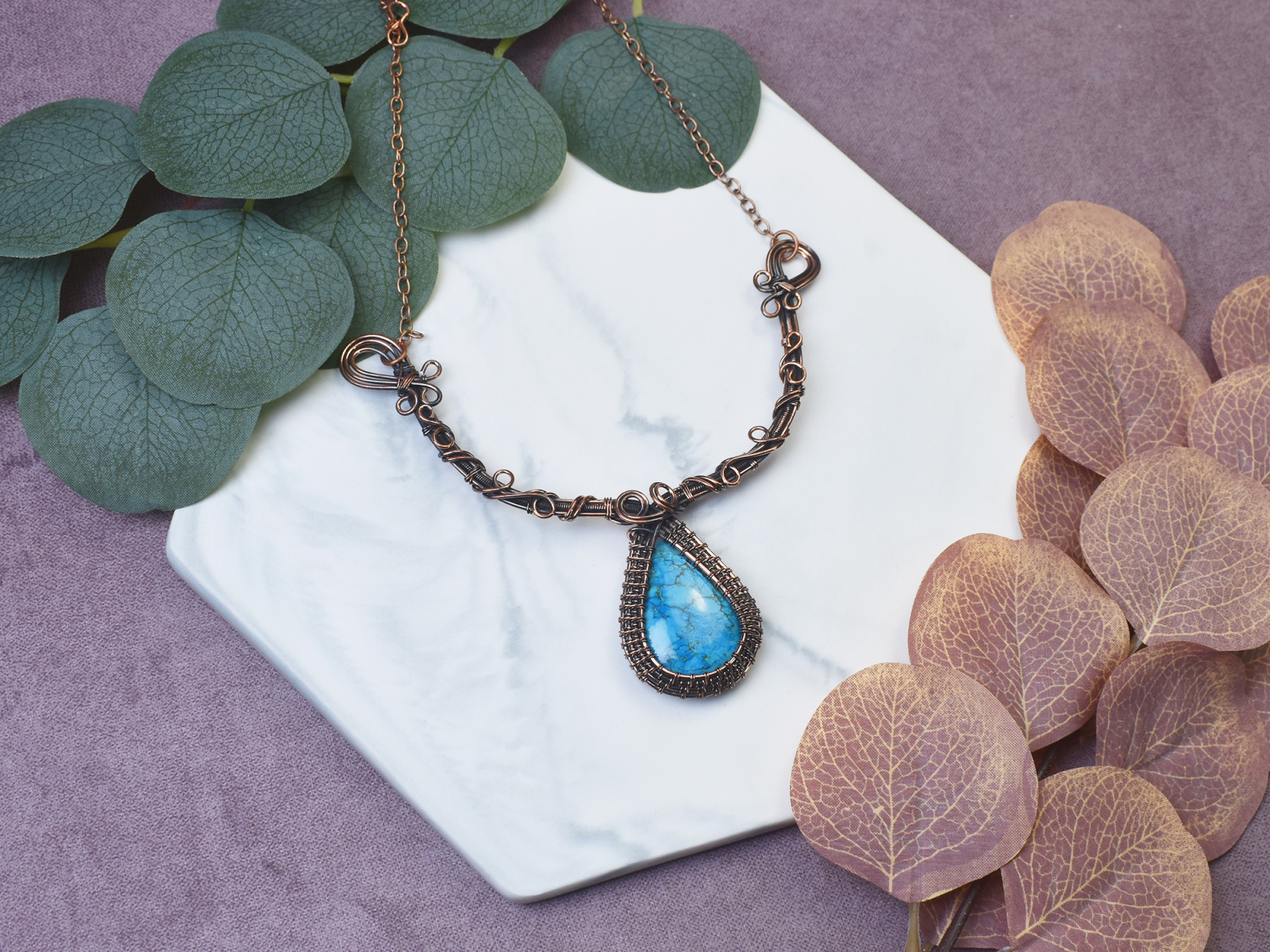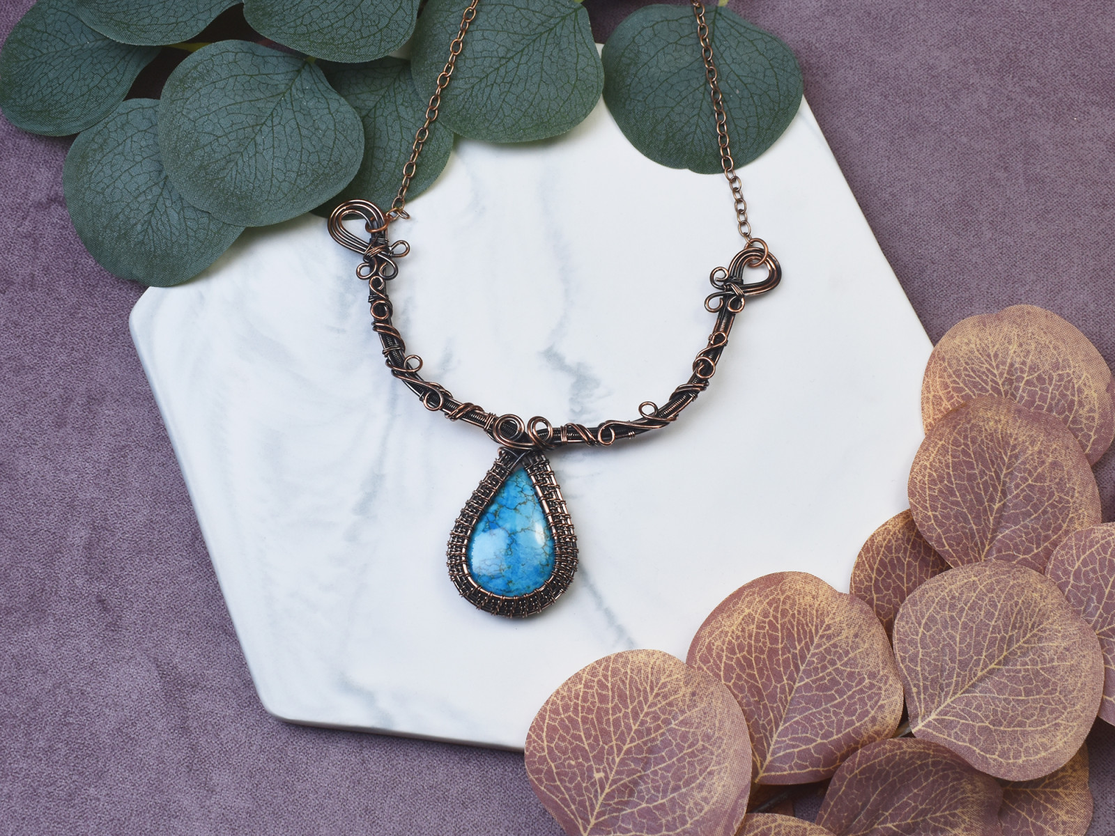 Miedziany naszyjnik wire wrapping z turkusem #495