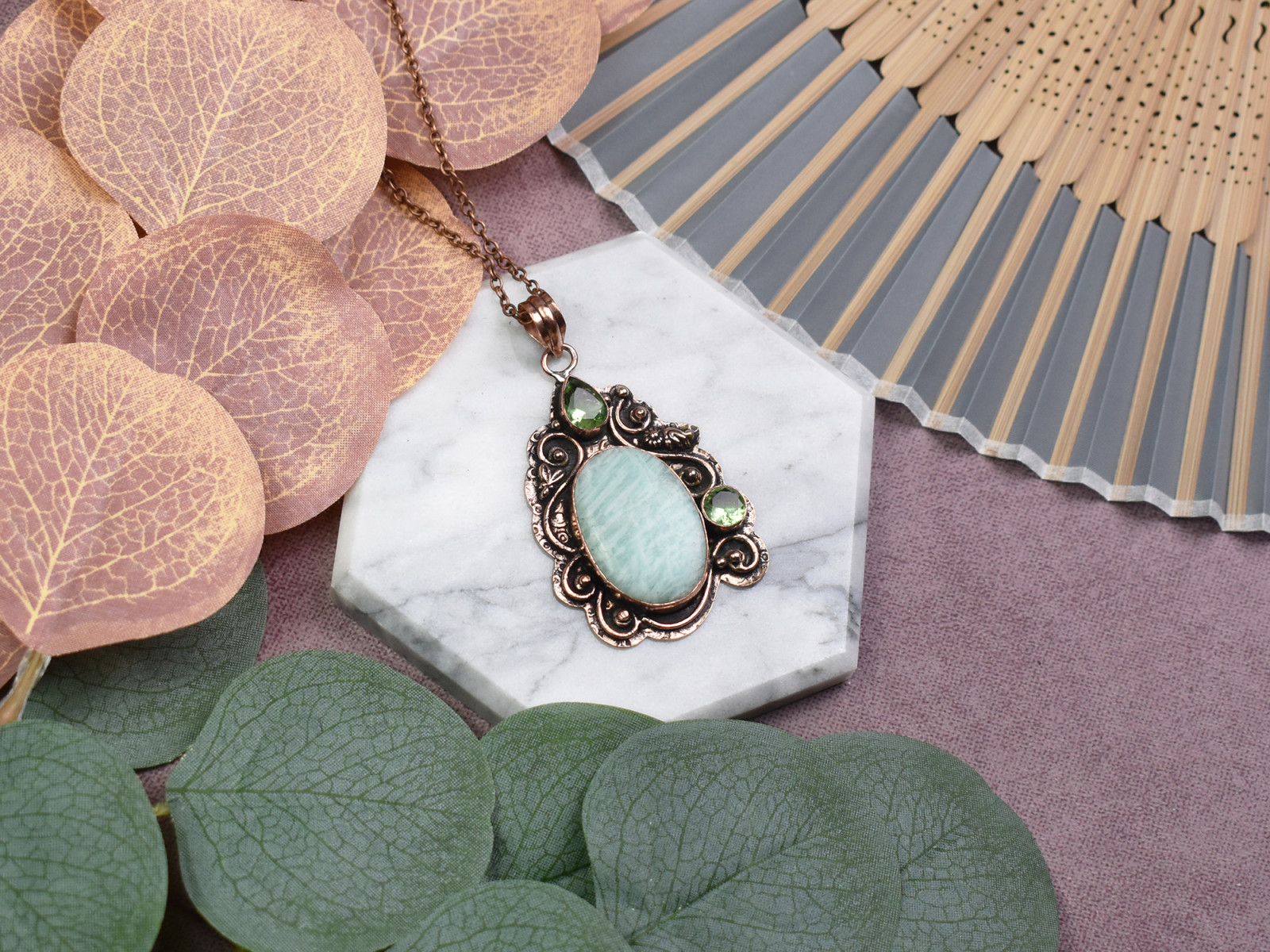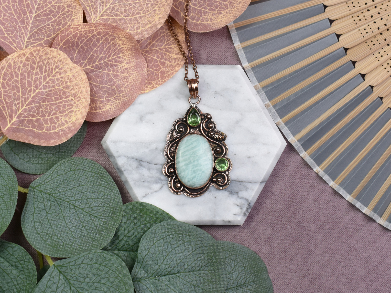 Miedziany ozdobny wisiorek z amazonitem i peridotem #570