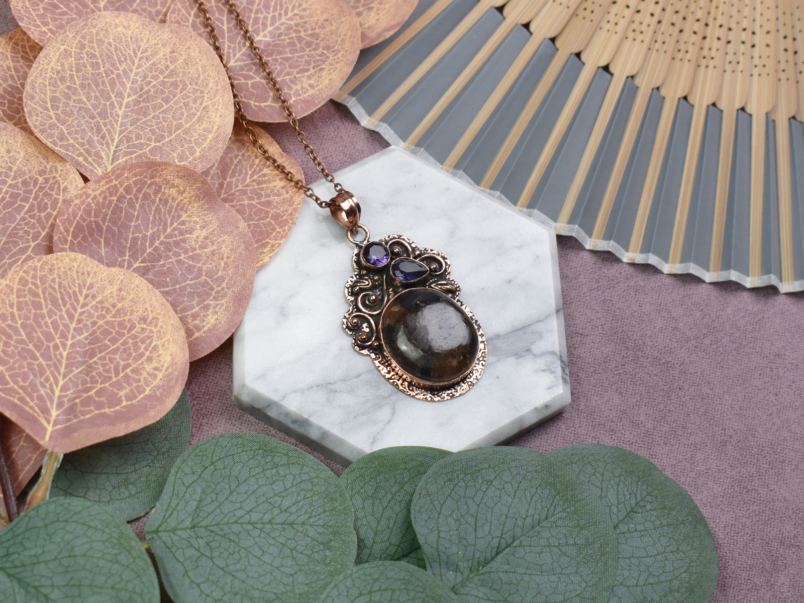 Miedziany ozdobny wisiorek z jaspisem i ametystem #555