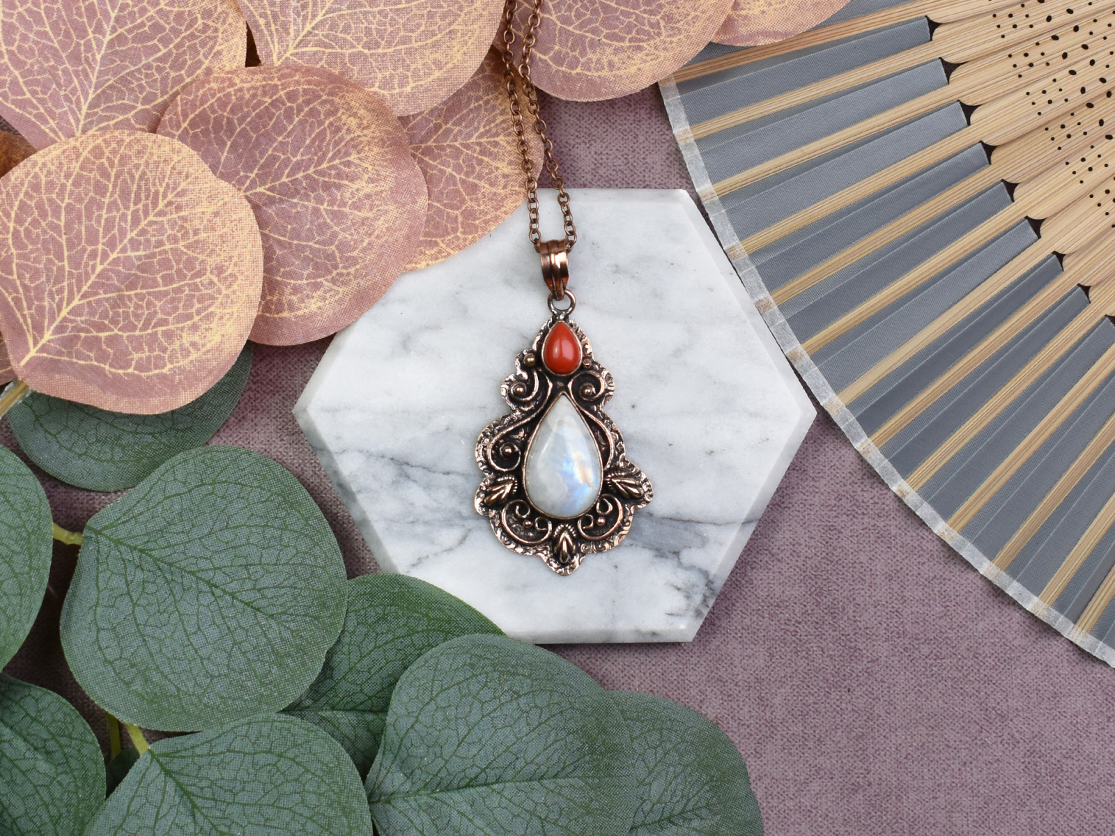 Miedziany ozdobny wisiorek z kamieniem księżycowym i koralem #547