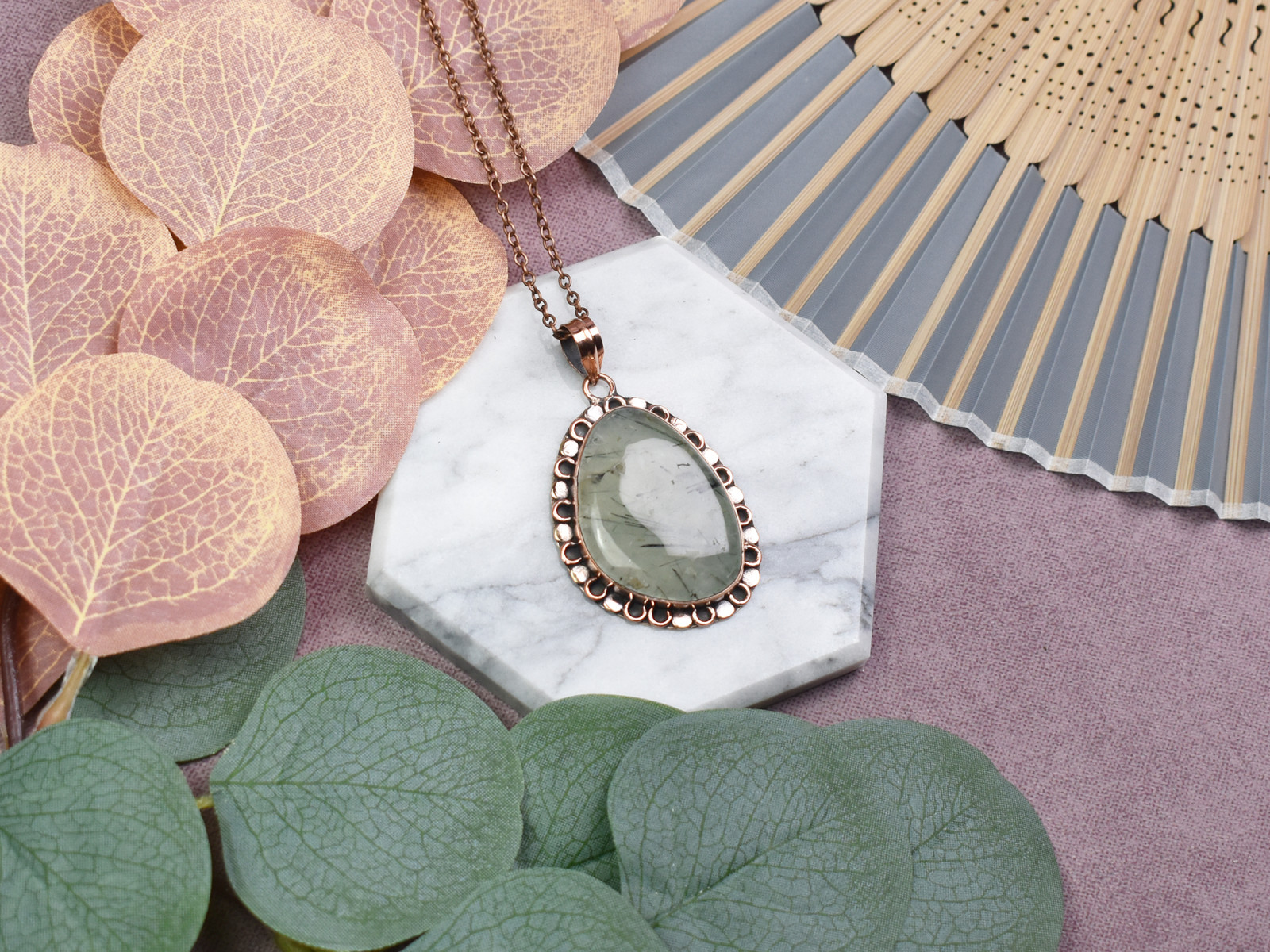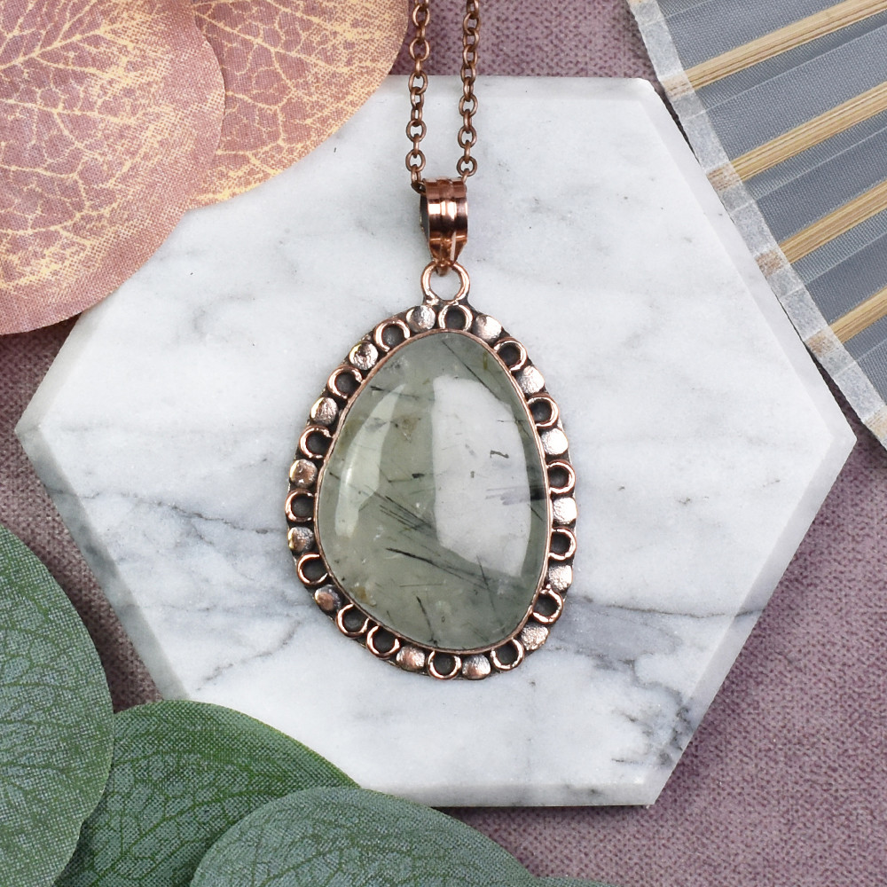 Miedziany ozdobny wisiorek z prehnitem #562