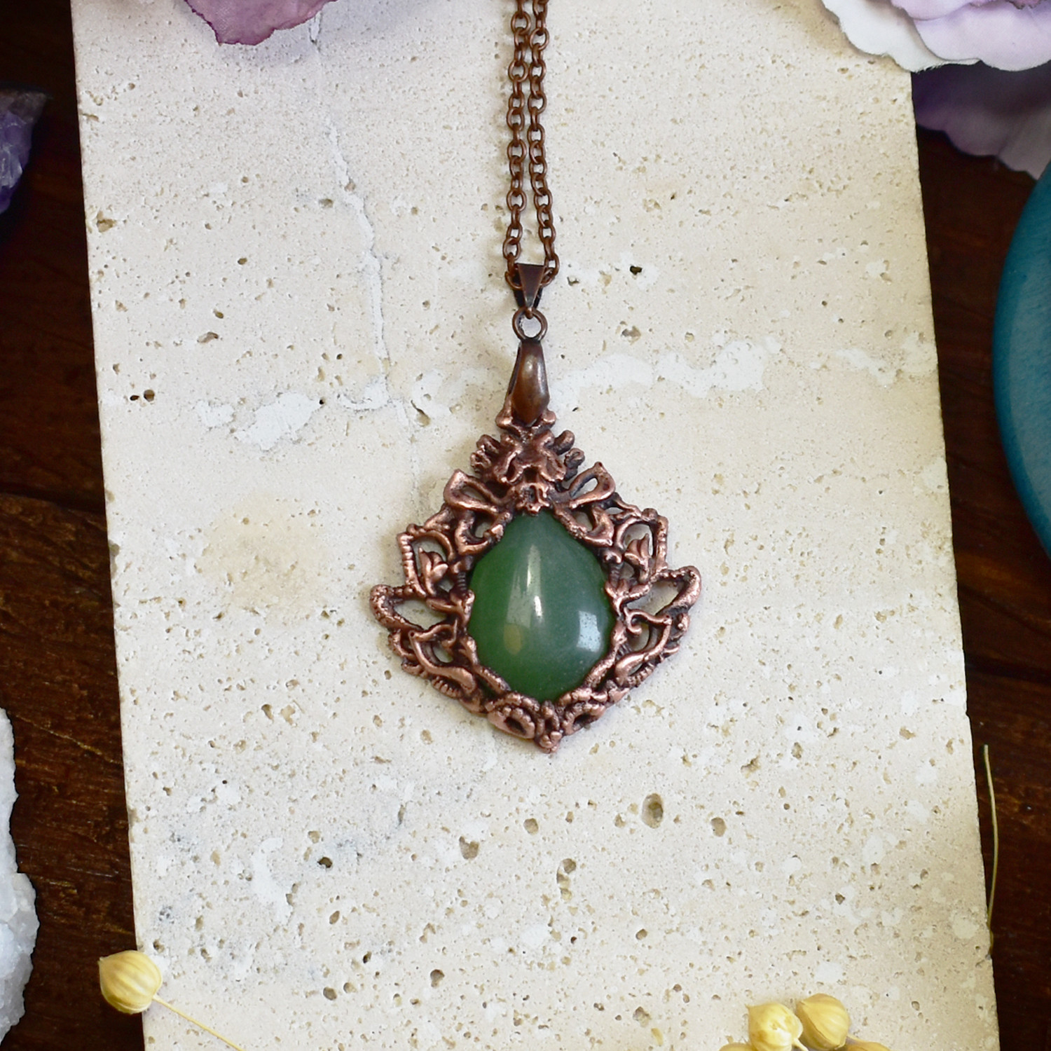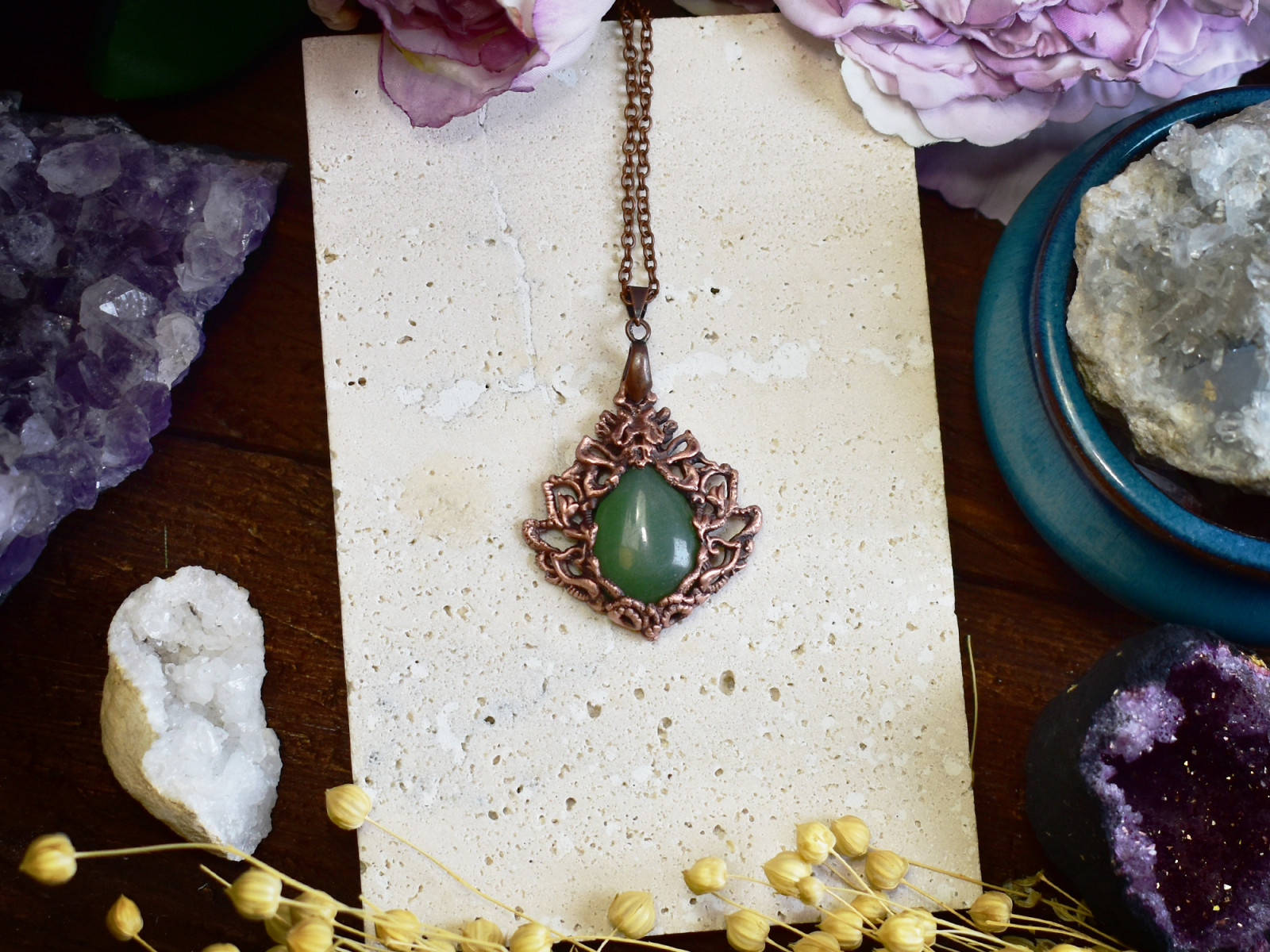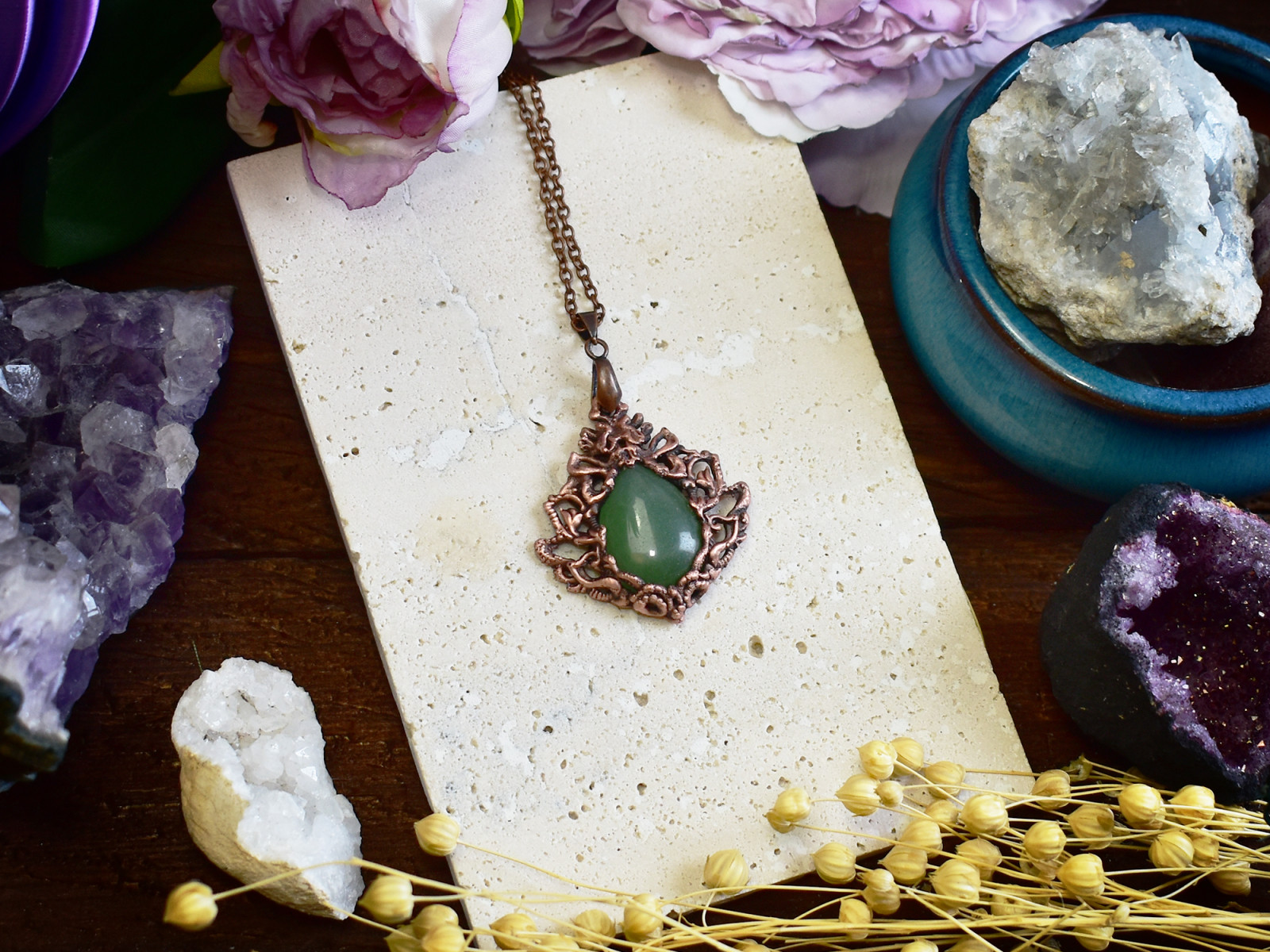 Wisiorek w stylu wiktoriańskim, wykonany techniką elektroformowania miedzi, ozdobiony awenturynem i wykończony patyną nadającą całości głębi oraz eleganckiego, postarzanego charakteru. Bogata forma i subtelne detale nawiązują do estetyki XIX wieku, w której biżuteria łączyła dekoracyjność z symboliką i kunsztem rzemiosła. Awenturyn, o swojej stonowanej zielonej barwie i delikatnym połysku, wprowadza do kompozycji harmonię i spokojny akcent, pięknie kontrastując z ciemniejszą, patynowaną miedzią. Całość tworzy nastrojowy, klasyczny wisiorek o wyraźnie historycznym charakterze, idealny dla osób ceniących biżuterię artystyczną, styl vintage i ponadczasową elegancję inspirowaną dawnymi epokami.