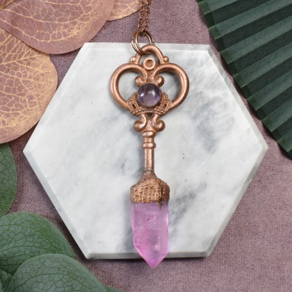 Miedziany wisior z kwarcem i ametystem, kluczyk #59