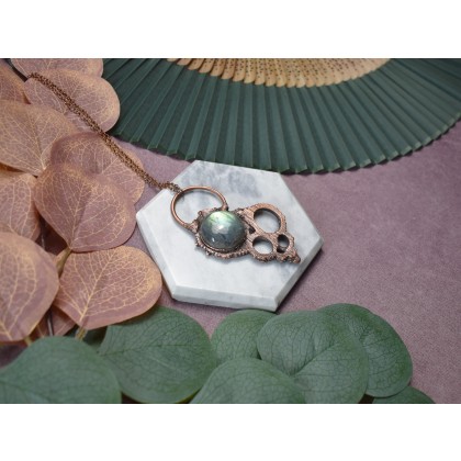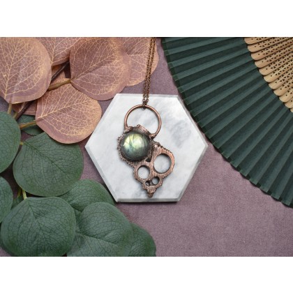 Ręcznie wykonany wisior z labradorytem i plastrem muszli Mouth Turbo Shell. Oprawa wykonana z miedzi metodą elektroformowania, patynowana.