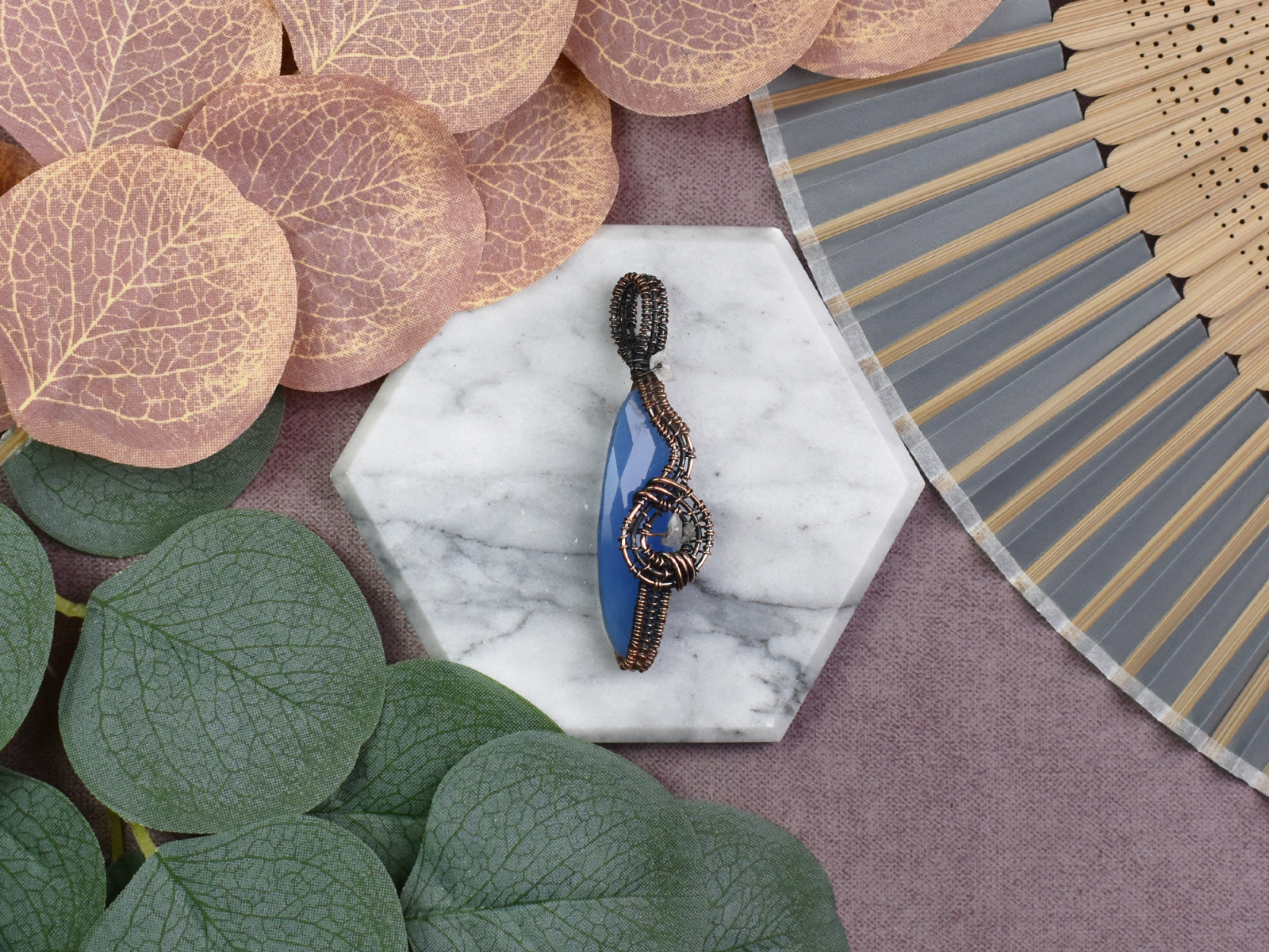 Miedziany wisiorek, wykonany delikatną techniką wire wrapping, to wyjątkowy dodatek ozdobiony niebieskim chalcedonem. Kamień ten, znany również jako niebieski kalcydon, emanuje spokojem i harmonią. Jego właściwości sprzyjają głębokiemu zrozumieniu, przynosząc równowagę emocjonalną i wewnętrzną pewność. Ten piękny wisiorek nie tylko zachwyca swą subtelnością i elegancją, ale również niesie ze sobą energię, która wspiera spokój umysłu i klarowność myśli. To nie tylko biżuteria, lecz także talizman, który może towarzyszyć noszącemu na co dzień, przypominając o sile spokoju i równowagi.