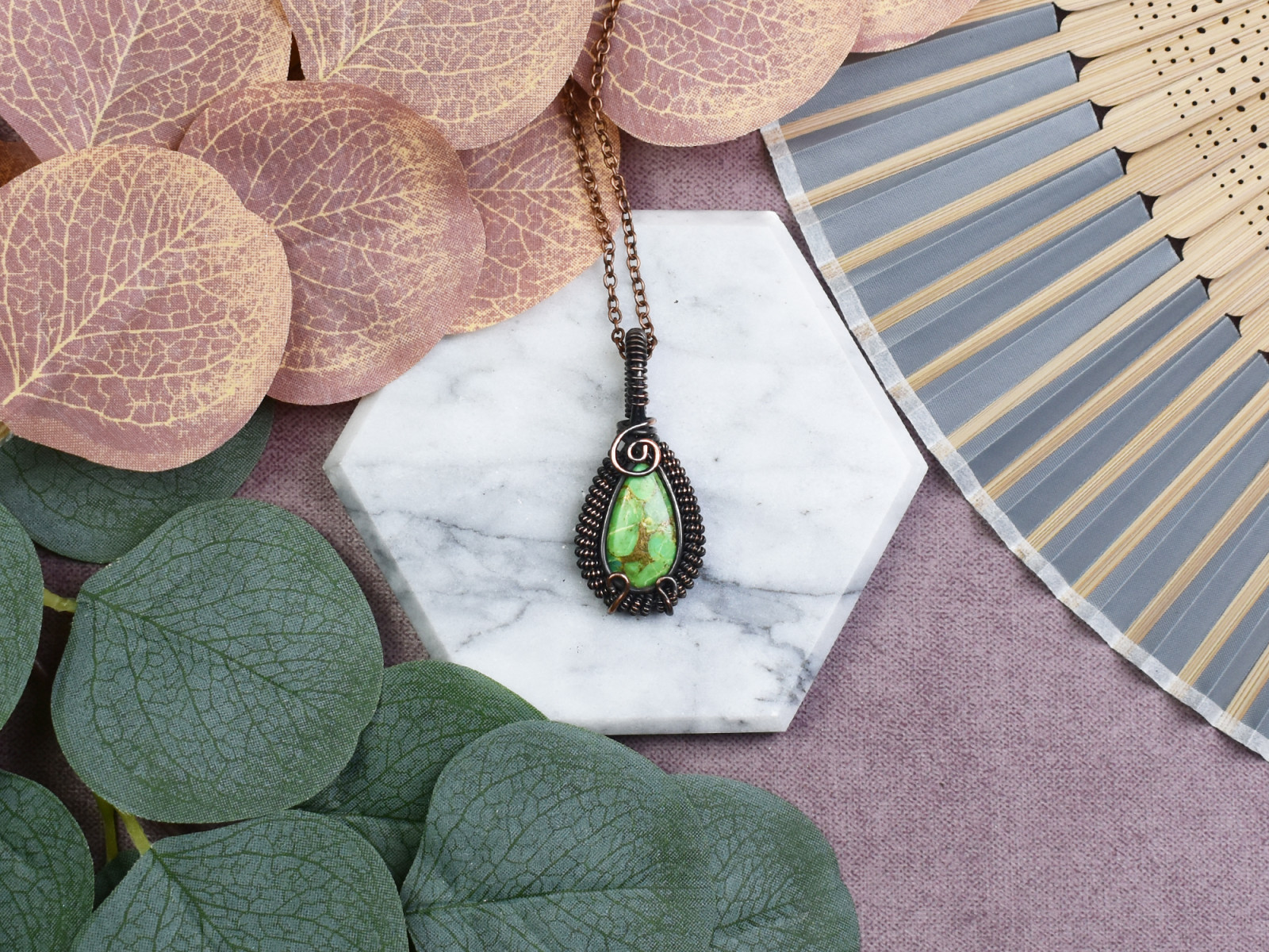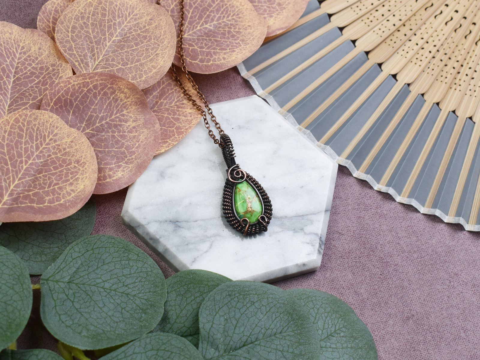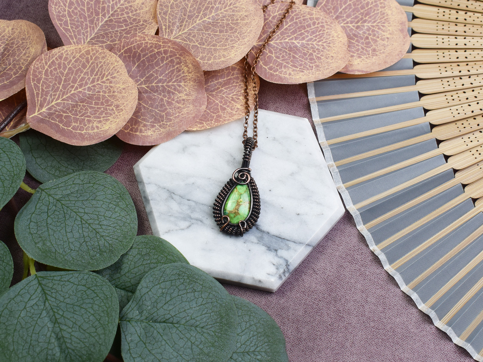 Miedziany wisiorek, ręcznie wykonany techniką wire wrapping, emanuje prostotą i naturalnym pięknem. Jego centralnym elementem jest kamień jaspis imperialny, znany również jako cesarski jaspis. Odpowiednio zawinięty drutem miedzianym, kamień ten emanuje ciepłymi odcieniami brązu, złota i zieleni, dodając wisiorkowi unikalnego uroku. To nie tylko biżuteria, lecz również wyraz sztuki rzemieślniczej, który wnosi do codziennego stylu subtelność i naturalny wdzięk.