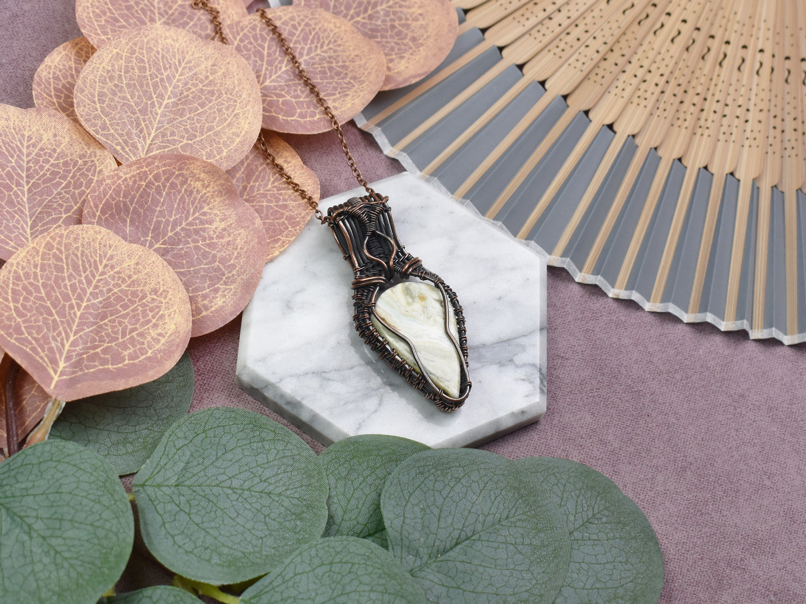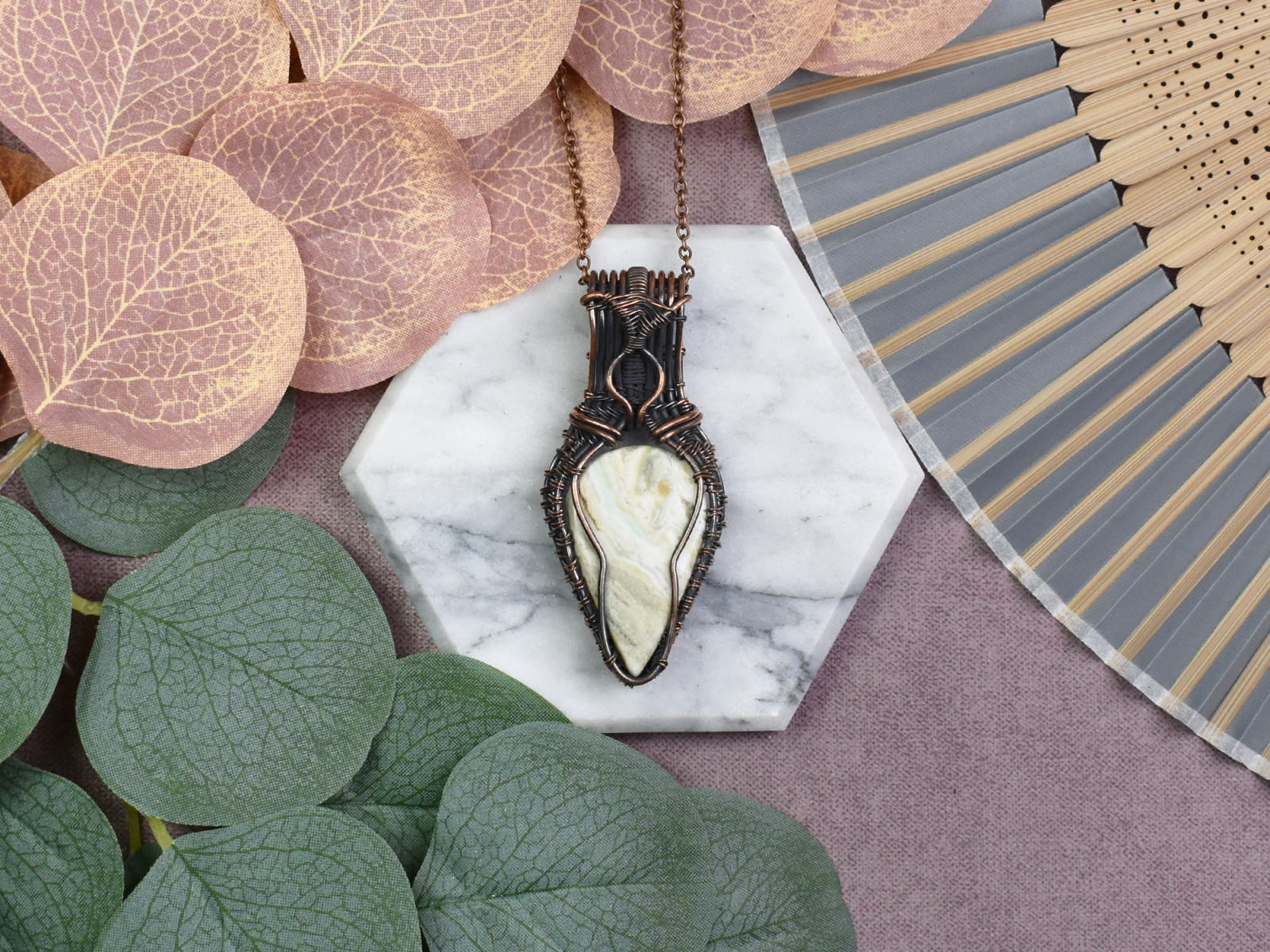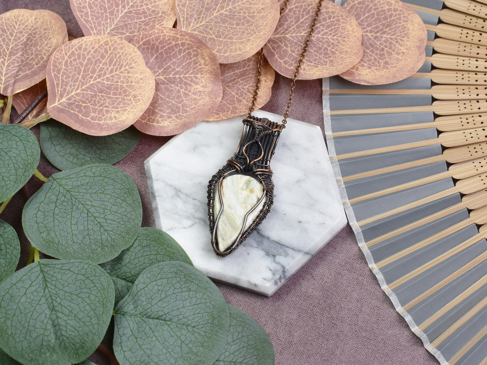 Miedziany wisiorek wire wrapping z larsonitem #539