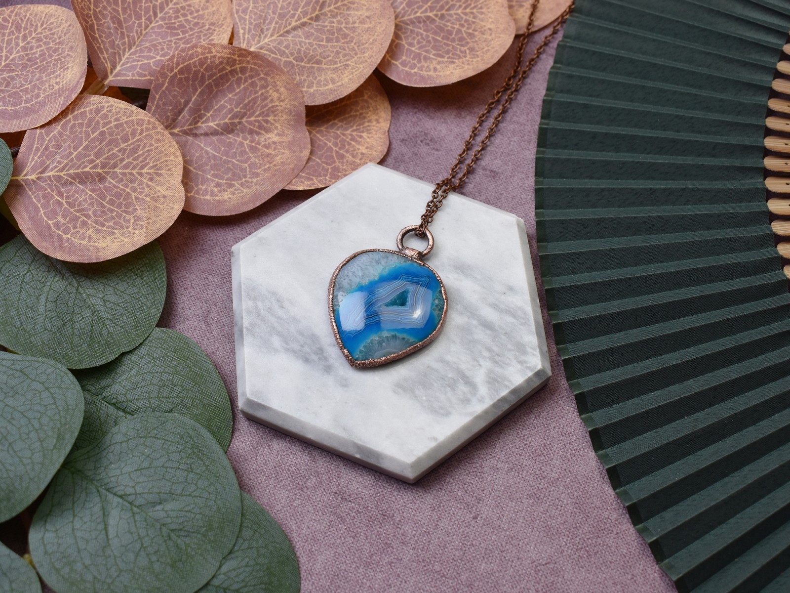 Ręcznie wykonany naszyjnik z niebieskim agatem z druzą. Oprawa wykonana z miedzi metodą elektroformowania, patynowana.