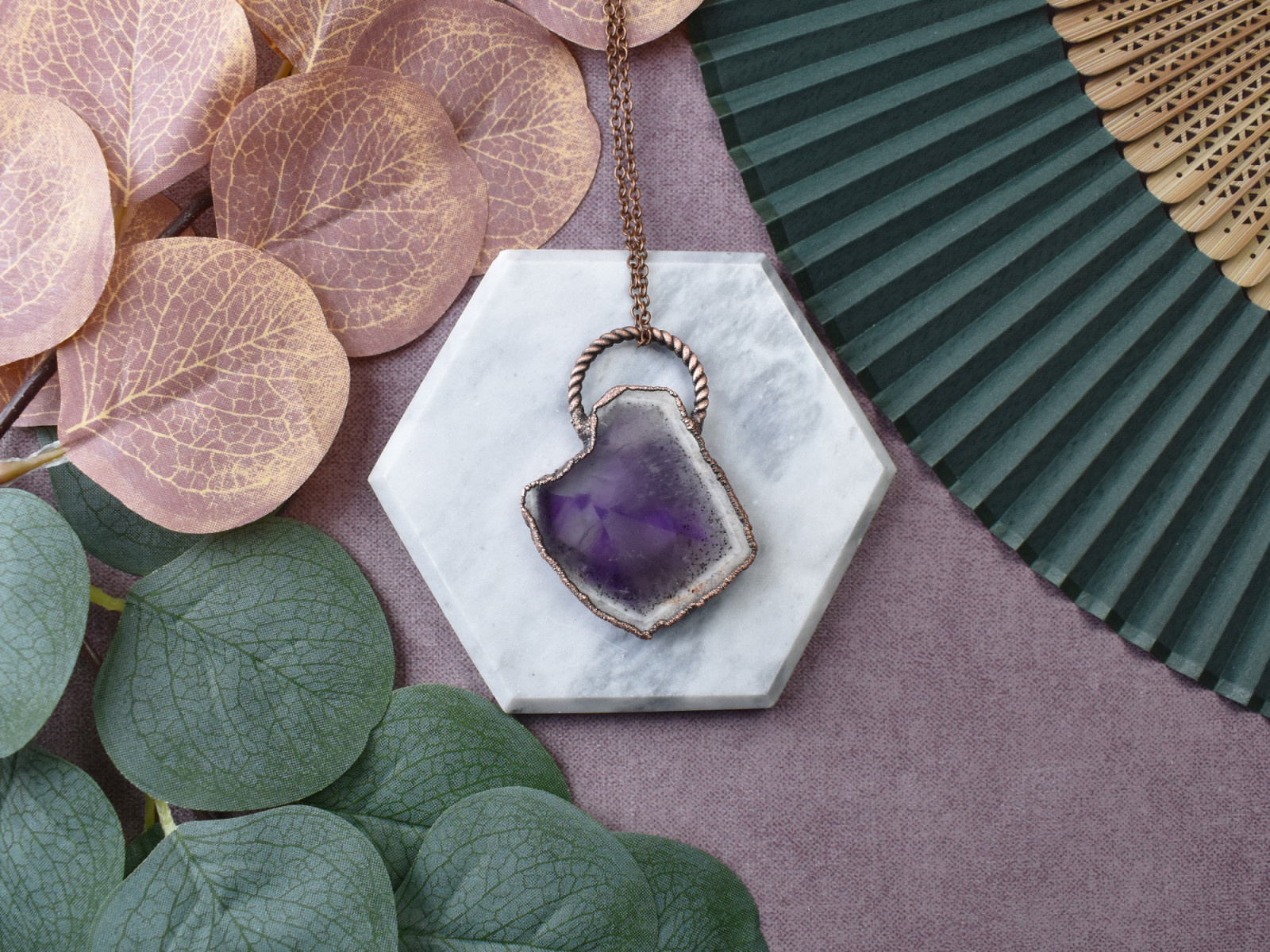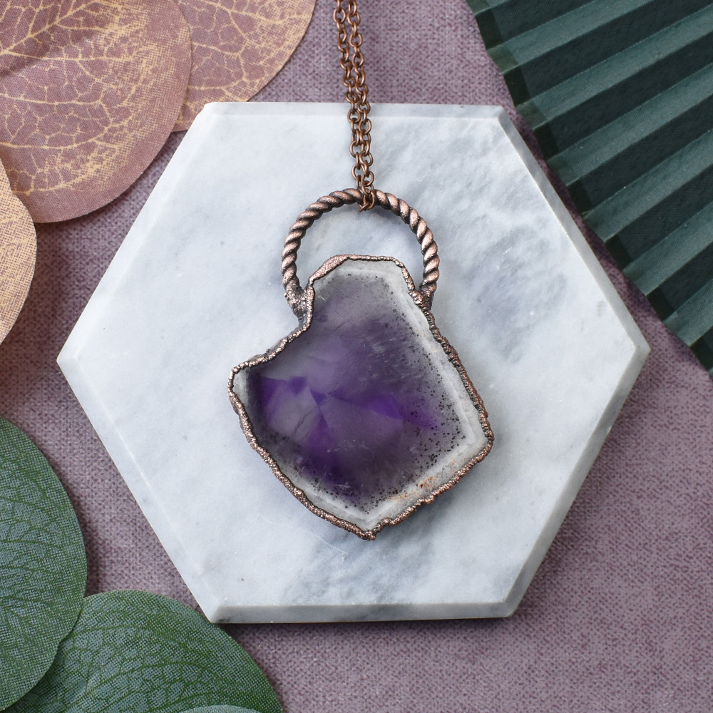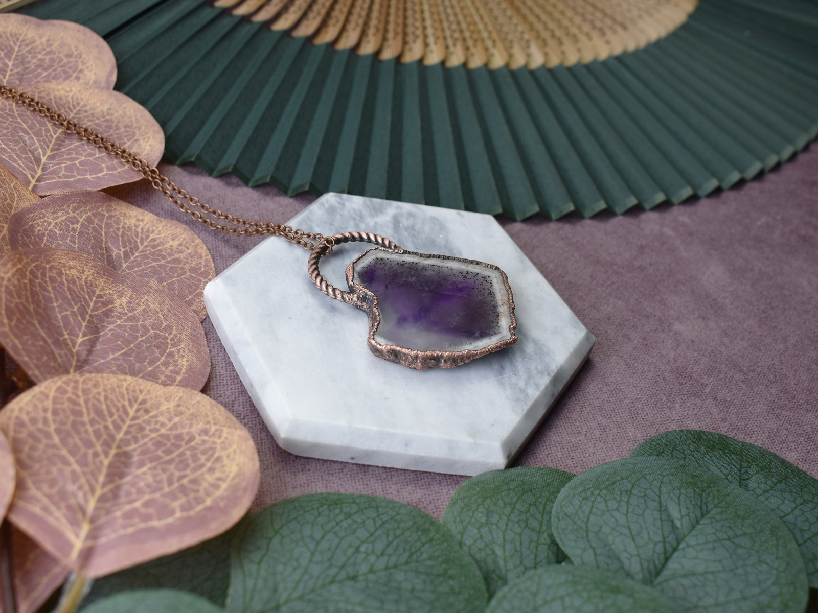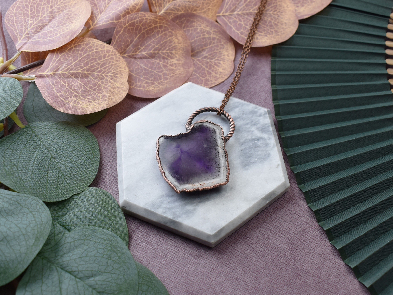 Ręcznie wykonany wisiorek z plastrem ametystu. Oprawa wykonana z miedzi metodą elektroformowania, patynowana.