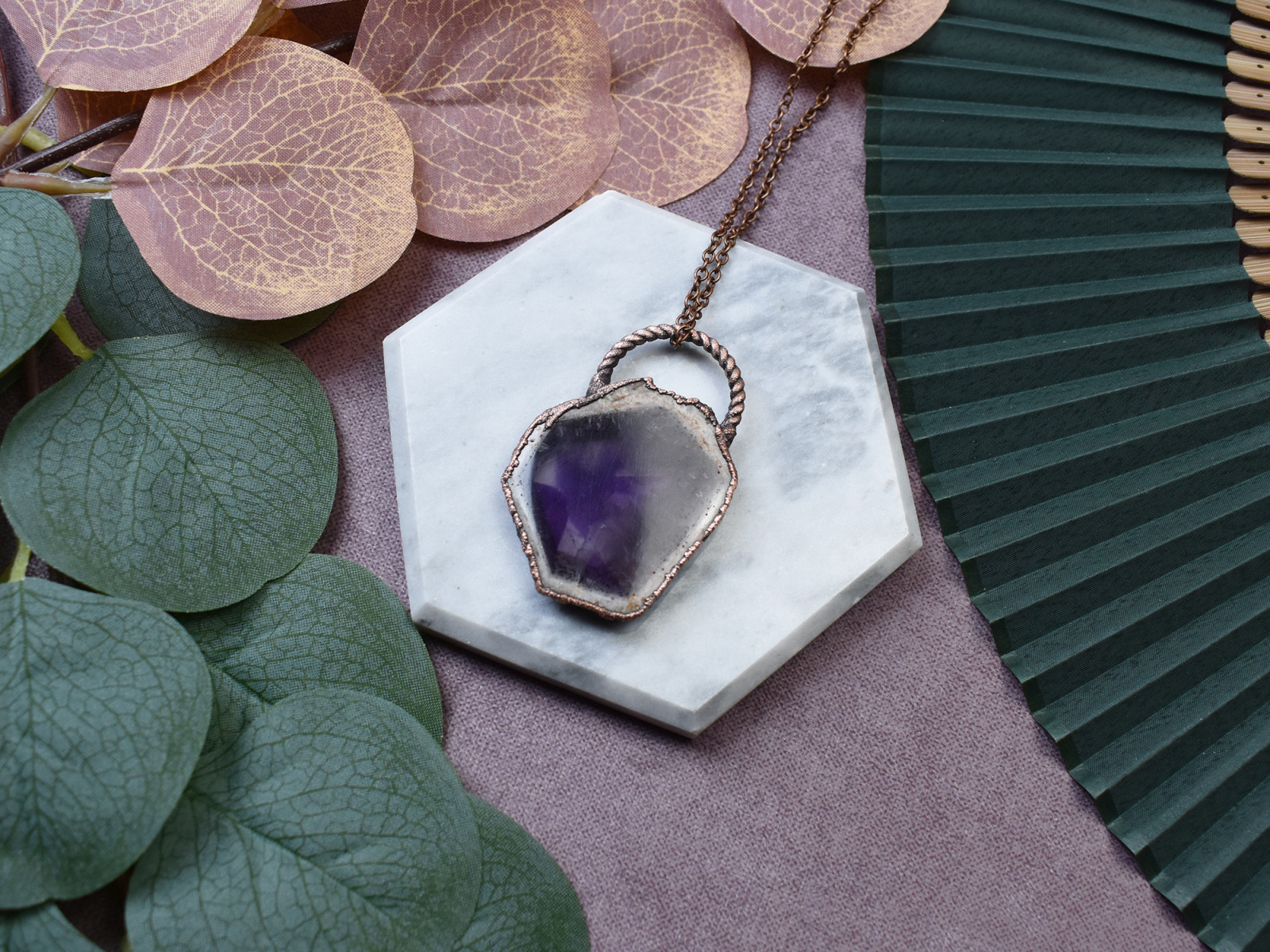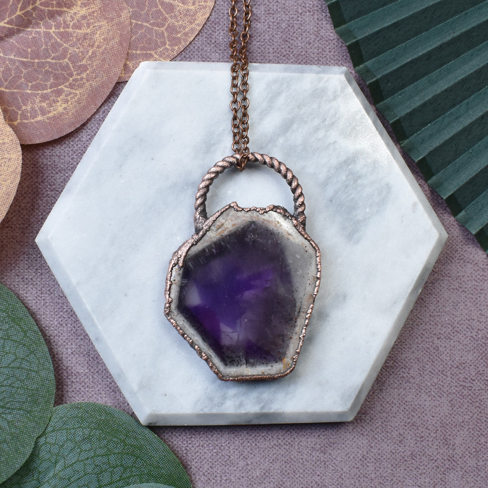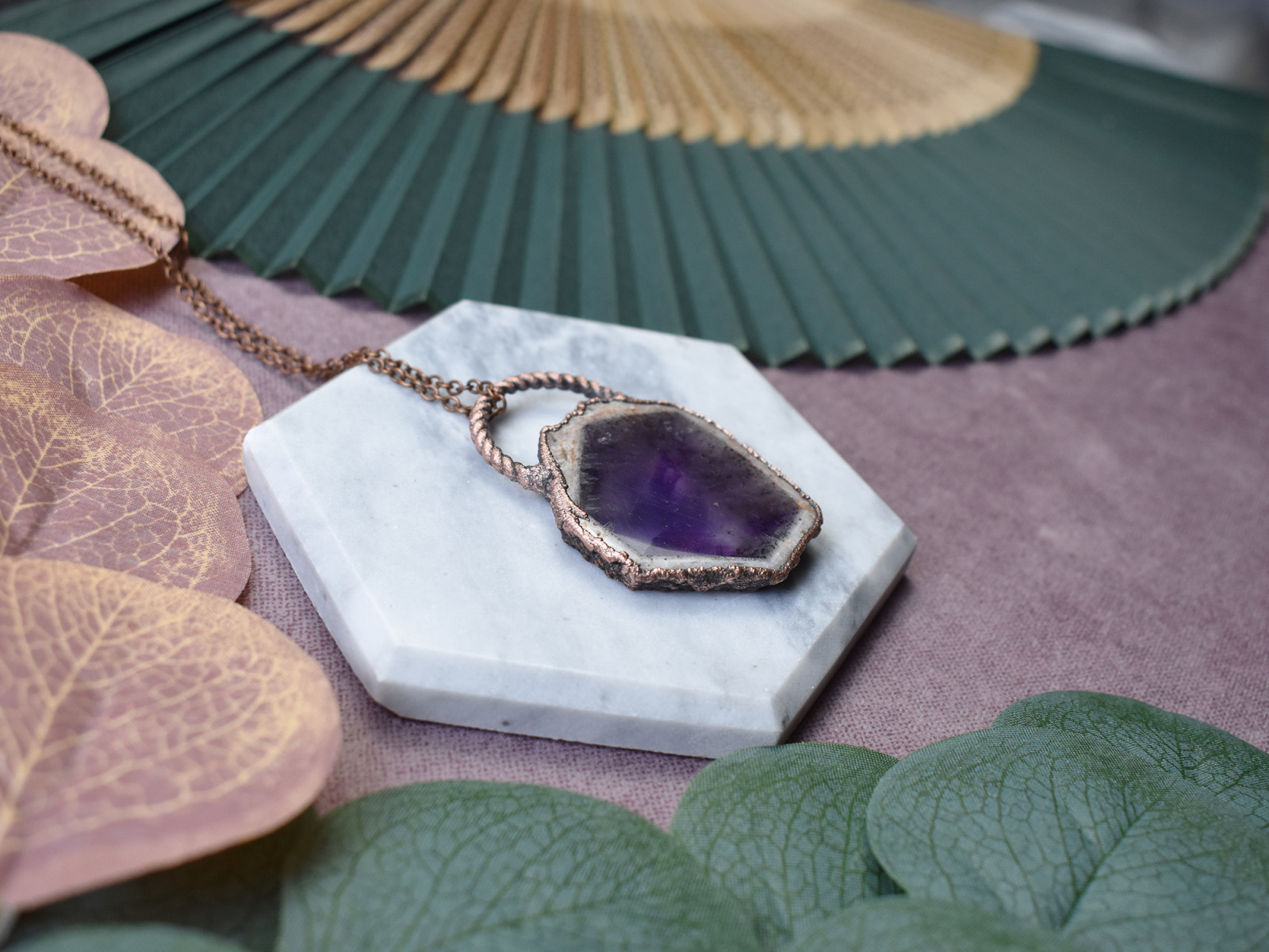 Ręcznie wykonany wisiorek z plastrem ametystu. Oprawa wykonana z miedzi metodą elektroformowania, patynowana.