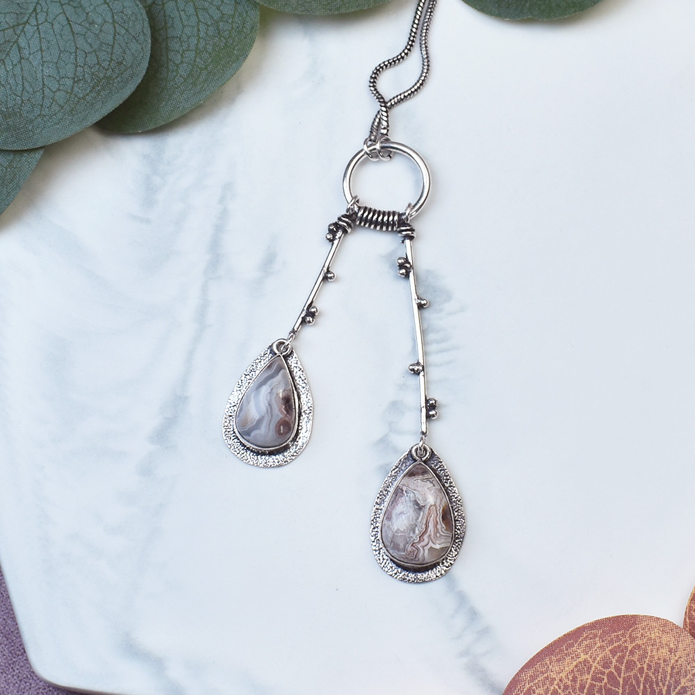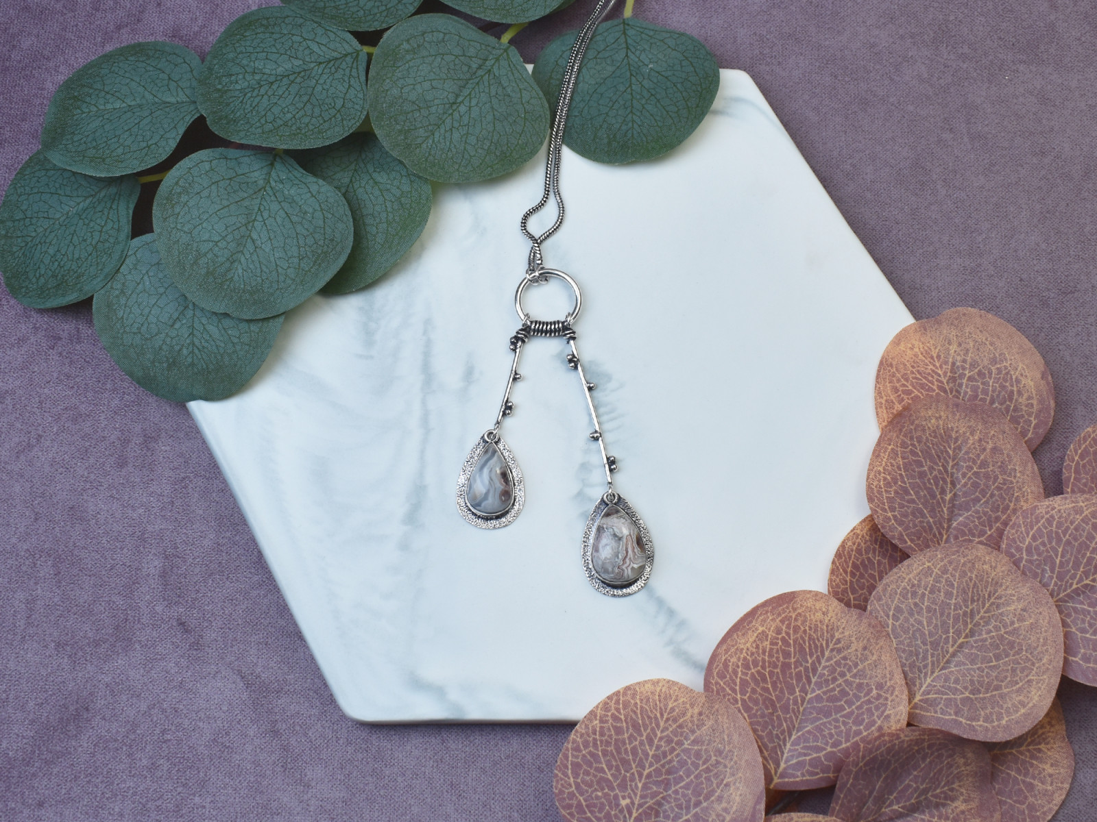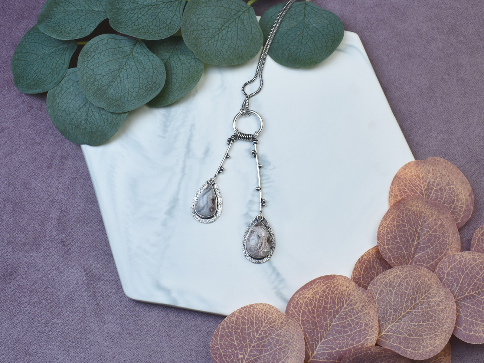 Miedziany wisiorek pokryty srebrem, wykonany tradycyjnymi metodami rzemieślniczymi, składający się z dwóch zawieszek ozdobionych agatem crazy lace. Kamień wyróżnia się dynamicznymi, naturalnymi wzorami oraz kontrastowym połączeniem ciepłych i ciemniejszych tonów, dzięki czemu każda zawieszka ma unikatowy charakter. Podwójna forma wisiorka nadaje całości lekkości i subtelnego ruchu, podkreślając dekoracyjny, a zarazem elegancki styl biżuterii. Agat crazy lace kojarzony jest z równowagą, pozytywną energią i witalnością, wprowadzając do projektu harmonijny, pełen życia akcent. Zestawienie wyrazistego rysunku kamienia z chłodnym, srebrzystym wykończeniem miedzi tworzy ponadczasowy i przyciągający uwagę wisiorek, idealny dla osób ceniących rękodzieło, naturalne minerały oraz biżuterię o wyrazistym, ale eleganckim charakterze.