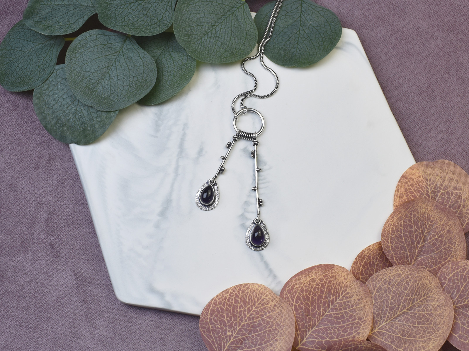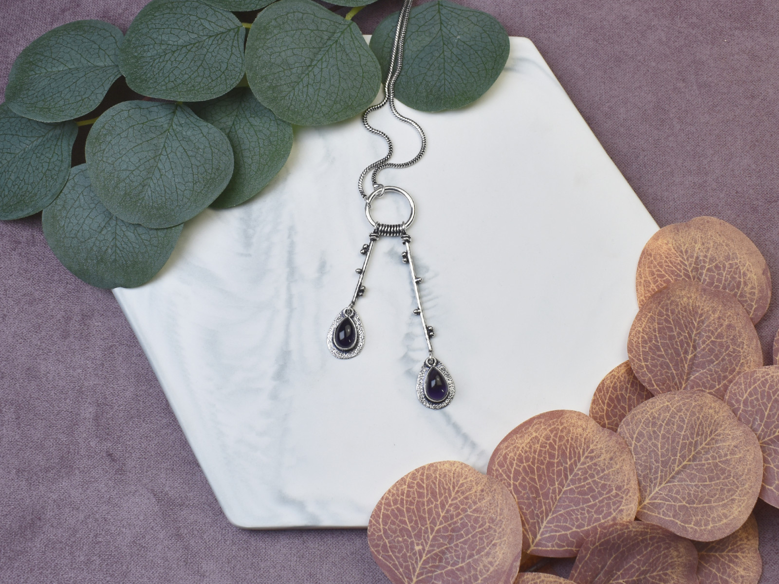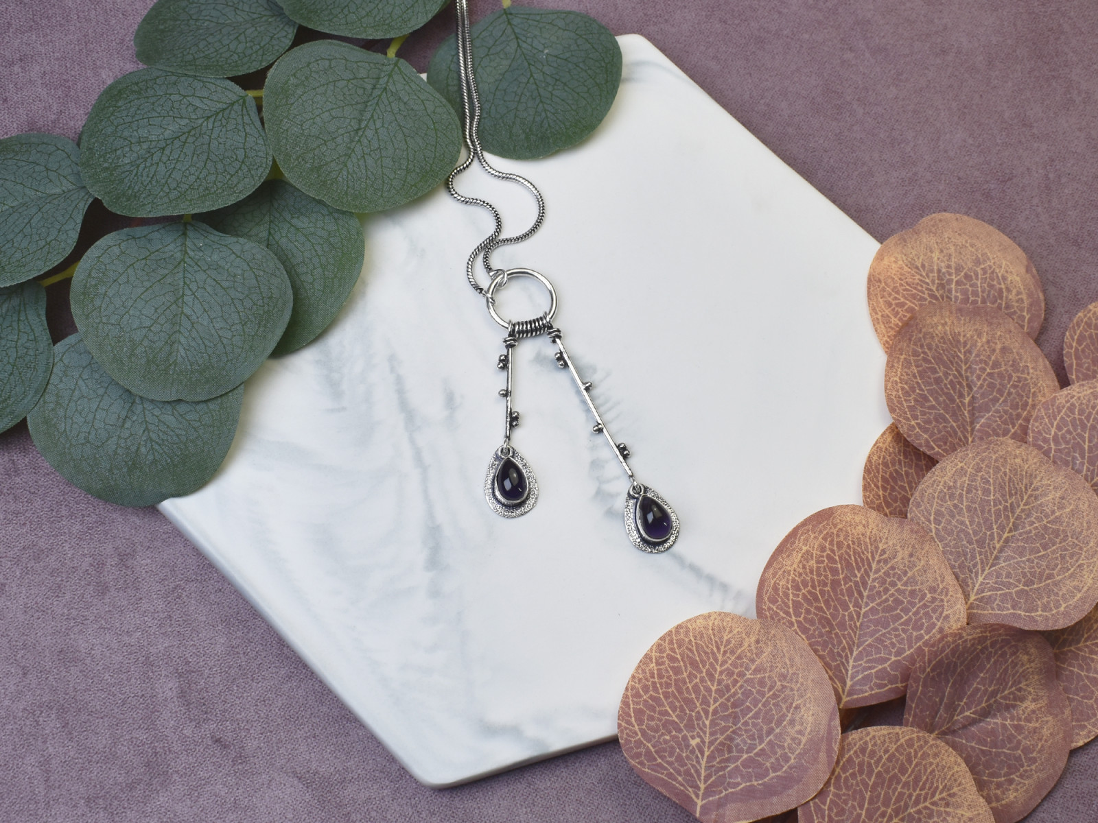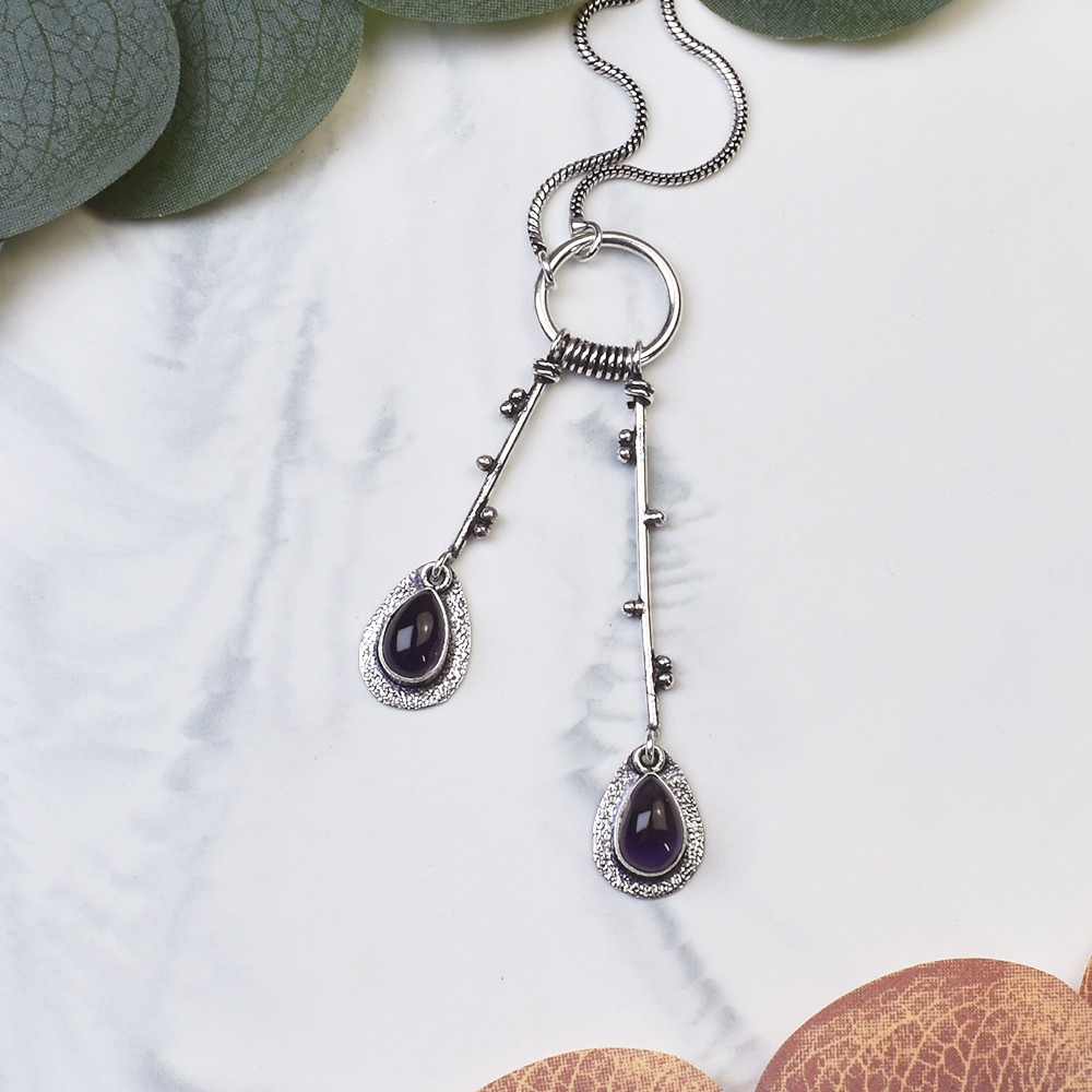 Miedziany wisiorek pokryty srebrem, wykonany tradycyjnymi metodami rzemieślniczymi, składający się z dwóch zawieszek ozdobionych ametystem. Kamień zachwyca głębokimi odcieniami fioletu oraz naturalnym połyskiem, który nadaje biżuterii szlachetnego charakteru. Podwójna forma wisiorka wprowadza lekkość i delikatny ruch, podkreślając elegancki i wyważony styl projektu. Ametyst od wieków kojarzony jest ze spokojem, harmonią i jasnością myśli, wspierając wyciszenie oraz wewnętrzną równowagę. Połączenie intensywnej barwy kamienia z chłodnym, srebrzystym wykończeniem miedzi tworzy ponadczasowy, subtelnie mistyczny wisiorek, idealny dla osób ceniących rękodzieło, naturalne kamienie i biżuterię o symbolicznym znaczeniu.