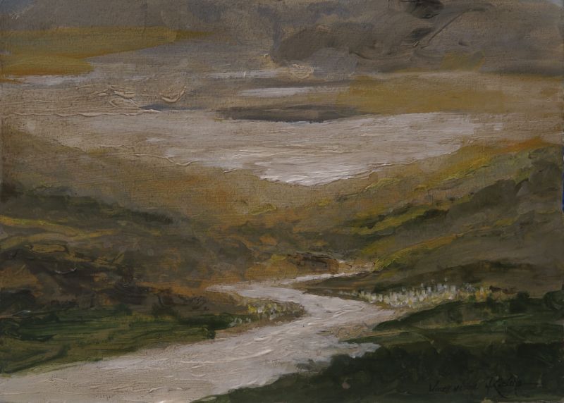 Pejzaż namalowany z wyobraźni - zapewne z tęsknoty za spokojem wieczornego światła i ciszą zbliżającego się zmierzchu.