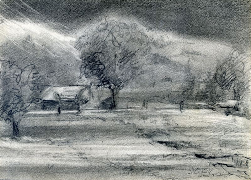 Nastrojowy rysunek przedstawiający nostalgiczny pejzaż, który jednak można i dziś wieczorną porą na wsi beskidzkiej zobaczyć. Ale trzeba wstrzymać oddech i pozwolić mgle roztoczyć wszędzie wieczorną ciszę.