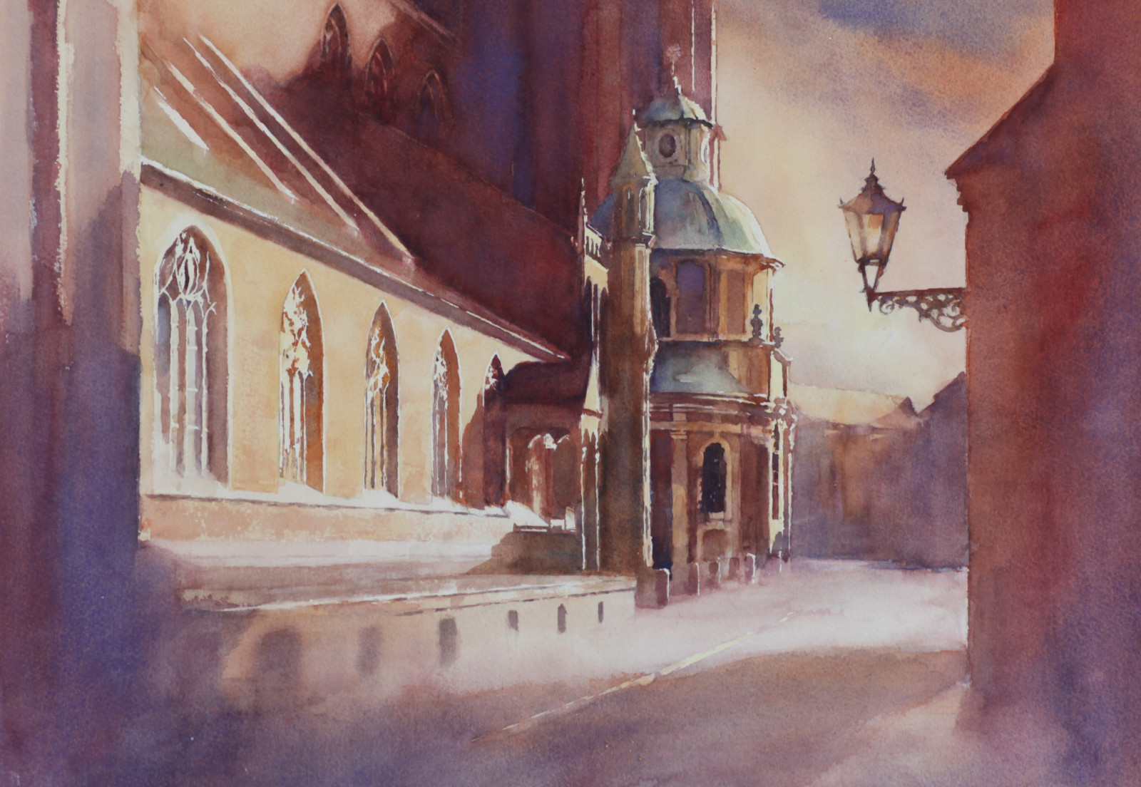 Katedra we Wrocławiu. Akwarela namalowana na papierze bawełnianym 425g/m2, oprawiona w passe-partout.