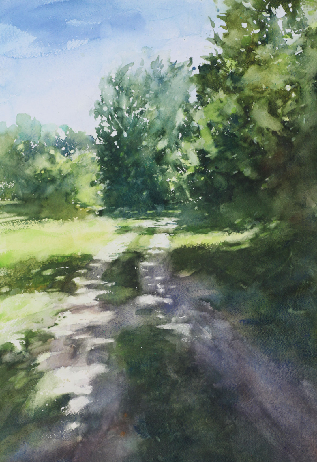Leśna droga w promieniach letniego słońca. Akwarela namalowana na papierze bawełnianym 300 g/m2, oprawiona w passe-partout, sygnowana.