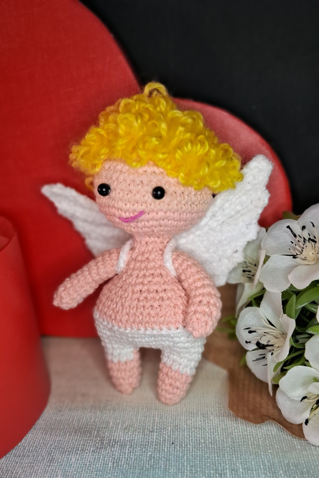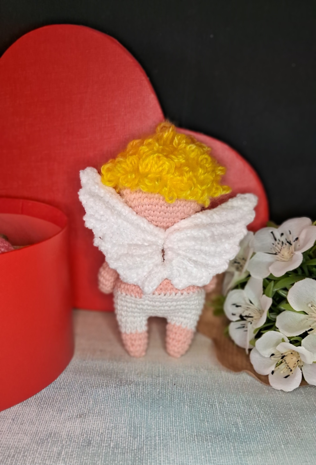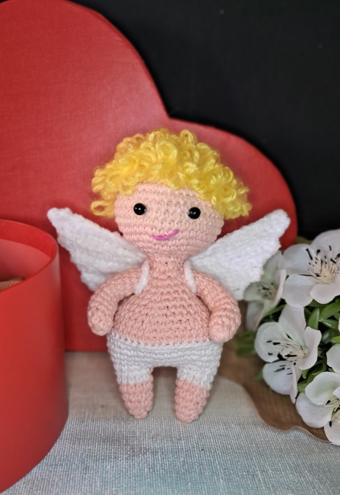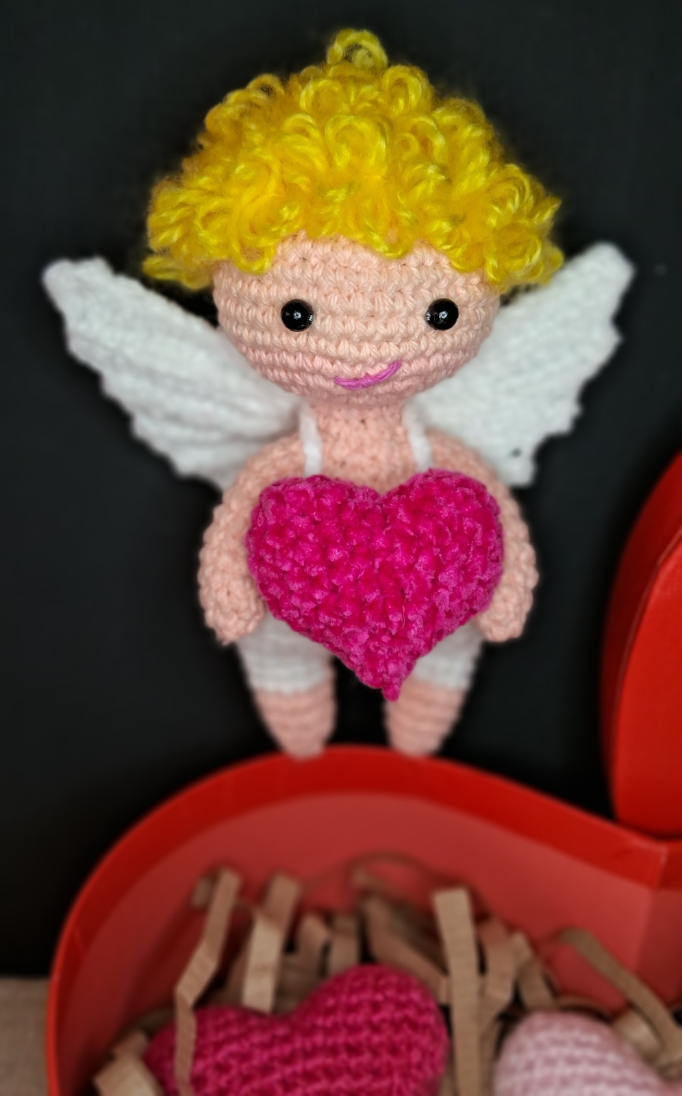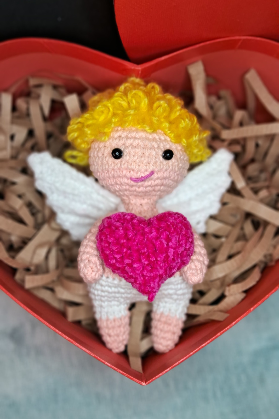 Kupidyn walentynka amigurumi na szydełku, ręcznie robiony + pudełko prezentowe i wypełniacz dekoracyjny.