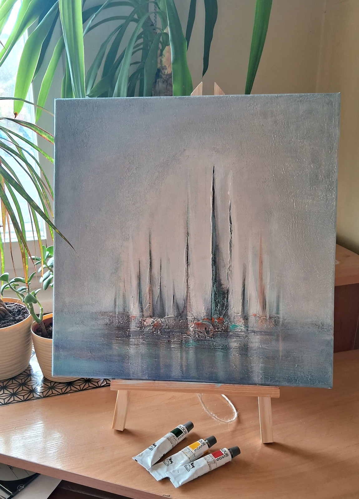 Obraz na płótnie ręcznie malowany akrylami strukruralny abstrakcja Żaglówki 40x40