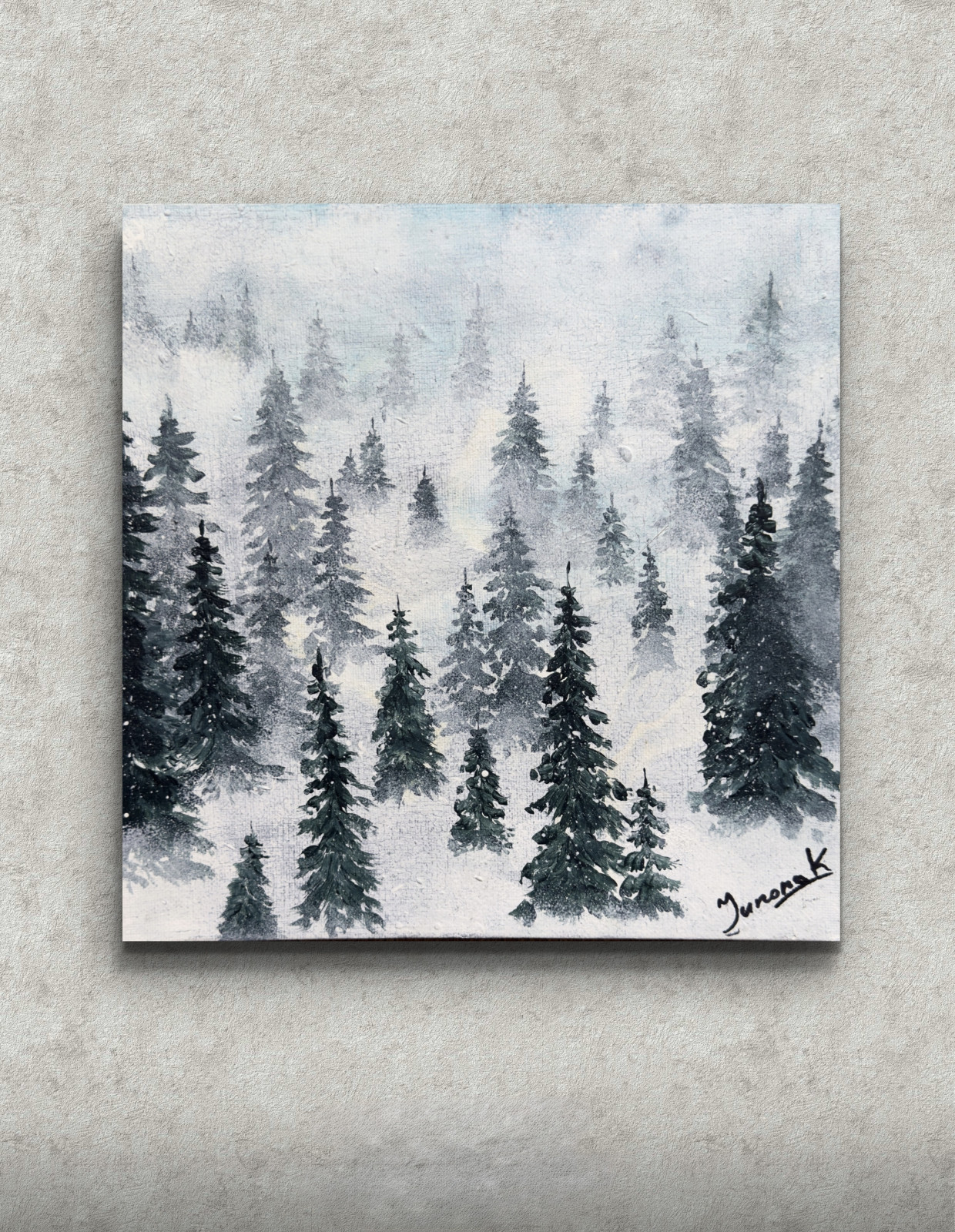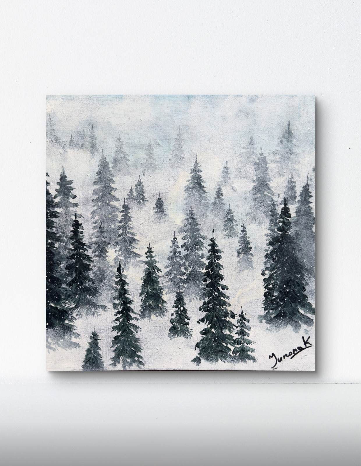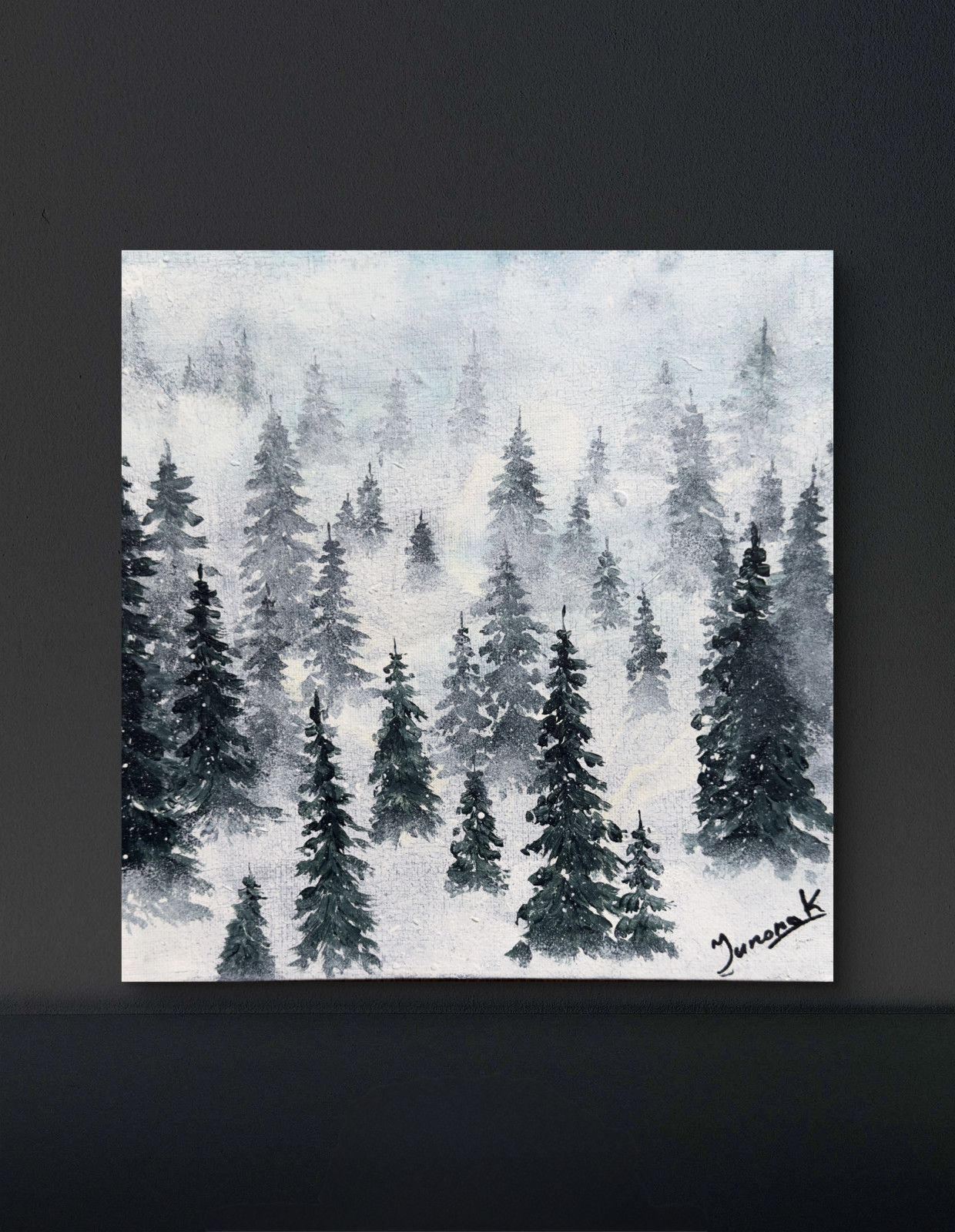 Obraz „Choinki we mgle” został namalowany farbami akrylowymi i przedstawia delikatnie zarysowane sylwetki drzew iglastych spowitych miękką, tajemniczą mgłą. Subtelne przejścia tonalne oraz stonowana paleta barw tworzą spokojny, nastrojowy klimat, który wprowadza do wnętrza harmonię i lekko zimowy, leśny charakter. To idealna dekoracja dla osób ceniących naturę, minimalizm i atmosferę ciszy.