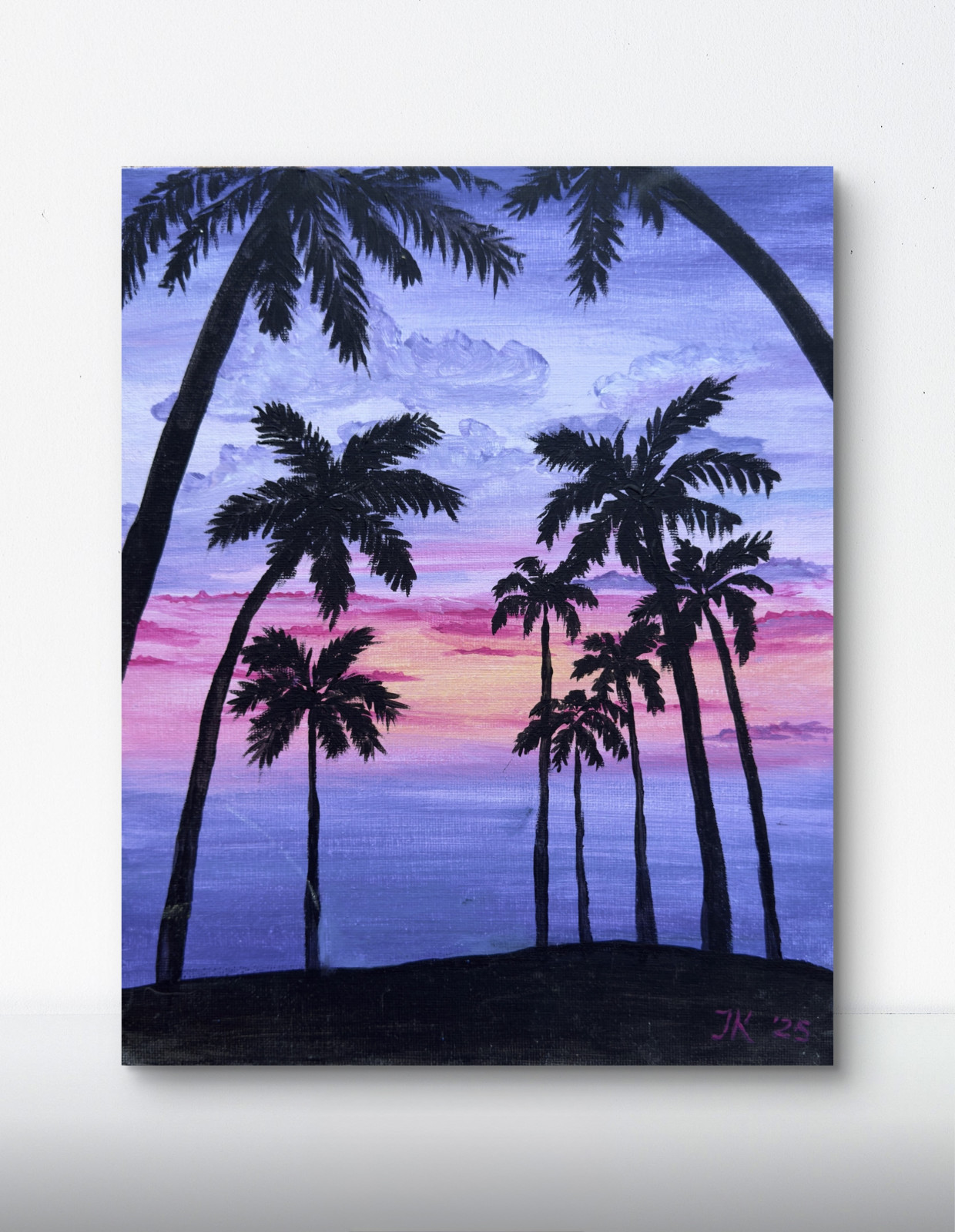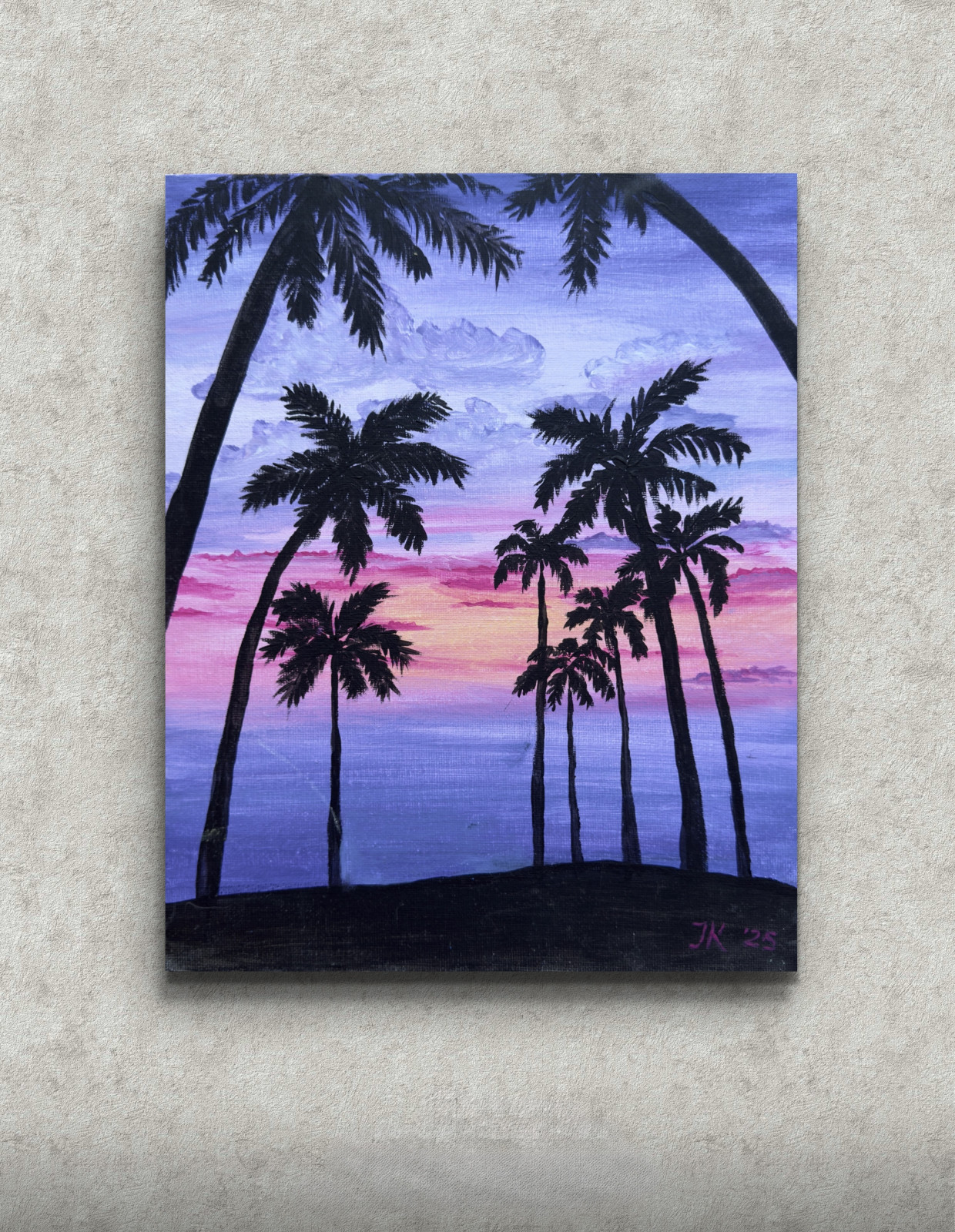 Obraz „Palmy o zachodzie słońca” został namalowany farbami akrylowymi na płótnie o wymiarach 24 × 30 cm. Przedstawia sylwetki palm na tle ciepłego, rozświetlonego nieba, w którym barwy zachodu słońca płynnie przechodzą od złotych tonów po głębokie odcienie pomarańczu i różu. Kompozycja emanuje spokojem, wakacyjną atmosferą i ciepłem tropikalnego krajobrazu, tworząc idealną dekorację do wnętrz w stylu nowoczesnym, boho lub nadmorskim.