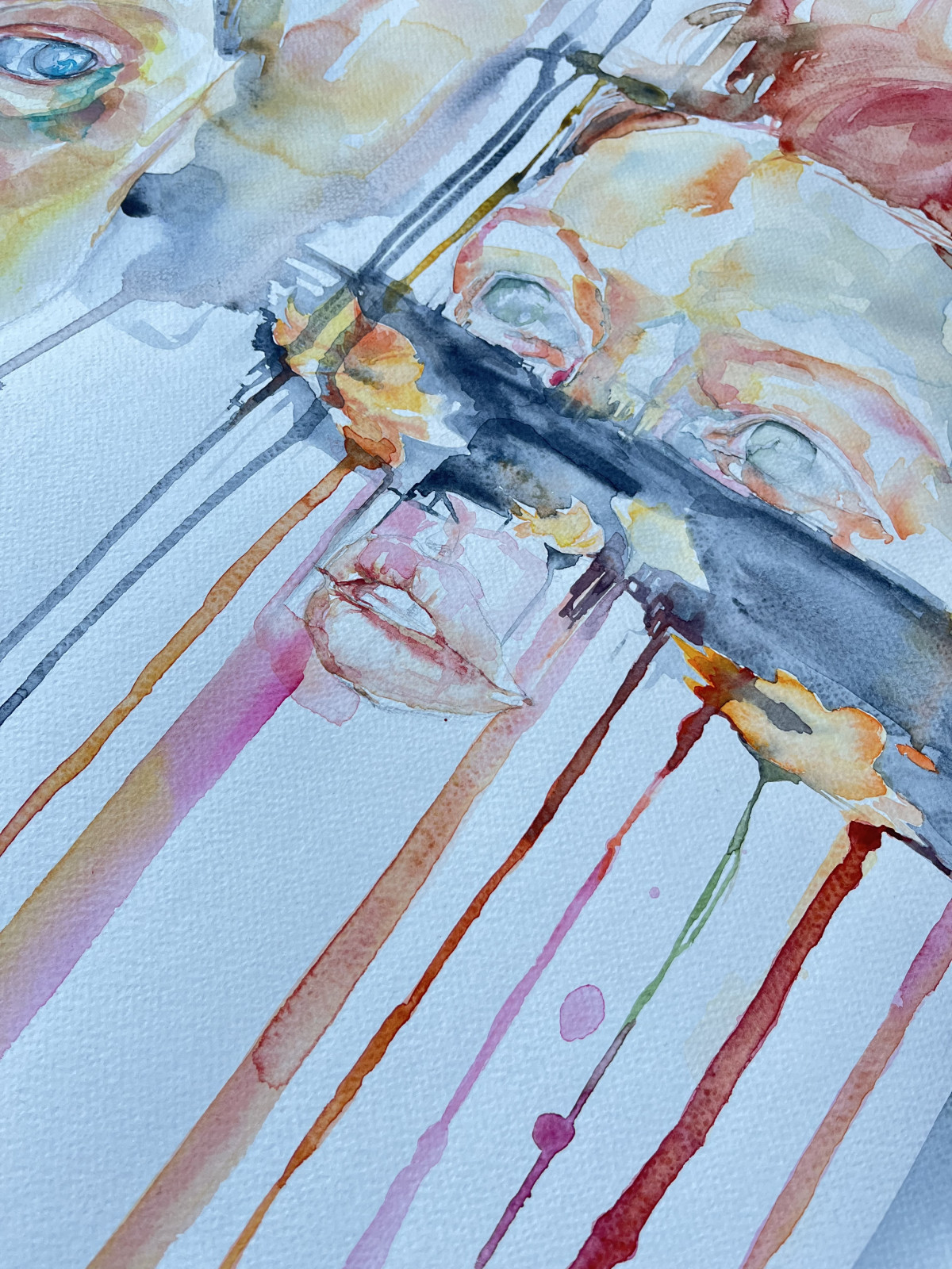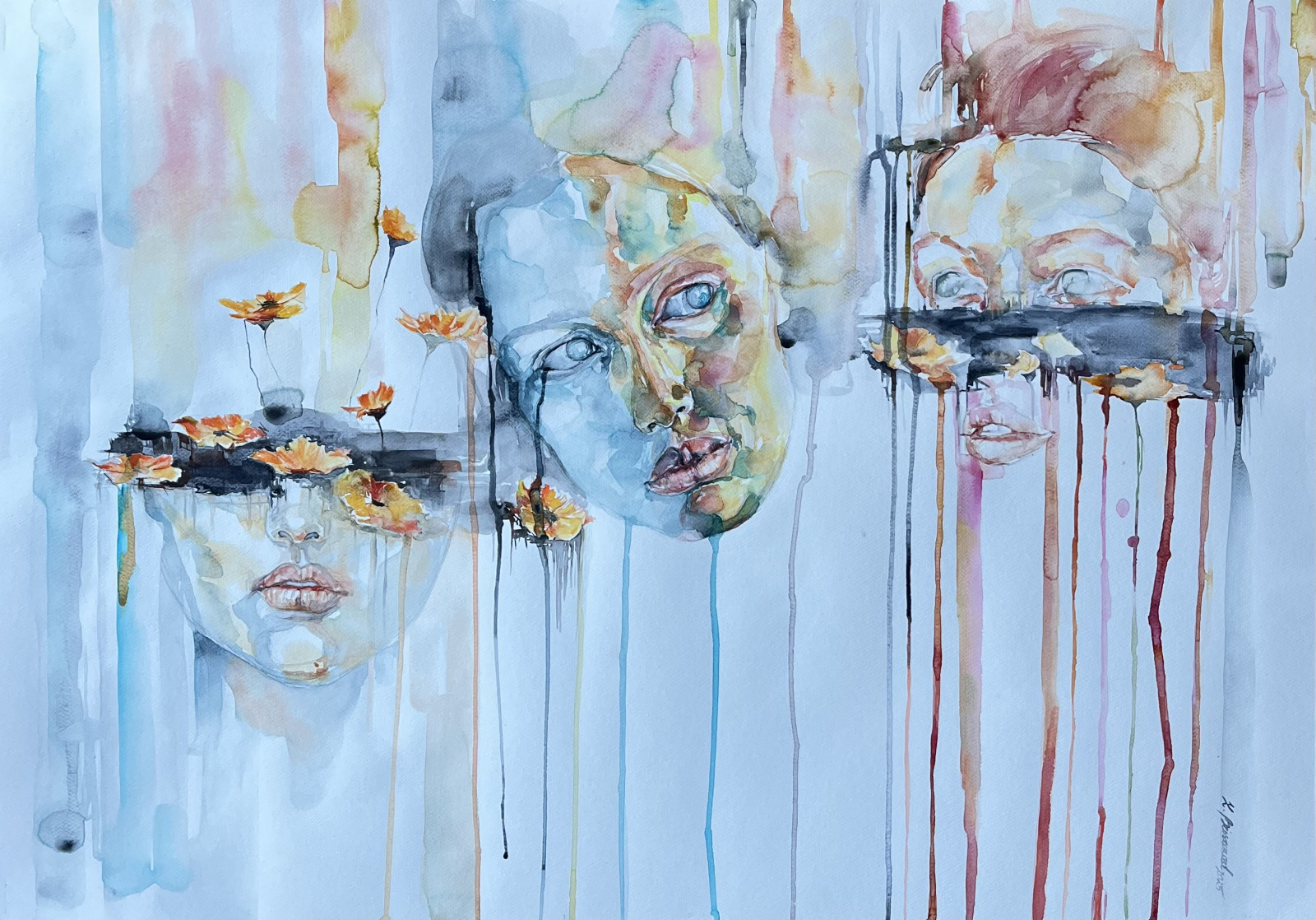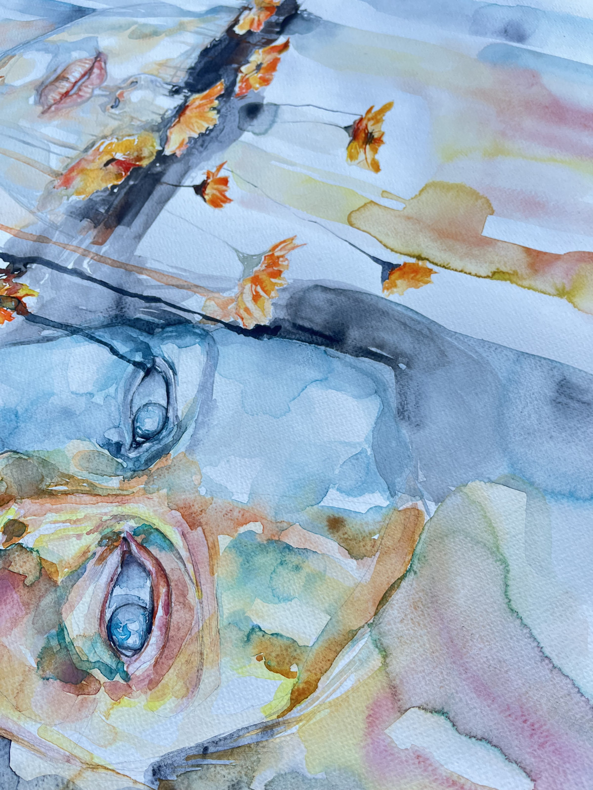 Obraz Kobieta - Jesień, wykonany na białym papierze do akwareli Fabriano o wymiarach 100 cm x 70 cm, o gramaturze 300 g/m2, namalowany farbami akwarelowymi Rembrandt, praca sygnowana, oryginał, sprzedawana bez ramy, wysyłka pocztą, bezpiecznie zapakowana.