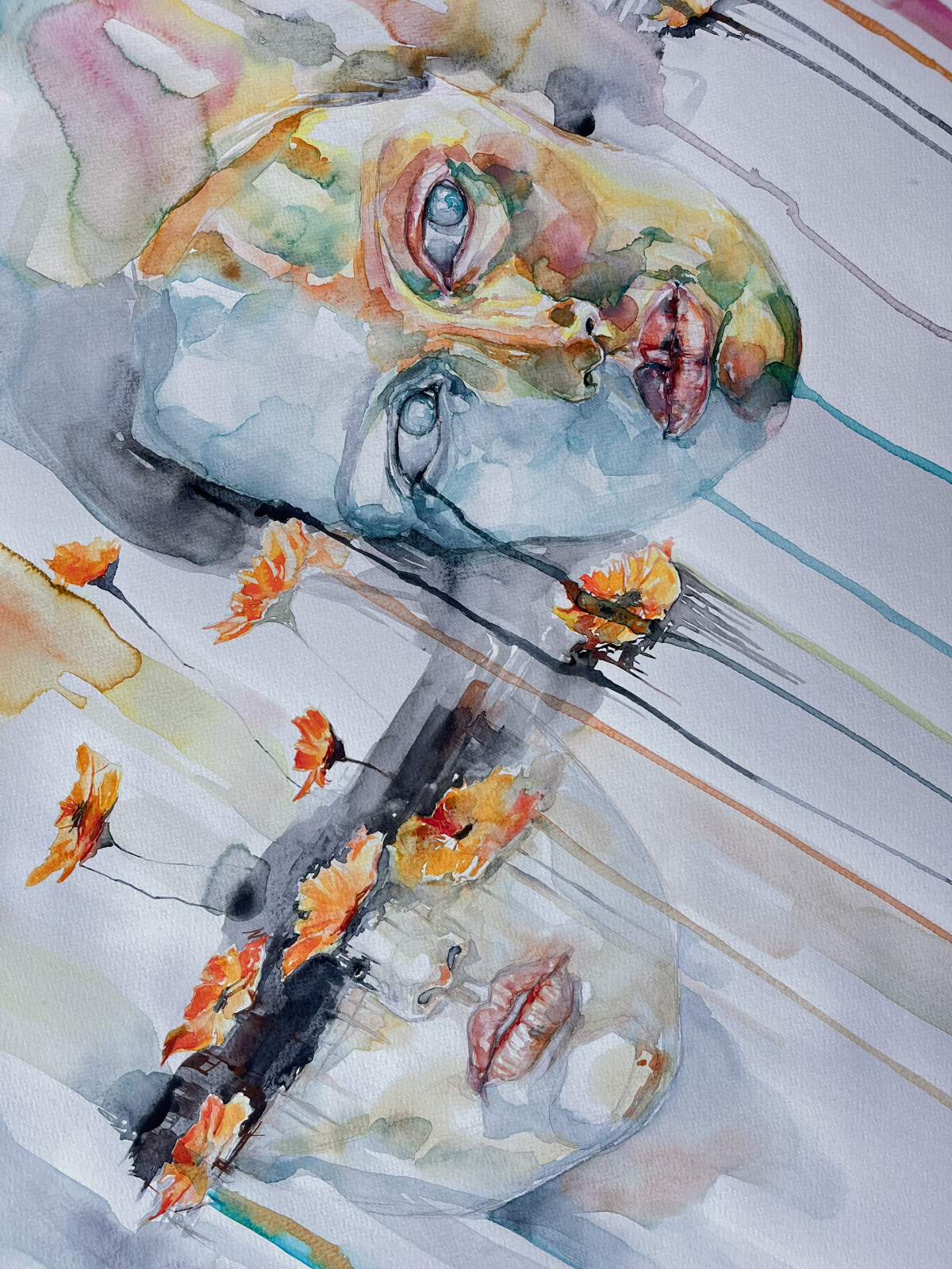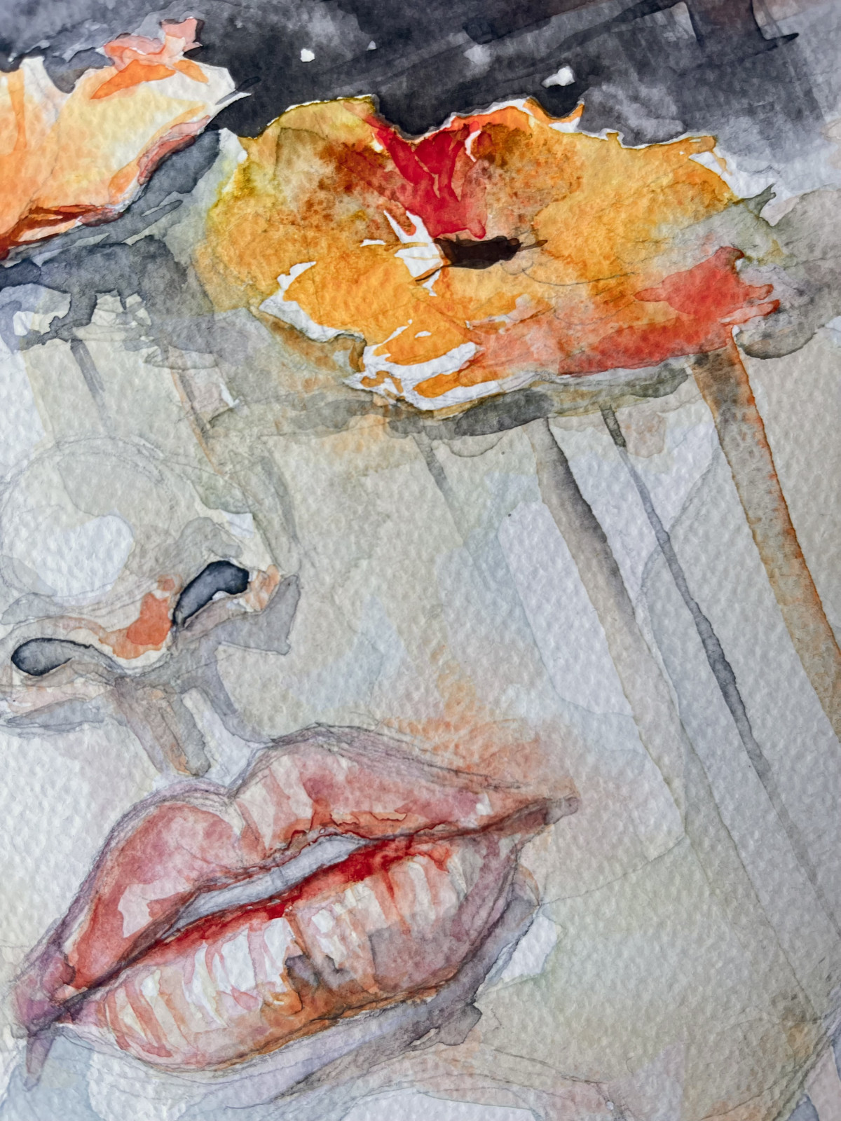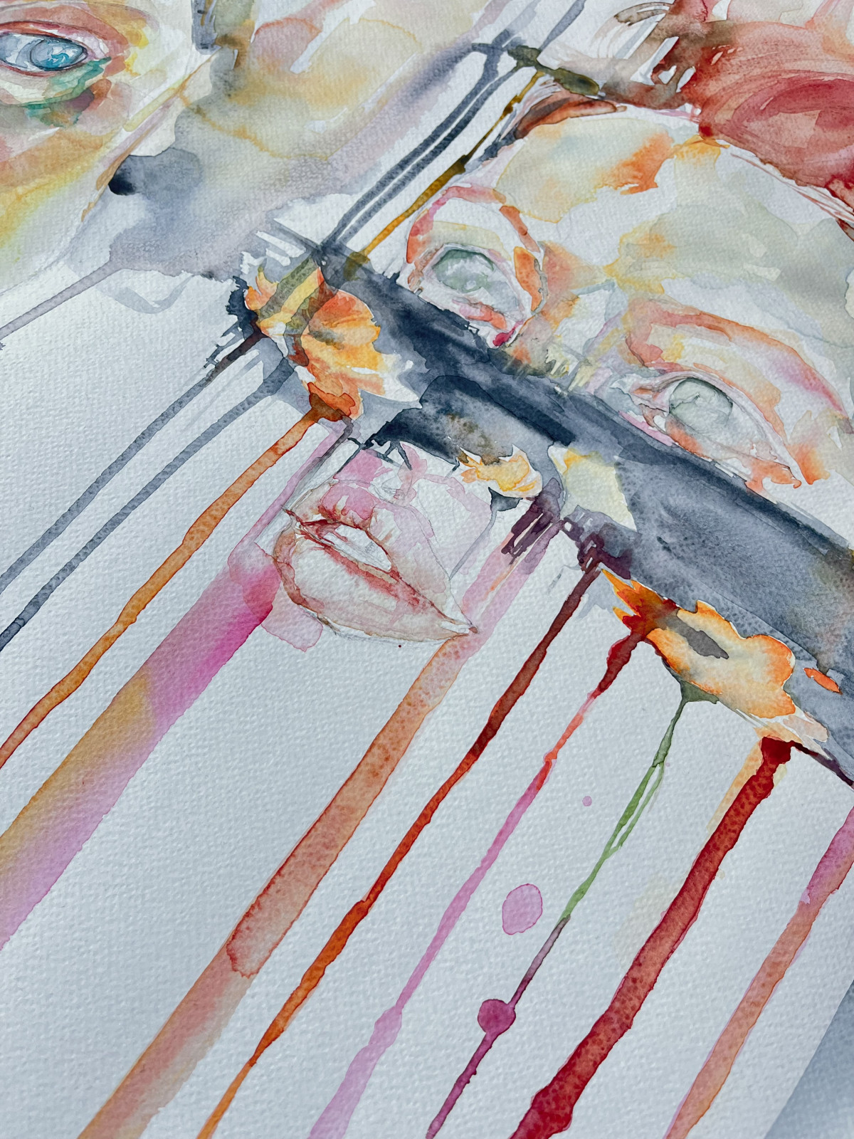 Obraz Kobieta - Jesień, wykonany na białym papierze do akwareli Fabriano o wymiarach 100 cm x 70 cm, o gramaturze 300 g/m2, namalowany farbami akwarelowymi Rembrandt, praca sygnowana, oryginał, sprzedawana bez ramy, wysyłka pocztą, bezpiecznie zapakowana.