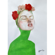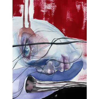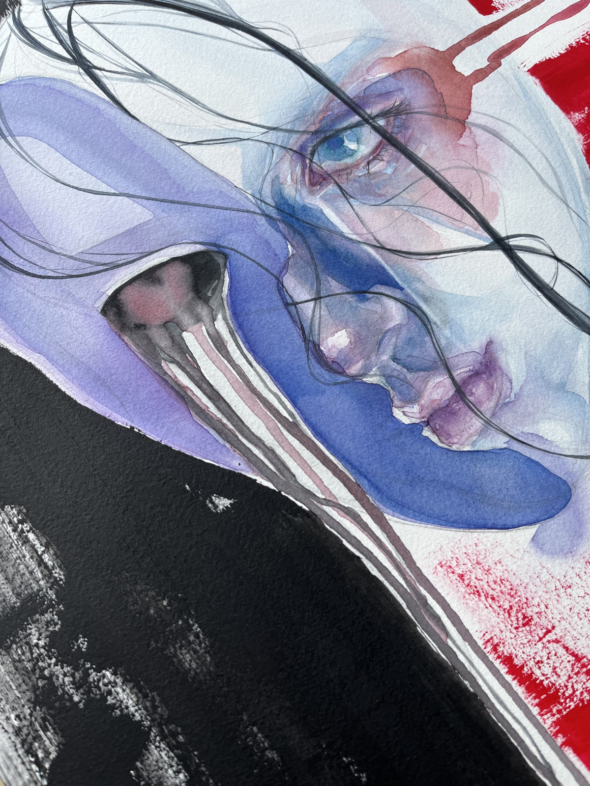 Portret Kobieta w masce, wykonany na białym papierze do akwareli Hahnemühle prasowanym na zimno, o wymiarach 36 cm x 48 cm, o gramaturze 300 g/m2, namalowany techniką mieszaną (farby akwarelowe Rembrandt, farby akrylowe), praca sygnowana, oryginał, sprzedawana bez ramy, wysyłka pocztą, bezpiecznie zapakowana.